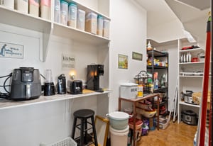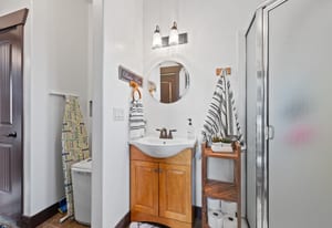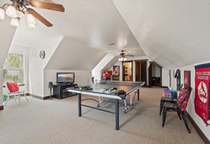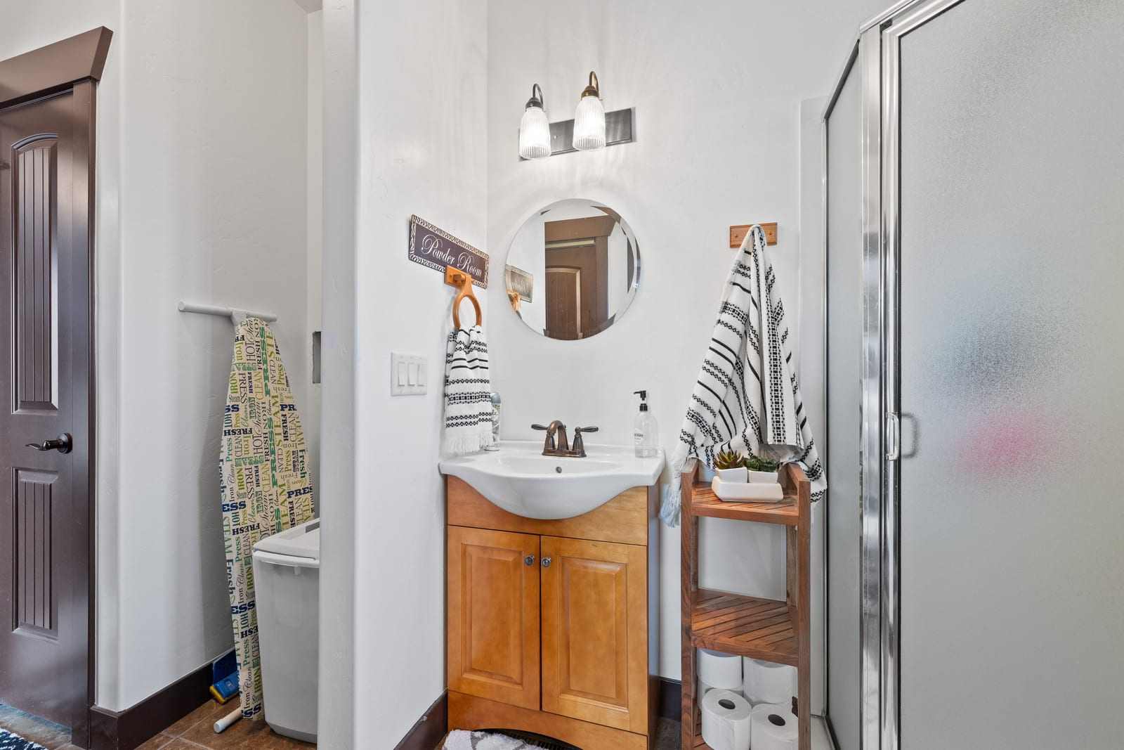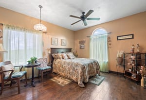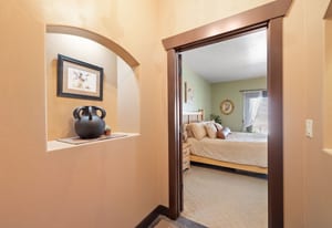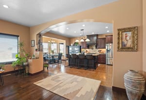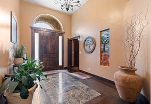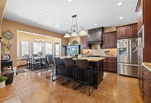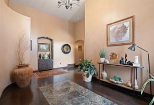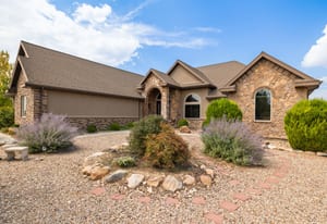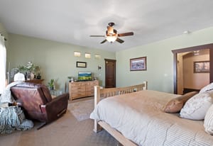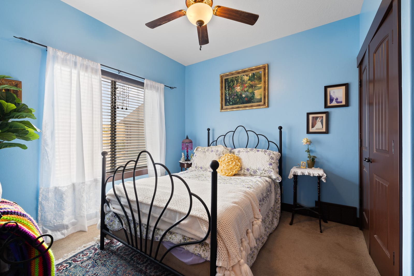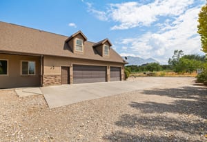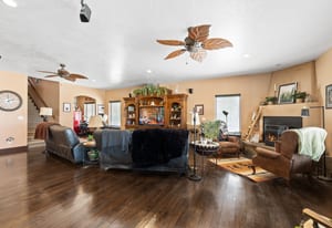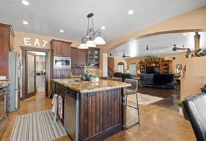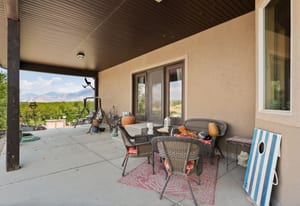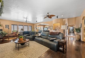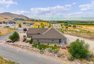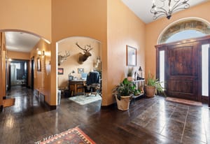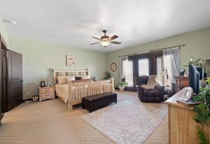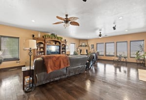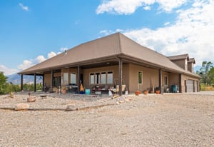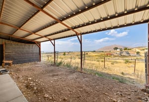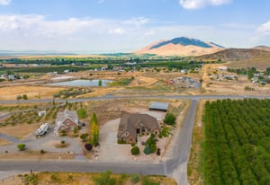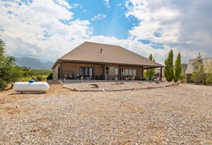 Welcome to this stunning custom Santa Fe–style estate on 2.5 acres in Genola, offering breathtaking valley views and true country living with modern comfort. Designed with both functionality and charm, this property is ideal for horse enthusiasts and those seeking space to live, work, and play. The 48'x64' metal barn is fully equipped with water and power, making it a perfect fit for housing animals or recreational toys. Inside, soaring ceilings reach 14 feet in the entry and office, with 9-foot ceilings throughout the rest of the home. The open-concept floor plan flows seamlessly into a spacious kitchen featuring double-thick granite countertops, custom tile backsplash, an oversized island, and a remarkable 5'x17' walk-in pantry complete with counters and outlets for small appliances. Cozy reading and art rooms adjoin the main living space, anchored by a custom Santa Fe–style fireplace with a pellet stove that can serve as an additional heat source. The extra-large primary suite offers custom granite and tile finishes as well as a generous walk-in closet. A private casita with its own entry, kitchenette, three-quarter bath, and laundry hookups provides a comfortable mother-in-law or guest suite. Upstairs, a nearly 700-square-foot bonus room with two large storage closets and its own half bath provides flexible space for work, play, or entertaining. The oversized 28'x40' garage is fully finished and features a deep sink, storage closet, and a mudroom with adjoining half bath. Beautiful flooring throughout the home includes hardwood, tile, marble, and carpet, all complementing the custom details. Expansive wraparound covered patios measuring 14'x74' creates the perfect space for entertaining while enjoying the mountain and valley views. If country living with modern convenience is what you love, this beautifully designed custom home is truly one of a kind. Square footage figures are provided as a courtesy estimate only and were obtained from an appraisal sketch. Buyer is advised to obtain an independent measurement.