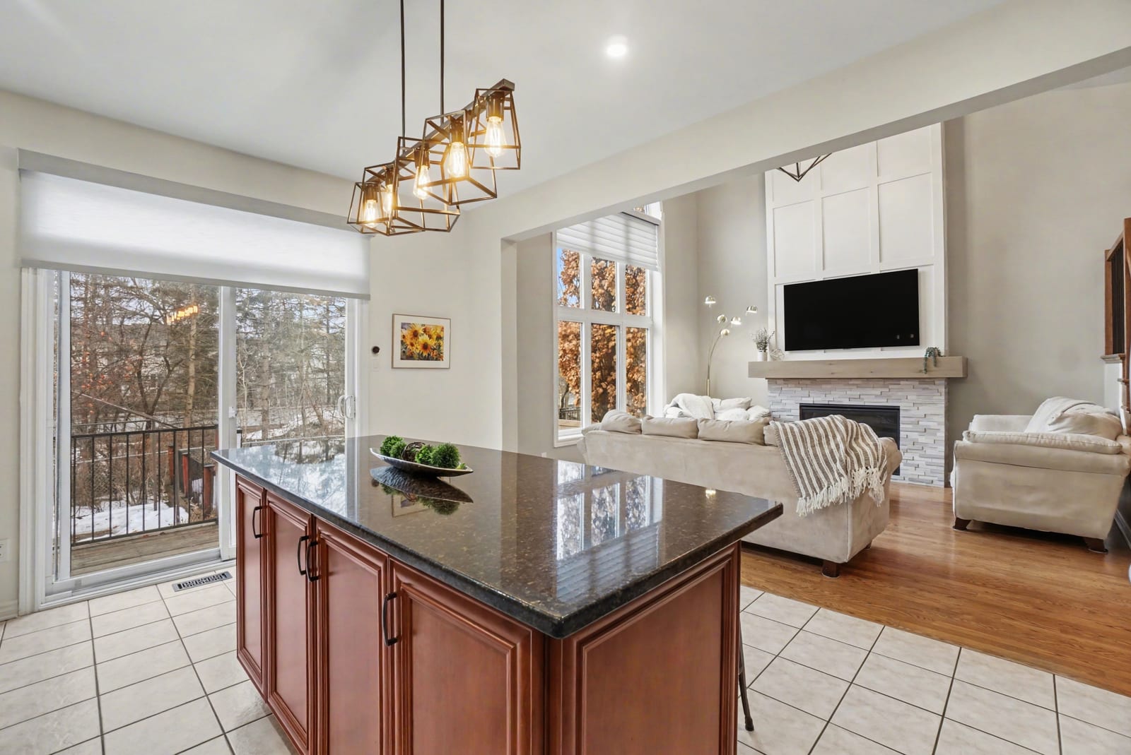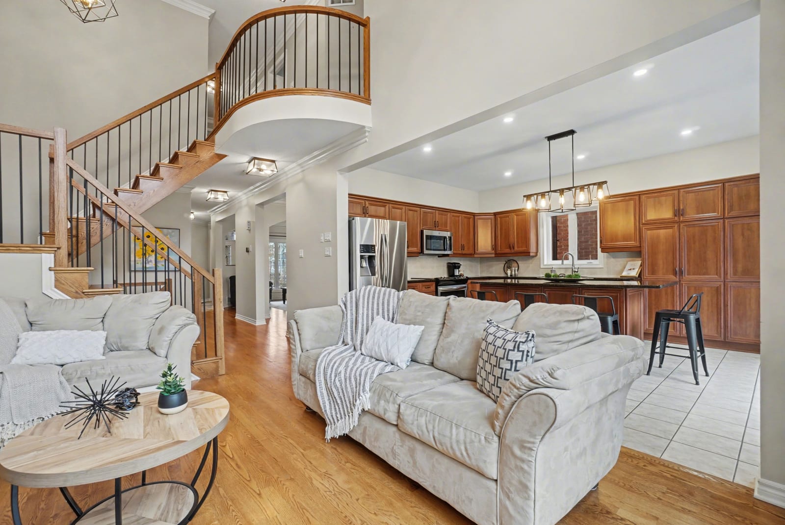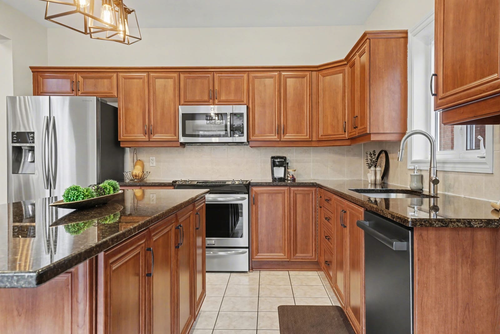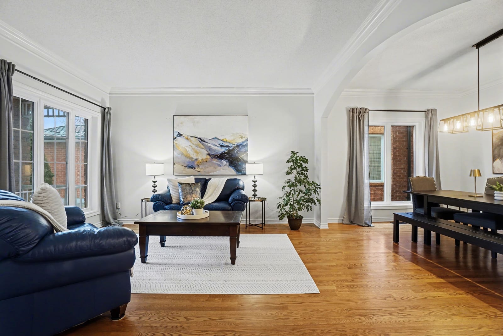 The elegant living and dining rooms are beautifully appointed with large windows, arched doorways, and elegant crown moulding, creating a warm and inviting atmosphere. At the heart of the home, the chef-inspired kitchen is sure to impress, featuring rich cabinetry, luxurious granite countertops, gleaming stainless steel appliances, a neutral backsplash, bonus pantry cupboards, and an oversized island with convenient seating.