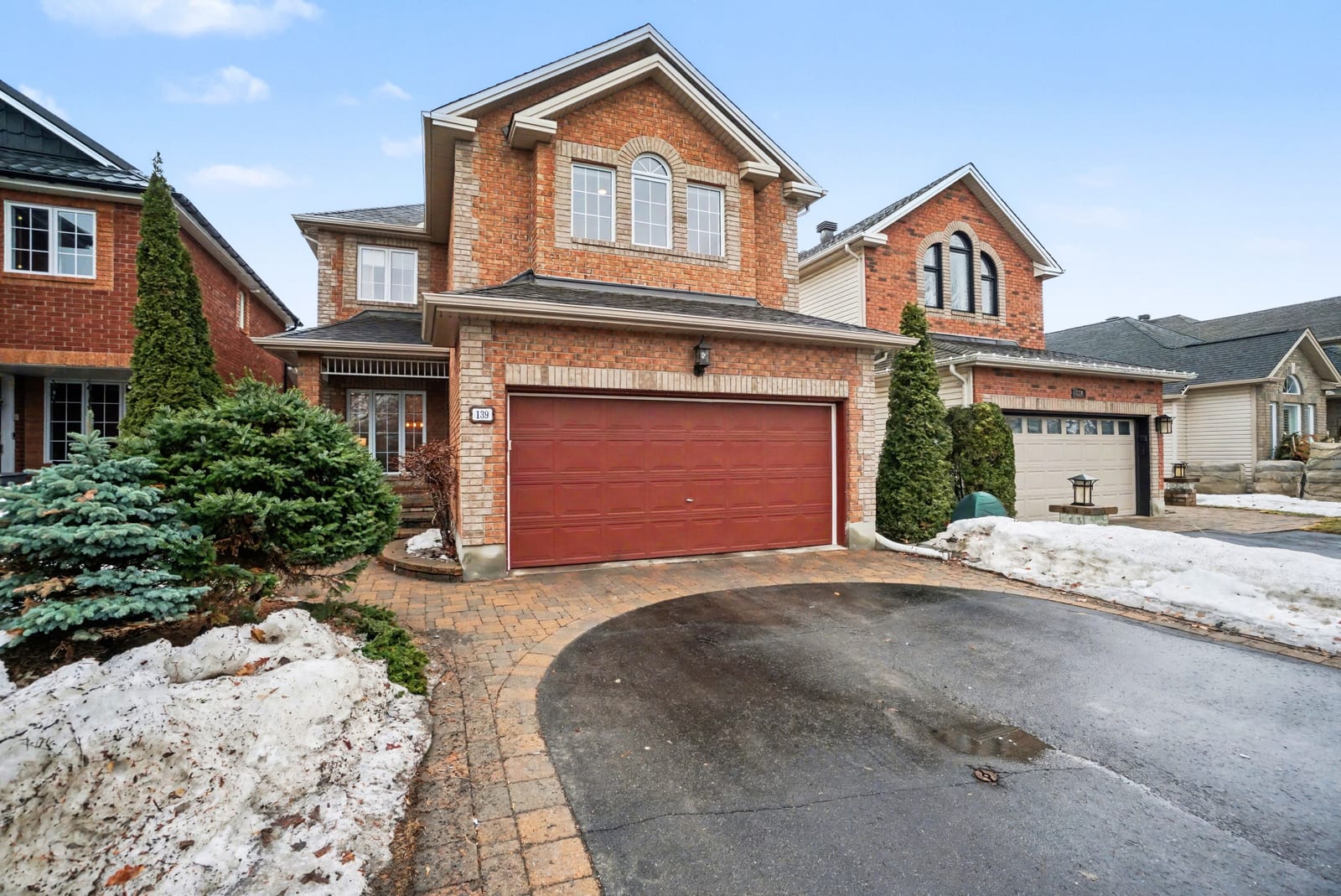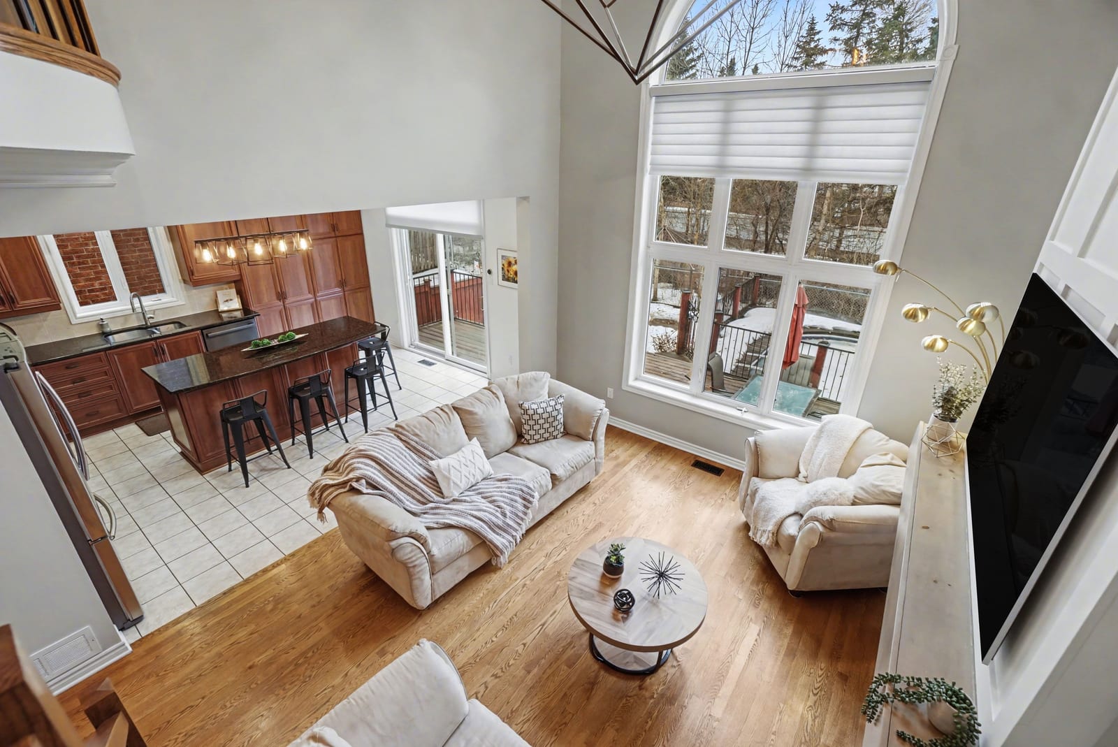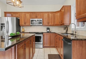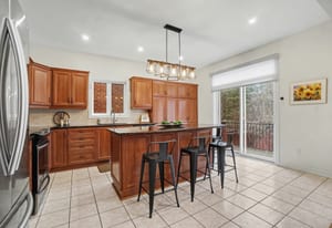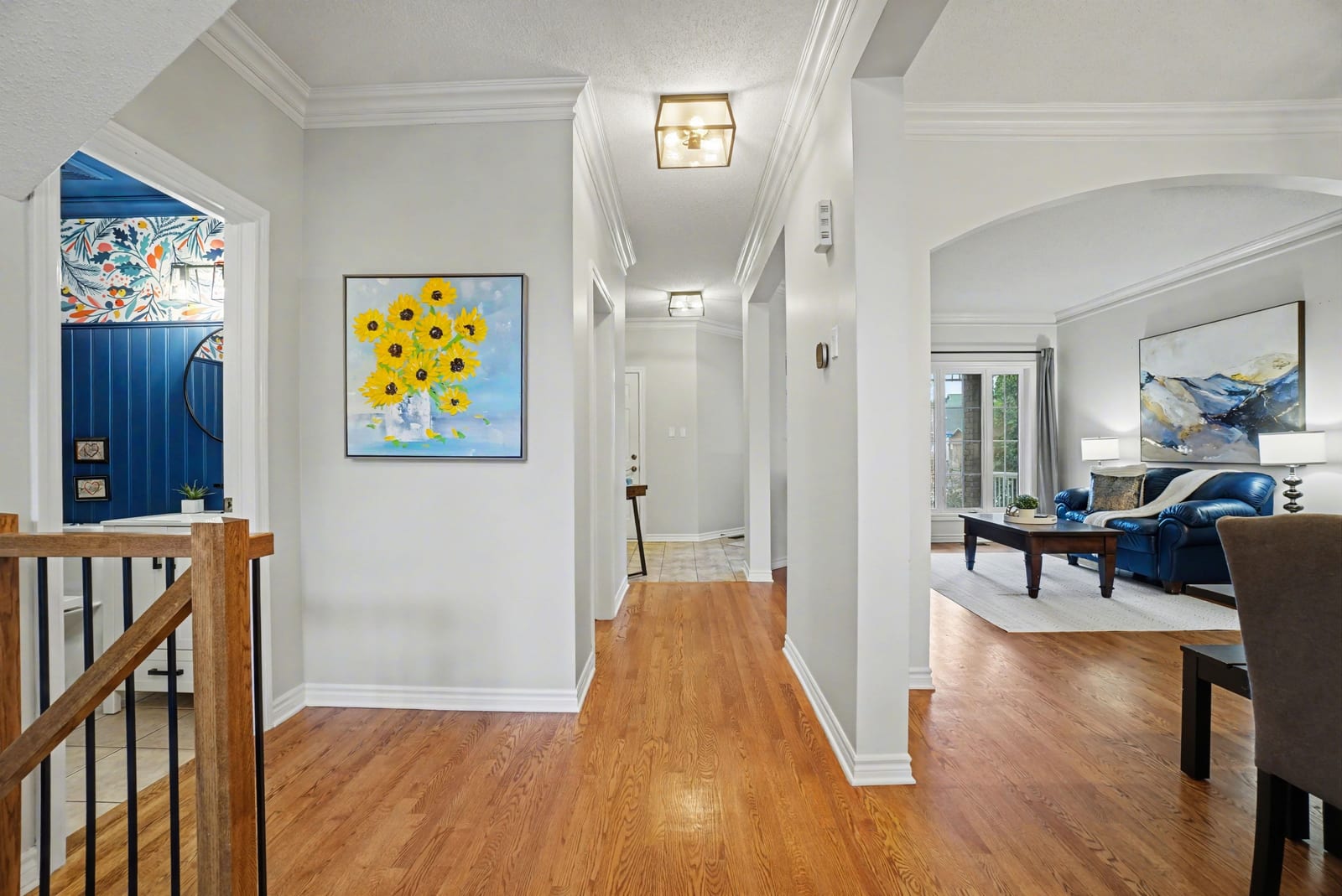 The elegant living and dining rooms are beautifully appointed with large windows, arched doorways, and elegant crown moulding, creating a warm and inviting atmosphere. At the heart of the home, the chef-inspired kitchen is sure to impress, featuring rich cabinetry, luxurious granite countertops, gleaming stainless steel appliances, a neutral backsplash, bonus pantry cupboards, and an oversized island with convenient seating.