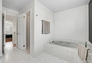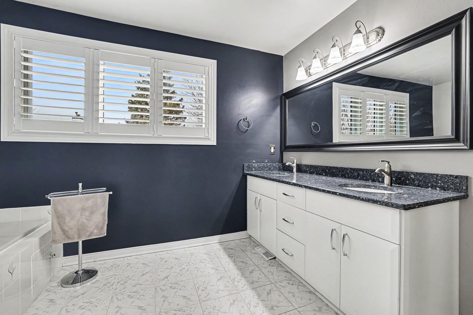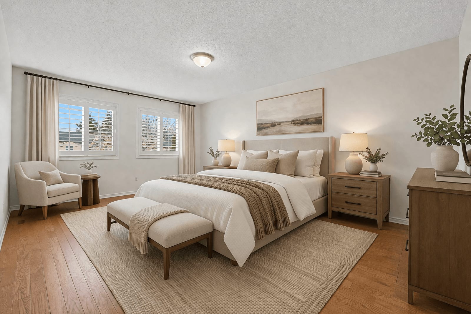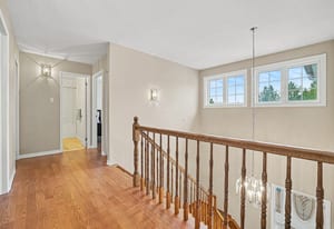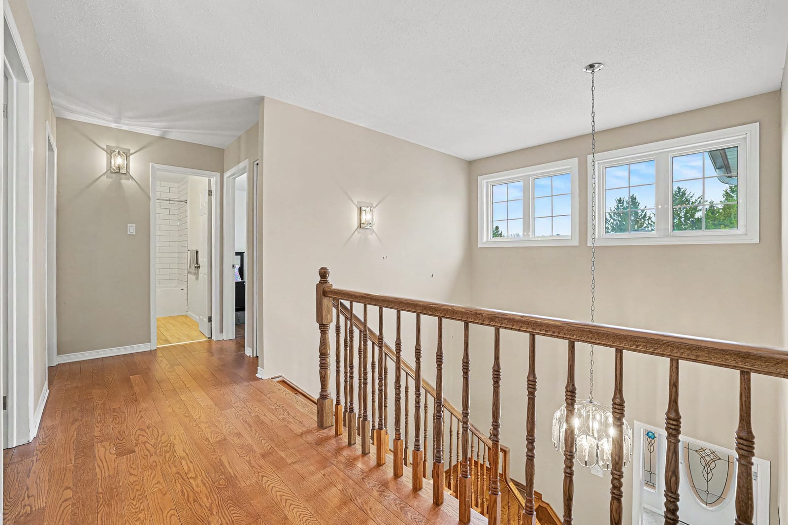 A hardwood staircase leads to the second level, where you will find four well-sized bedrooms, all featuring hardwood flooring. The spacious primary retreat measures over 18 feet in length and includes a walk-in closet and a beautifully appointed 5-piece ensuite with dual vanities, a jetted soaker tub, and a separate shower. The main bathroom has been tastefully renovated with a quartz countertop vanity and updated finishes.