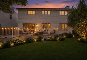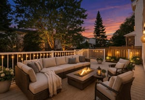 Step outside to a private backyard featuring a large elevated deck with modern railing, surrounded by mature trees that provide privacy and attract a variety of birdlife, creating a peaceful outdoor setting.