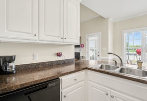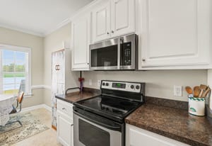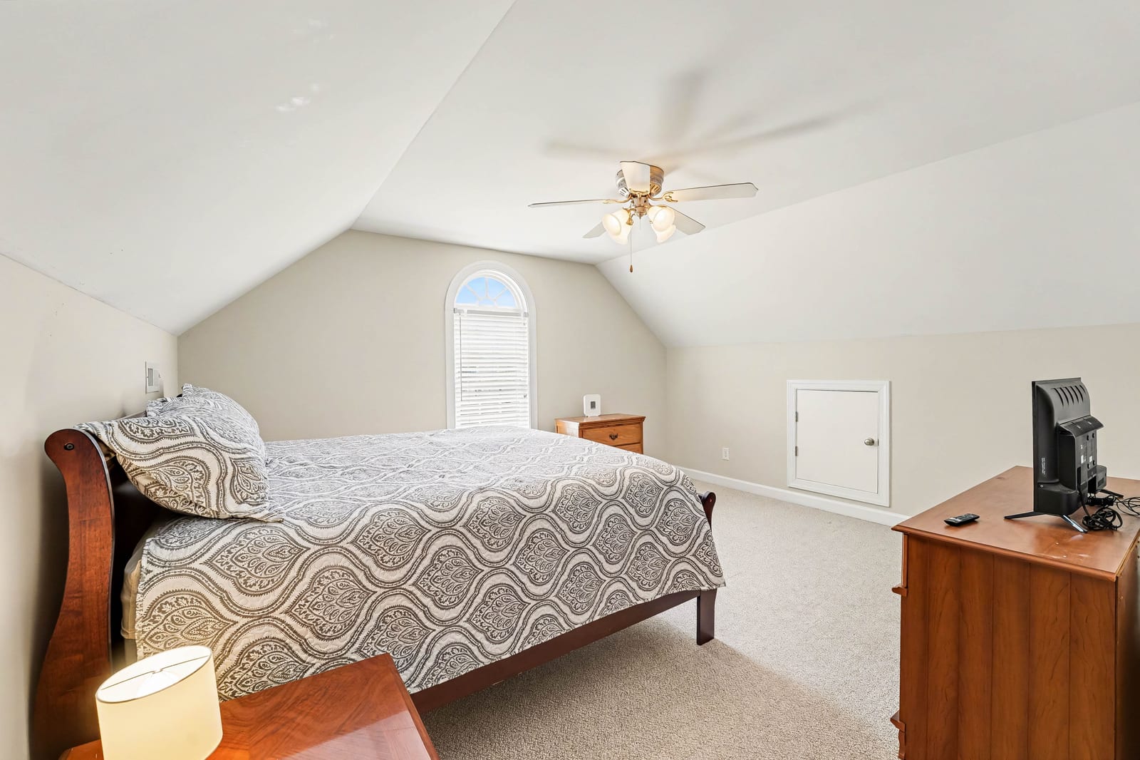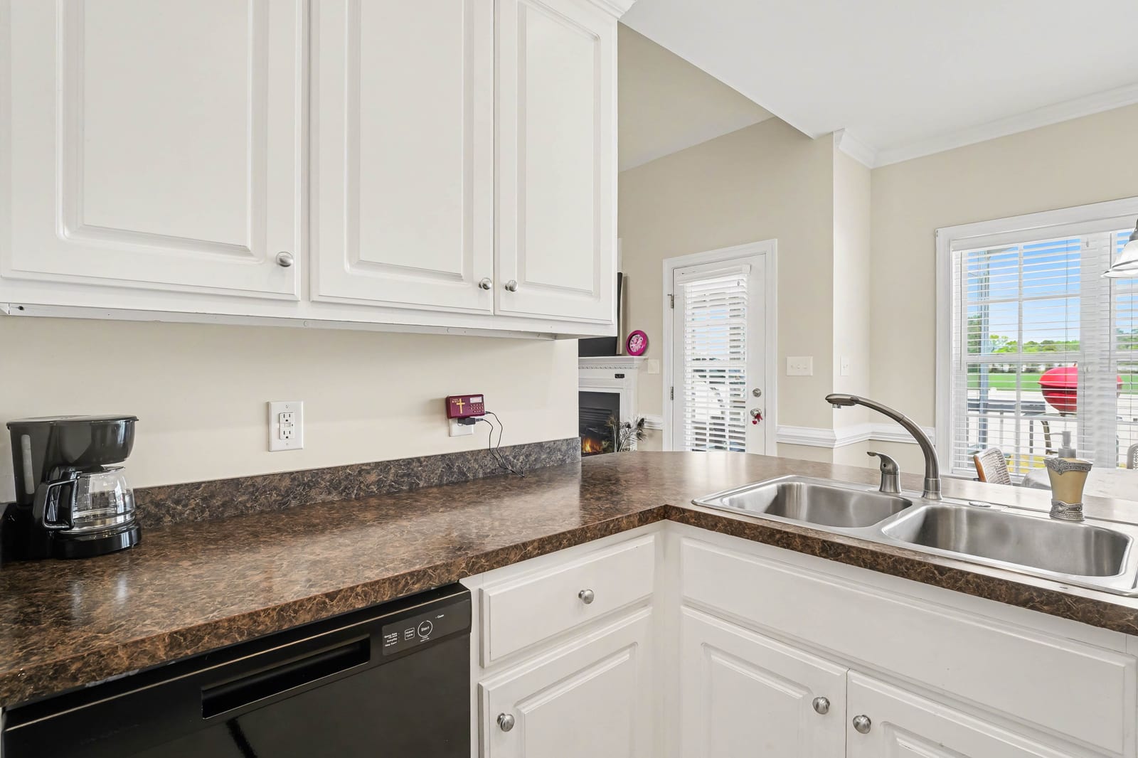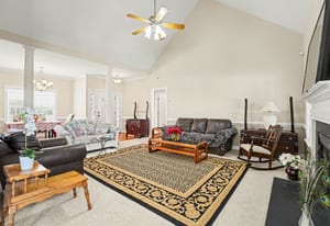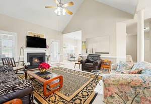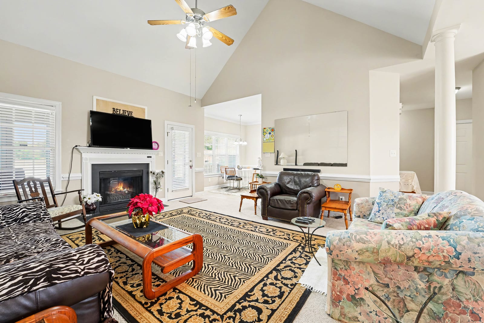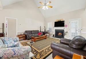 The inviting family room features a soaring vaulted ceiling that creates an open, airy feel--perfect for relaxing or entertaining guests. Turn on the electric fireplace for added warmth or ambience.