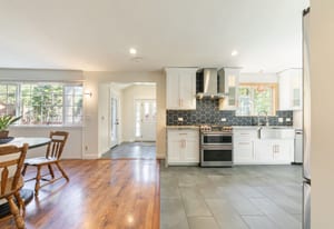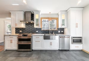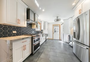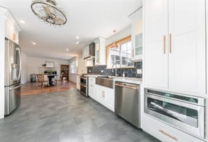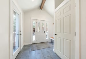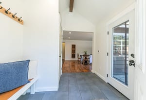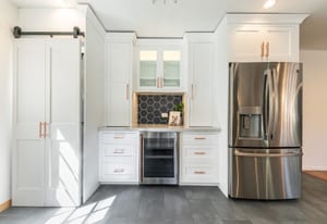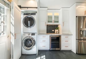 Designed with mountain living in mind, the welcoming front vestibule provides a thoughtful transition space—complete with room for a bench, gear storage, and radiant heated floors underfoot. Inside, the home opens to a beautifully appointed kitchen that will delight any chef, featuring top-of-the-line Café Appliances, custom white cabinetry, and striking stainless steel finishes accented by warm copper pulls. A gas range, apron-front sink, and expansive Brazilian Quartzite countertops create both function and elegance, while a dedicated beverage station with under-cabinet wine and beverage refrigeration—flanked by tall pantry storage—adds a touch of luxury. A cleverly concealed laundry area with stackable washer and dryer sits just behind a barn-style door, ideal for managing snowy gear after a day outdoors.