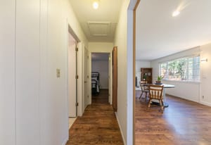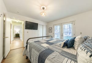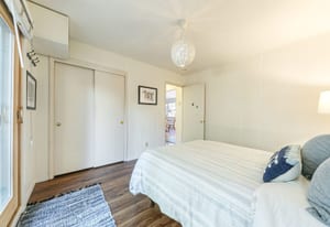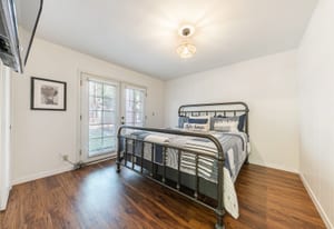 Two spacious bedrooms are privately positioned to face the backyard, each offering direct outdoor access through glass doors—perfect for enjoying the fresh alpine air. The outdoor space is designed for ease and enjoyment, with a pocket lawn, low-maintenance perennials, and a storage shed creating a serene, private setting.
