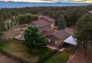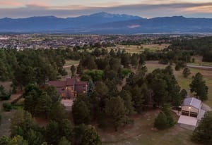 This home lives and feels as if you stepped into an Architectural Digest - it is absolutely stunning and there is nothing else like this available. The property is situated in very desirable southwest Black Forest on 9 acres that is perfectly treed w/ lush meadows and a great mixture of ponderosa pines, blue spruce, oak and fir trees. Unimpeded views of Pikes Peak. The entire park like 9 acres is fenced and freshly mitigated, features an asphalt driveway to the home and 25x40 outbuilding, the front is secured w/ an electric gate and camera system. The home and additional detached garage have been renovated from top to bottom. Upon entering the home you are greeted with towering tongue and grove wood ceilings, large windows with loads of natural light, high end lighting, expansive rooms, neutral colors, wide plank white oak floors and custom metal railings. The kitchen is perfectly positioned for entertaining between the family room and the deck which is accessed through a large double sliding glass door. The kitchen has an abundance of cabinetry, Quartz counters, coffee station w/ pot filler, island, warming drawer, 6 burner gas cook-top, double oven, commercial vent hood. Great room w/ two story stacked stone fireplace. The family room features built-ins which match the kitchen cabinetry, a 6ft gas fireplace w/ wood statement wall. Expansive composite deck w/ metal railings, two heaters, motorized shade, gas grill and gas firepit w/ a metal fenced yard. Main level primary suite w/ two walk-in closets, built-in wardrobe, double vanity, heated floors, over-sized shower. Walk-out finished lower level with heated floors. Three upper level spacious bedrooms and a bath. The garage features 4 overhead doors which allow drive through, spray foam insulation, a radiant in-floor heat system that tackles snowmelt on the exterior concrete areas of the outbuilding. New natural gas whole house generator. Virtual tour and marketing video available.