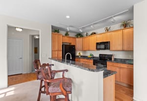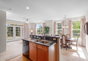 The open living design creates a natural flow between the kitchen, dining, and family room, making everyday living easy and comfortable. At the center, the kitchen island with sink, prep space, and casual seating serves as a welcoming hub for morning coffee or simple meals. Generous cabinetry and ample counter space make the kitchen as practical as it is inviting.