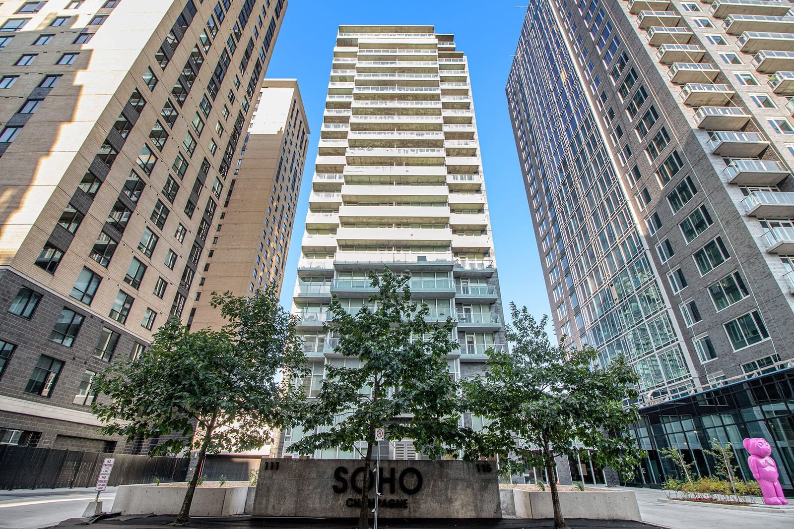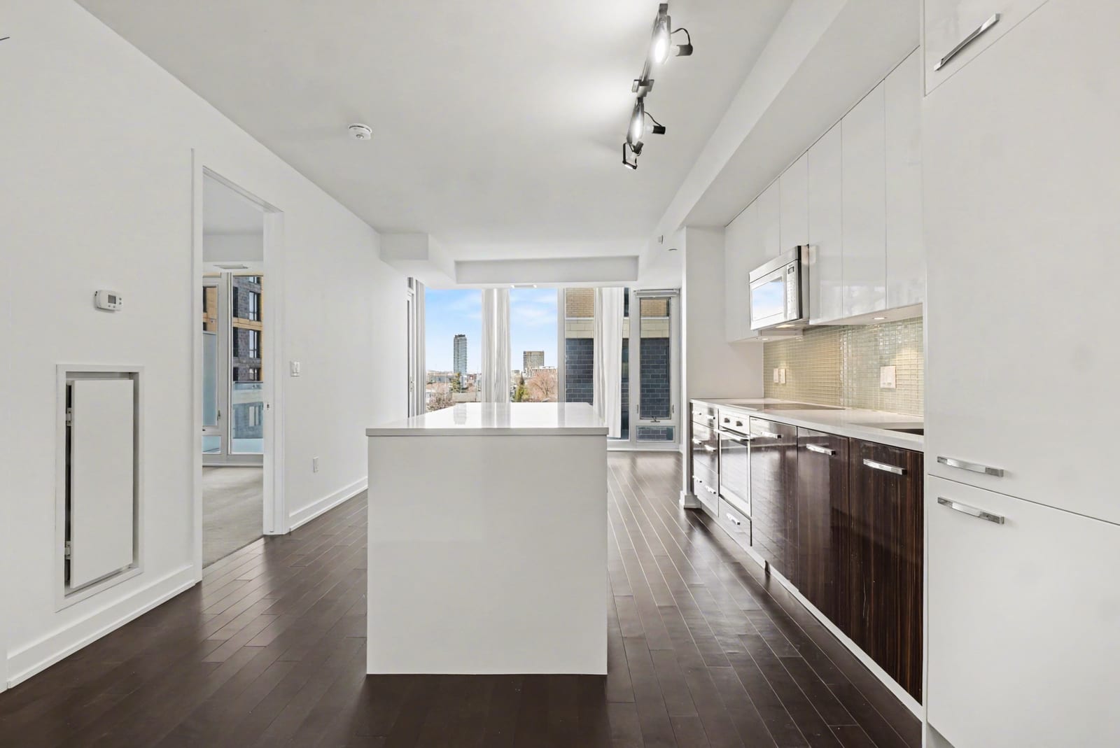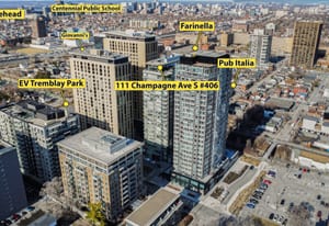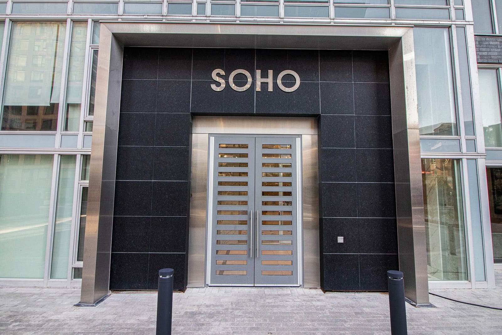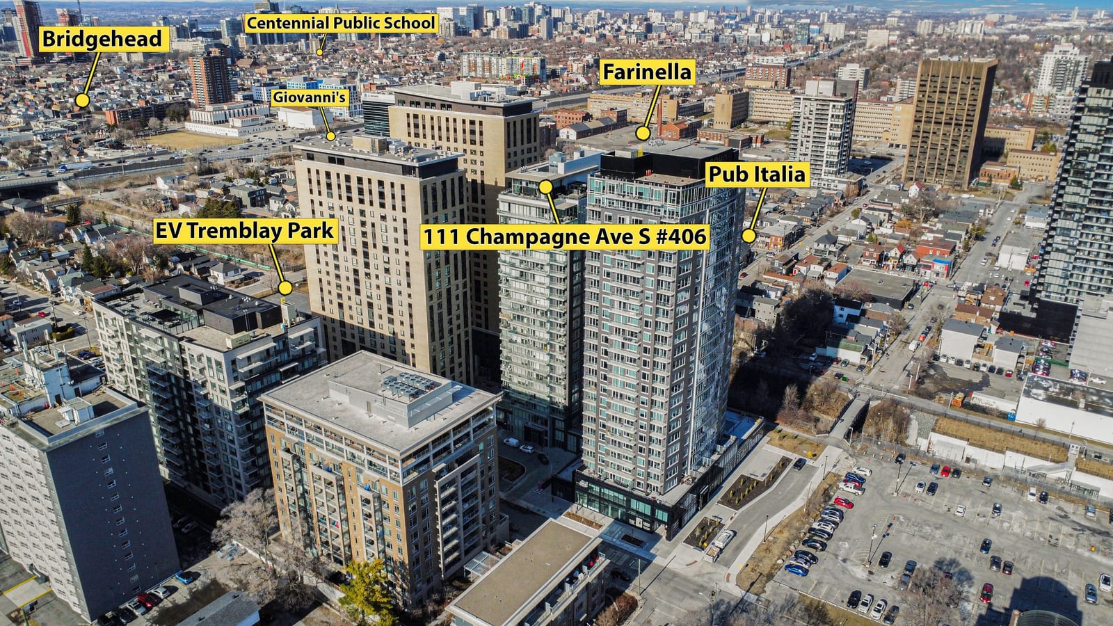 Experience the height of urban sophistication at 111 Champagne Avenue South, Suite 404, where the renowned SOHO lifestyle meets the historic charm and vibrant energy of Little Italy. This sleek, freshly painted one-bedroom retreat offers a premier living experience defined by a seamless open-concept layout, floor-to-ceiling windows, and rich engineered hardwood flooring. At the heart of the home is a chef-inspired kitchen that balances form and function, finished with premium quartz countertops, high-end cabinet-matched appliances, and a versatile three-stool breakfast bar perfect for casual dining or entertaining. The transition to the private quarters reveals a spacious, quiet haven featuring plush carpeting, complemented by a sophisticated three-piece bathroom that boasts a luxurious walk-in tile shower and a custom quartz vanity.
