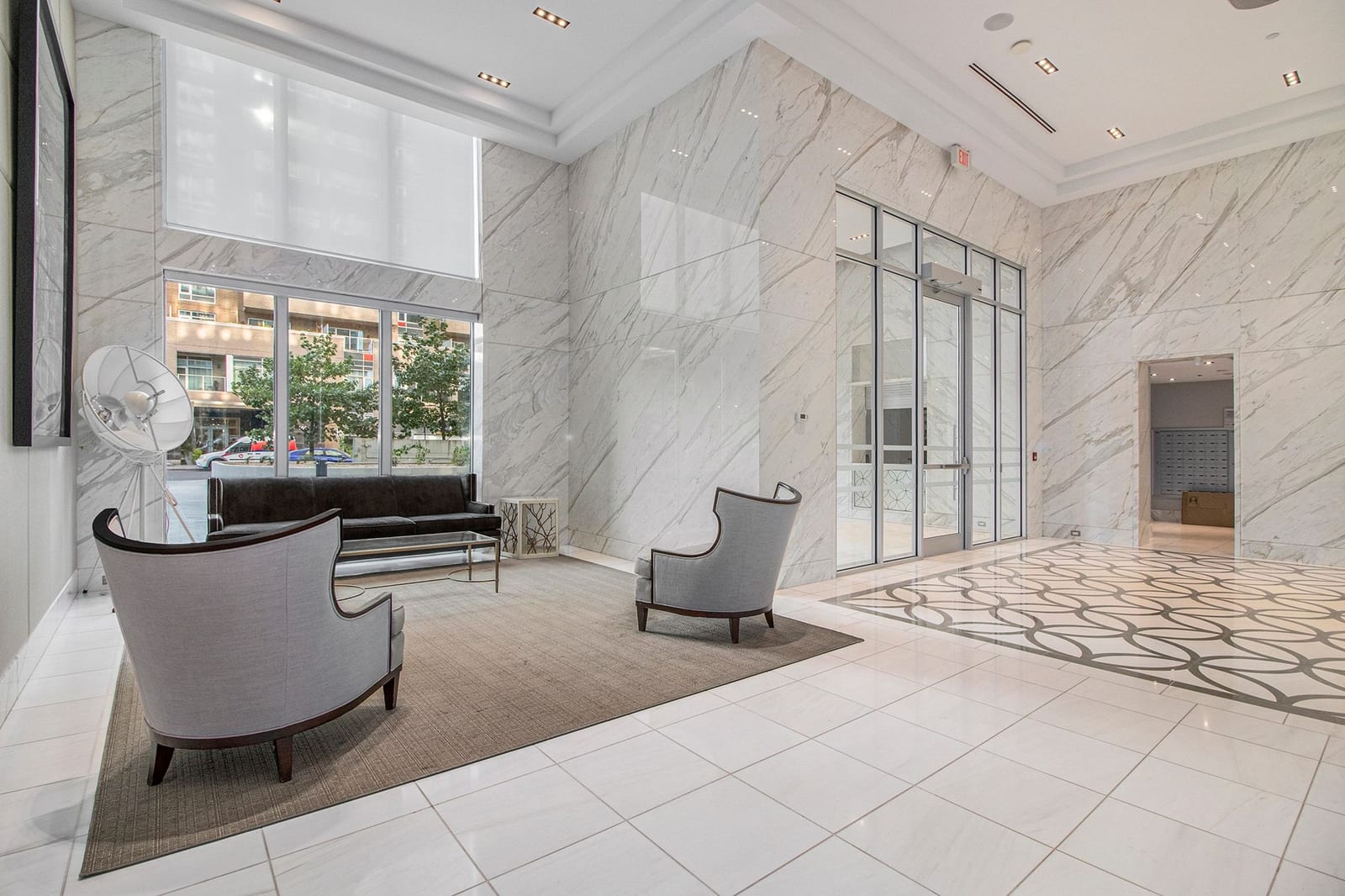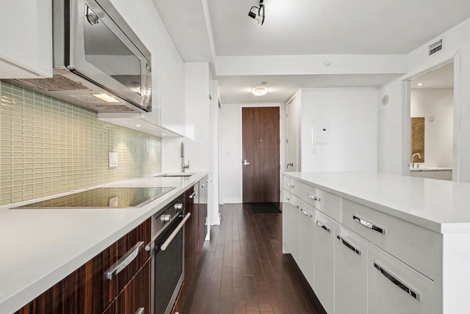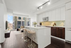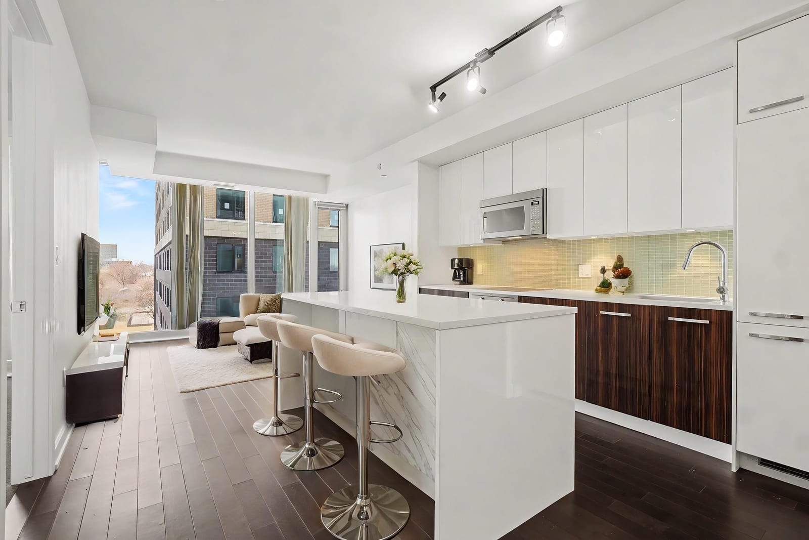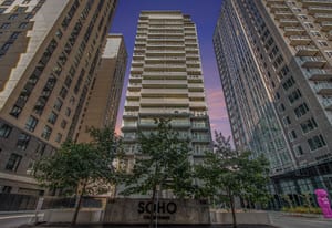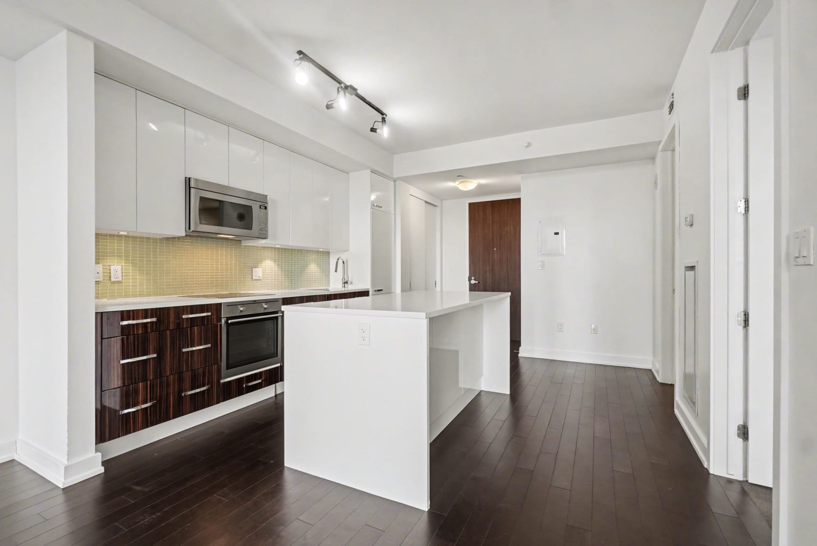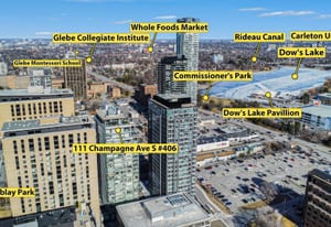 Experience the height of urban sophistication at 111 Champagne Avenue South, Suite 404, where the renowned SOHO lifestyle meets the historic charm and vibrant energy of Little Italy. This sleek, freshly painted one-bedroom retreat offers a premier living experience defined by a seamless open-concept layout, floor-to-ceiling windows, and rich engineered hardwood flooring. At the heart of the home is a chef-inspired kitchen that balances form and function, finished with premium quartz countertops, high-end cabinet-matched appliances, and a versatile three-stool breakfast bar perfect for casual dining or entertaining. The transition to the private quarters reveals a spacious, quiet haven featuring plush carpeting, complemented by a sophisticated three-piece bathroom that boasts a luxurious walk-in tile shower and a custom quartz vanity.