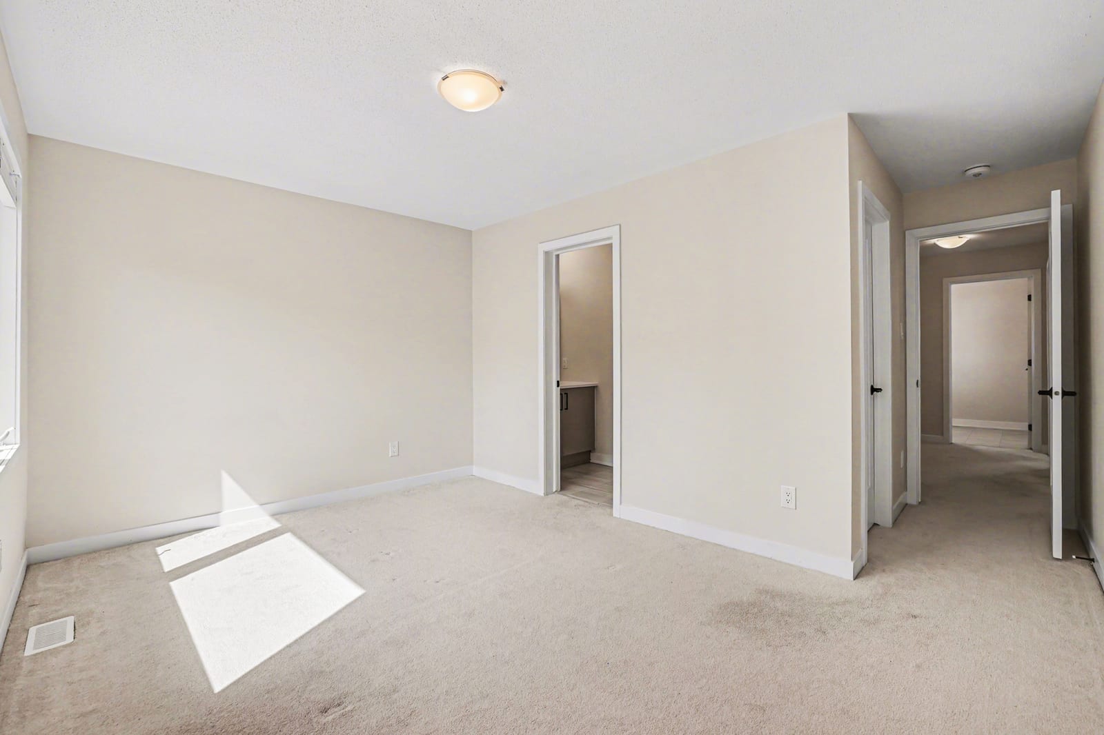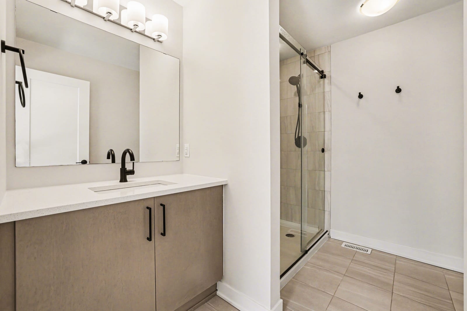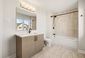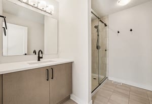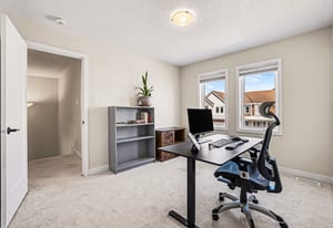 Upstairs, the home offers two full bathrooms and three spacious bedrooms. The primary suite serves as a private retreat, featuring a walk-in closet and a luxurious ensuite with a custom shower. Two additional well-sized bedrooms—each uniquely equipped with its own walk-in closet—and a second large full bathroom finished with quartz provide plenty of room for family or a professional home office.