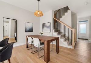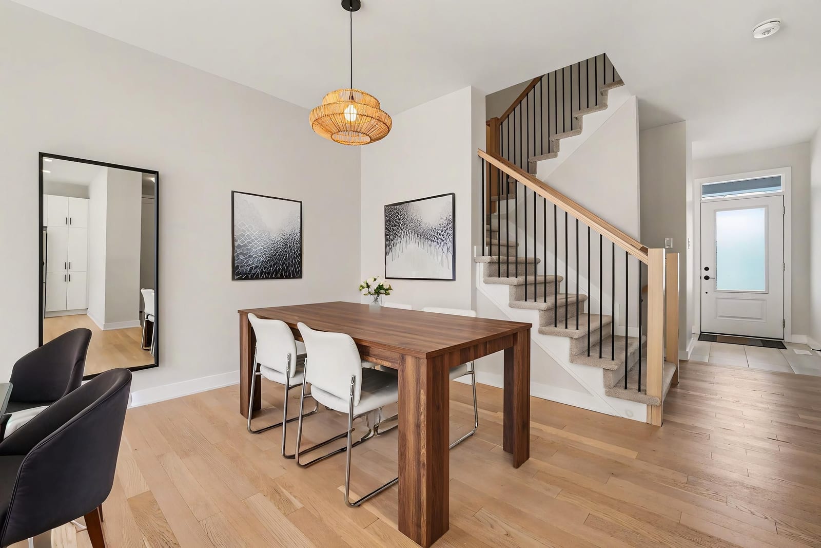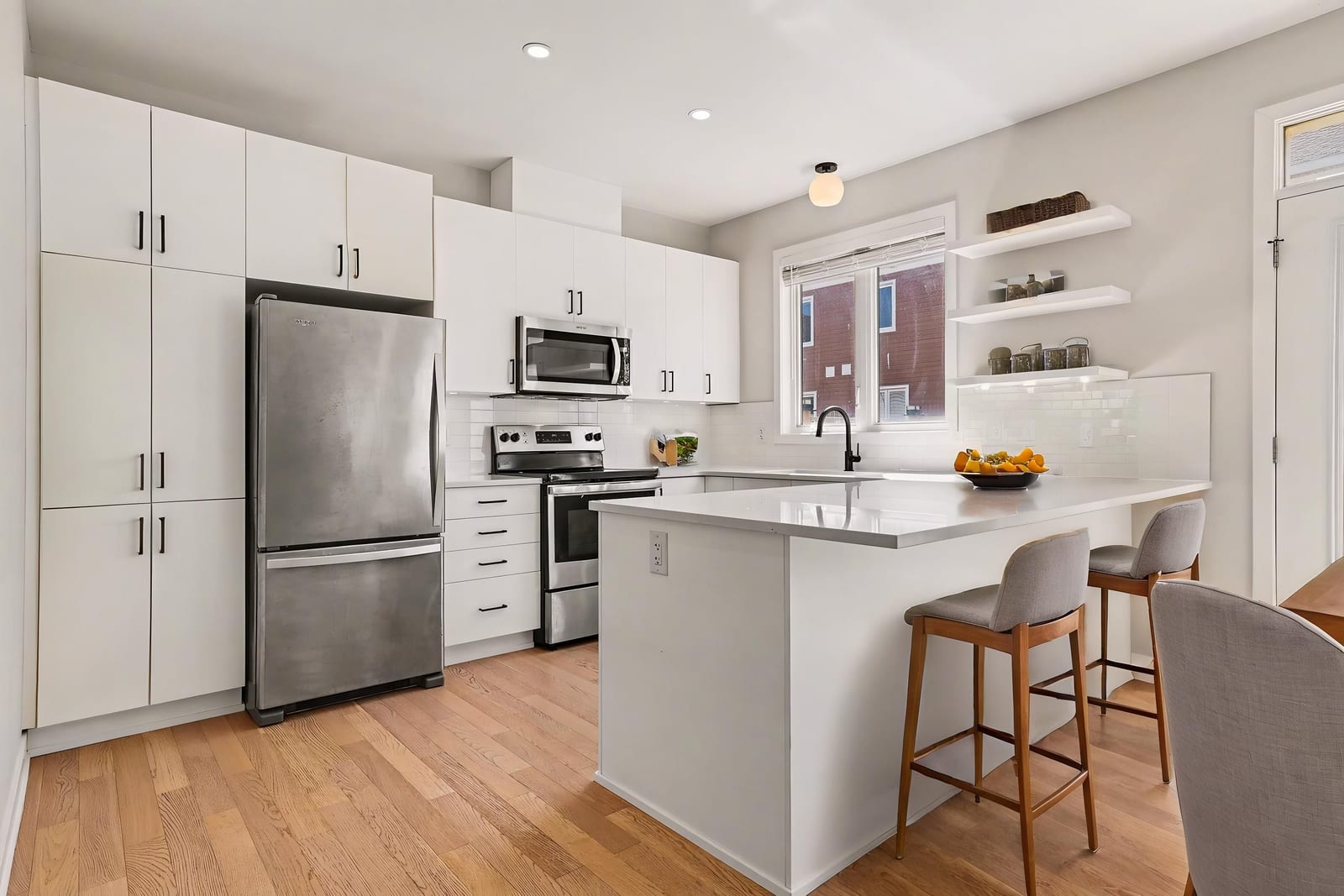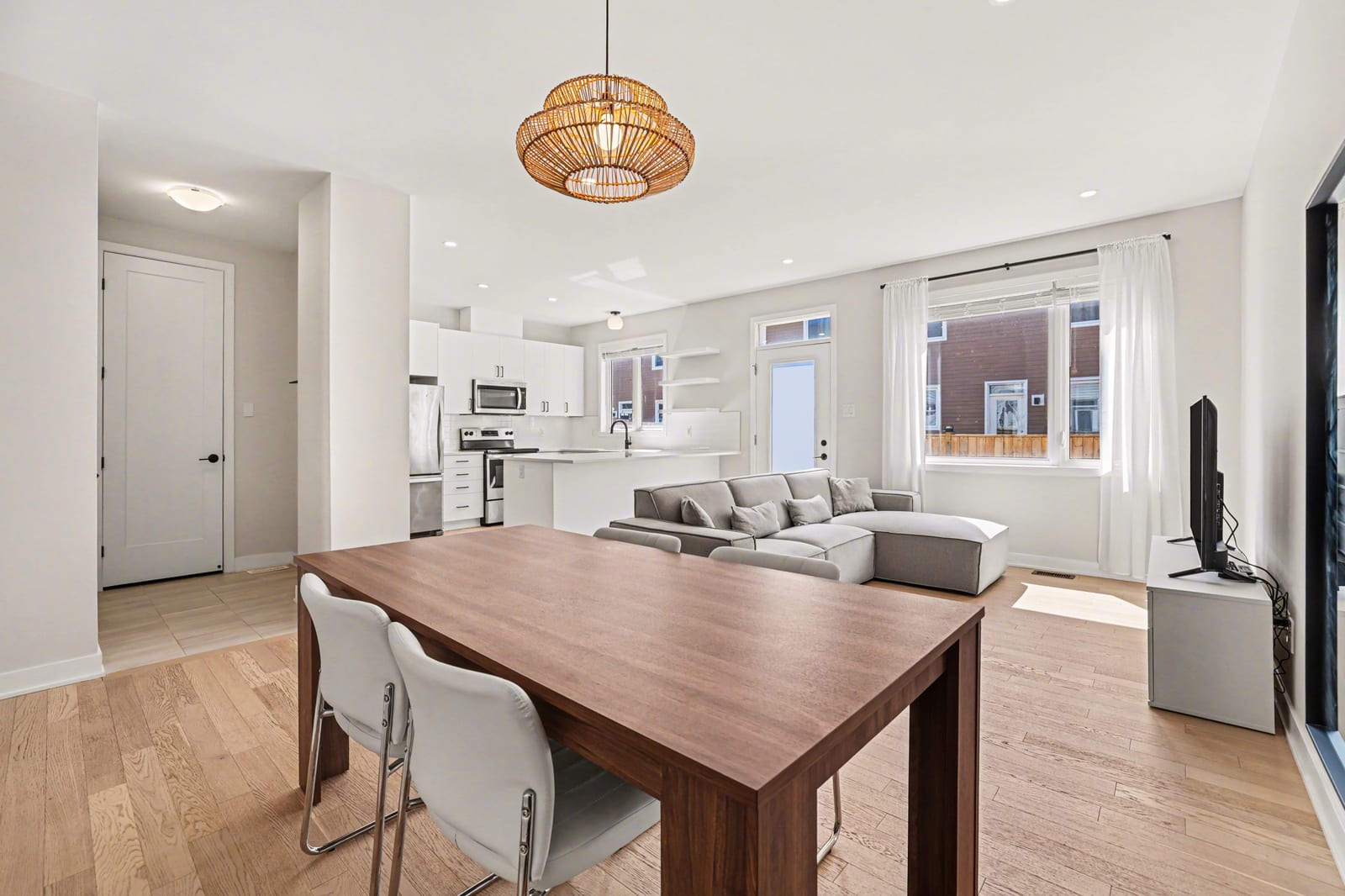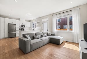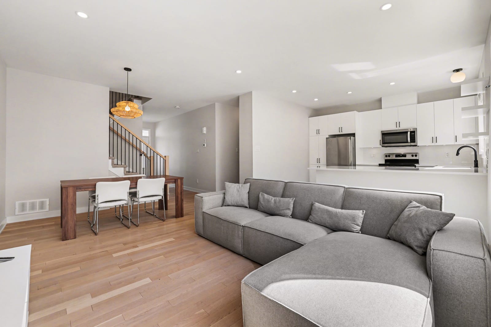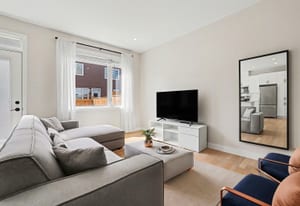 The open-concept main level impresses with 9’ ceilings and a sun-drenched living room, illuminated by oversized windows and upgraded pot lighting. A fresh, neutral color palette flows seamlessly throughout, creating an airy atmosphere that perfectly complements the elegant hardwood floors. This level features a conveniently located powder room and a chef-inspired kitchen boasting crisp white cabinetry, a chic tile backsplash, sleek quartz countertops with a breakfast bar, and premium stainless steel appliances.