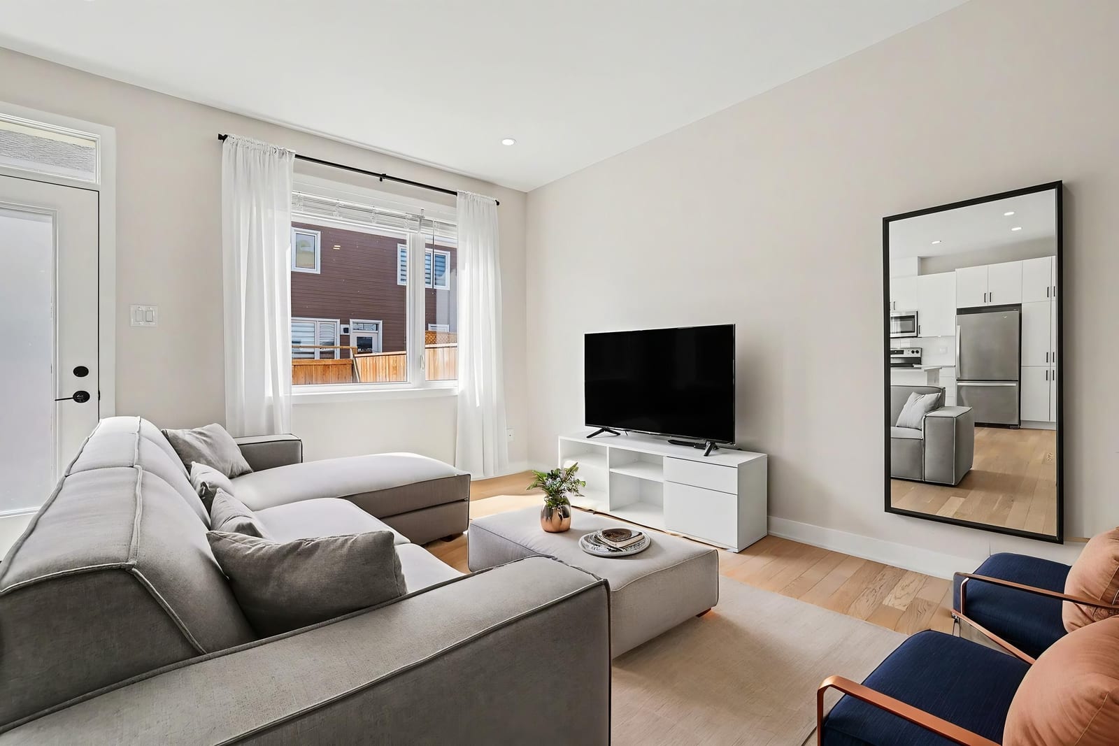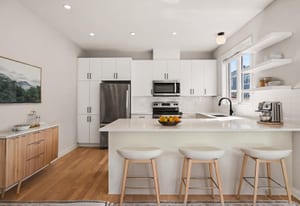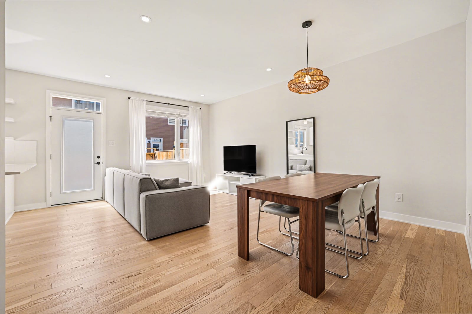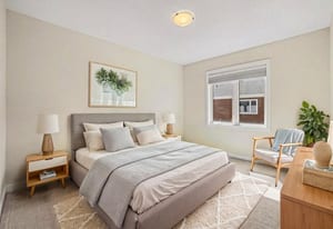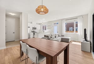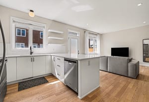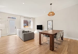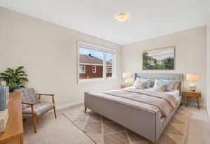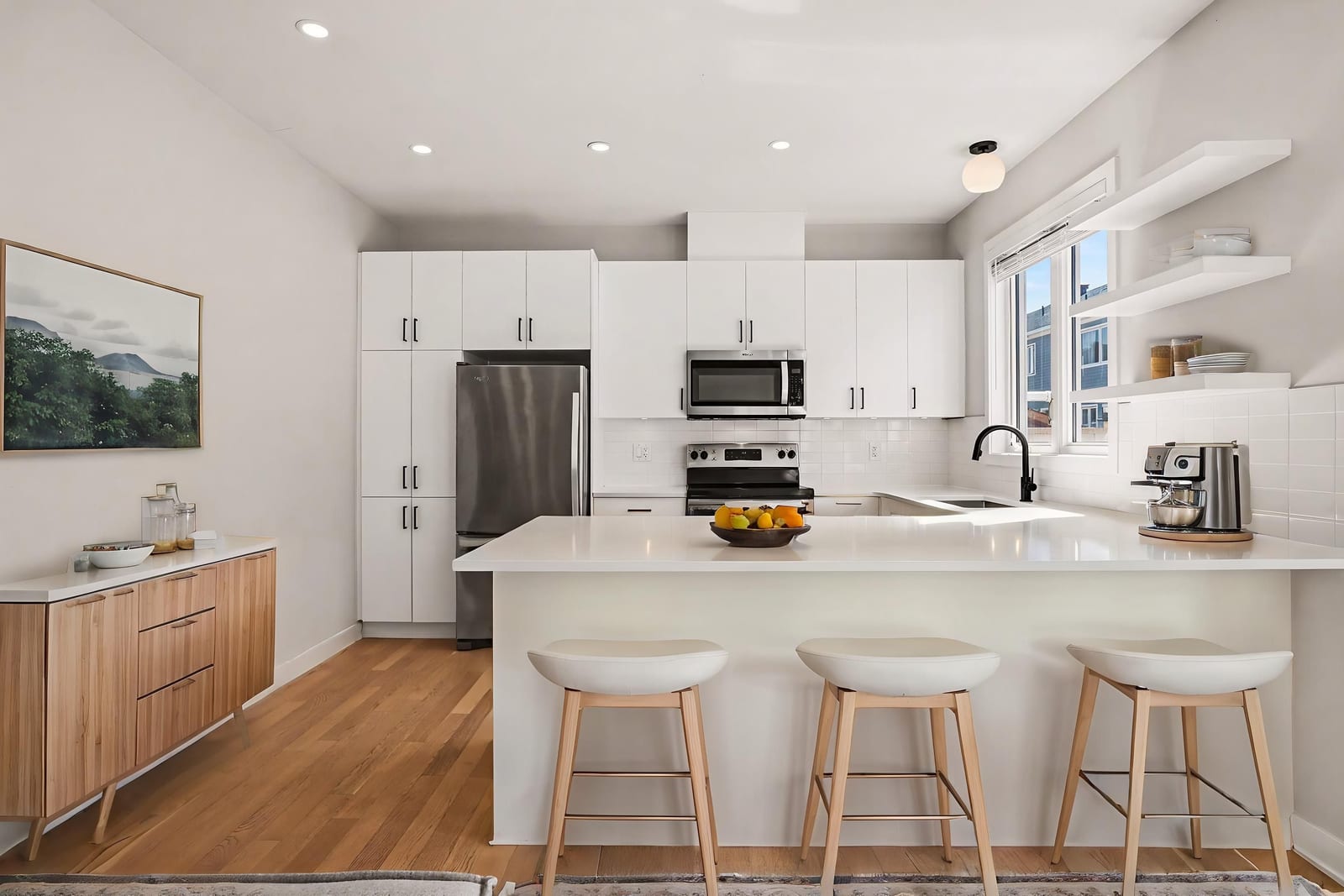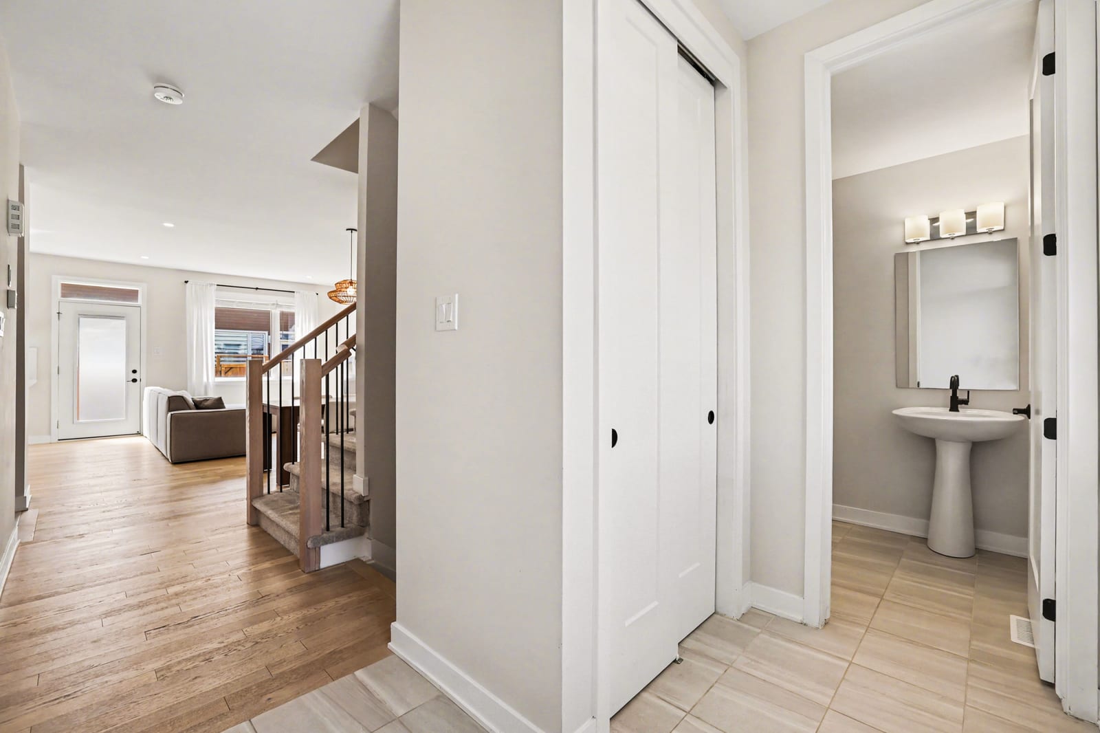 The open-concept main level impresses with 9’ ceilings and a sun-drenched living room, illuminated by oversized windows and upgraded pot lighting. A fresh, neutral color palette flows seamlessly throughout, creating an airy atmosphere that perfectly complements the elegant hardwood floors. This level features a conveniently located powder room and a chef-inspired kitchen boasting crisp white cabinetry, a chic tile backsplash, sleek quartz countertops with a breakfast bar, and premium stainless steel appliances.