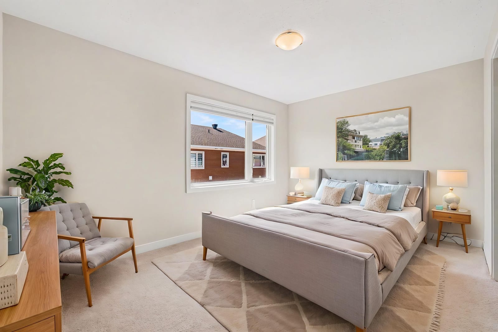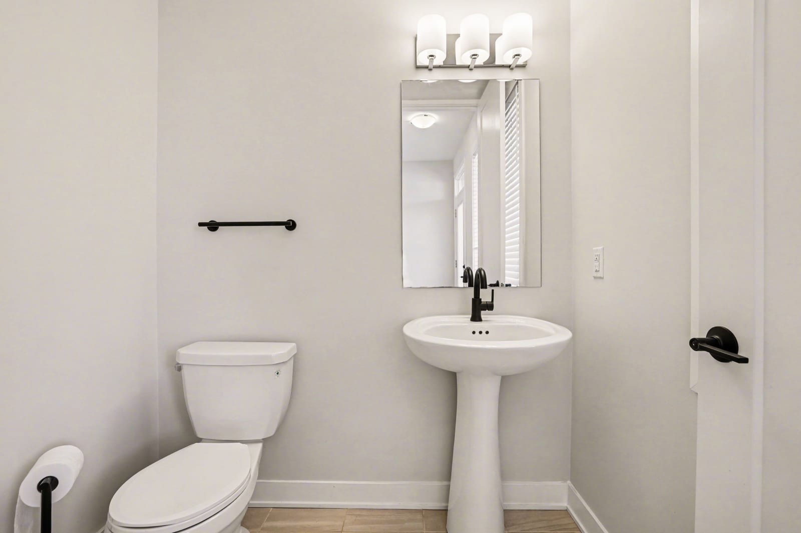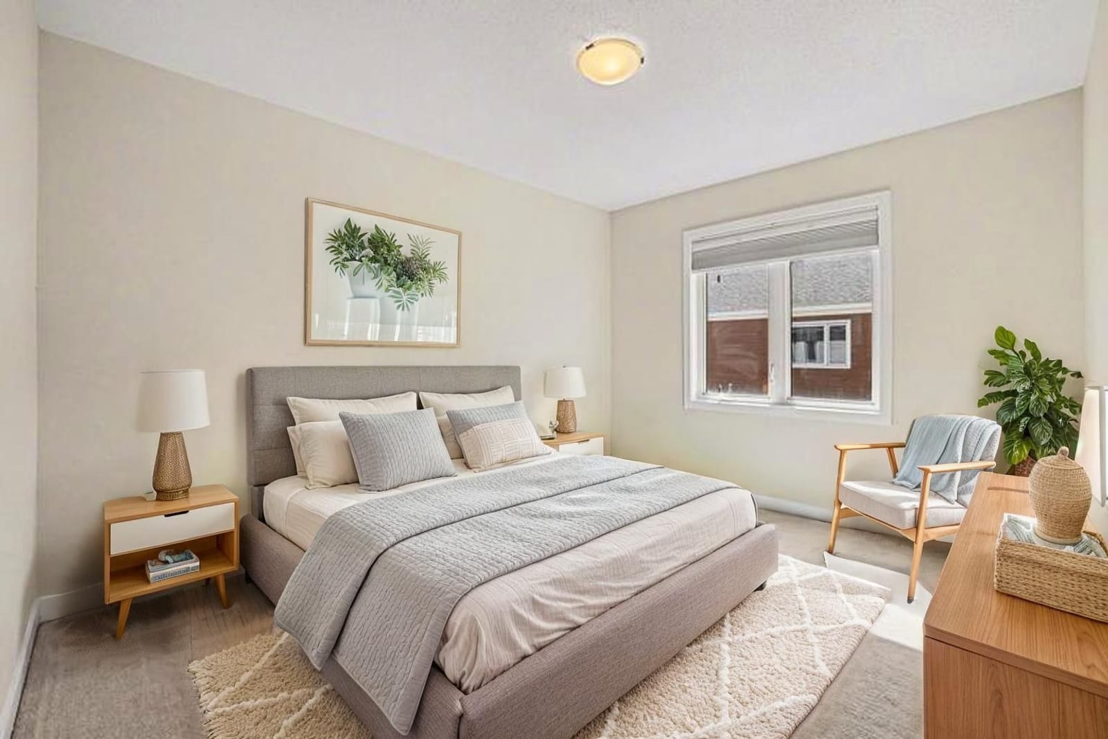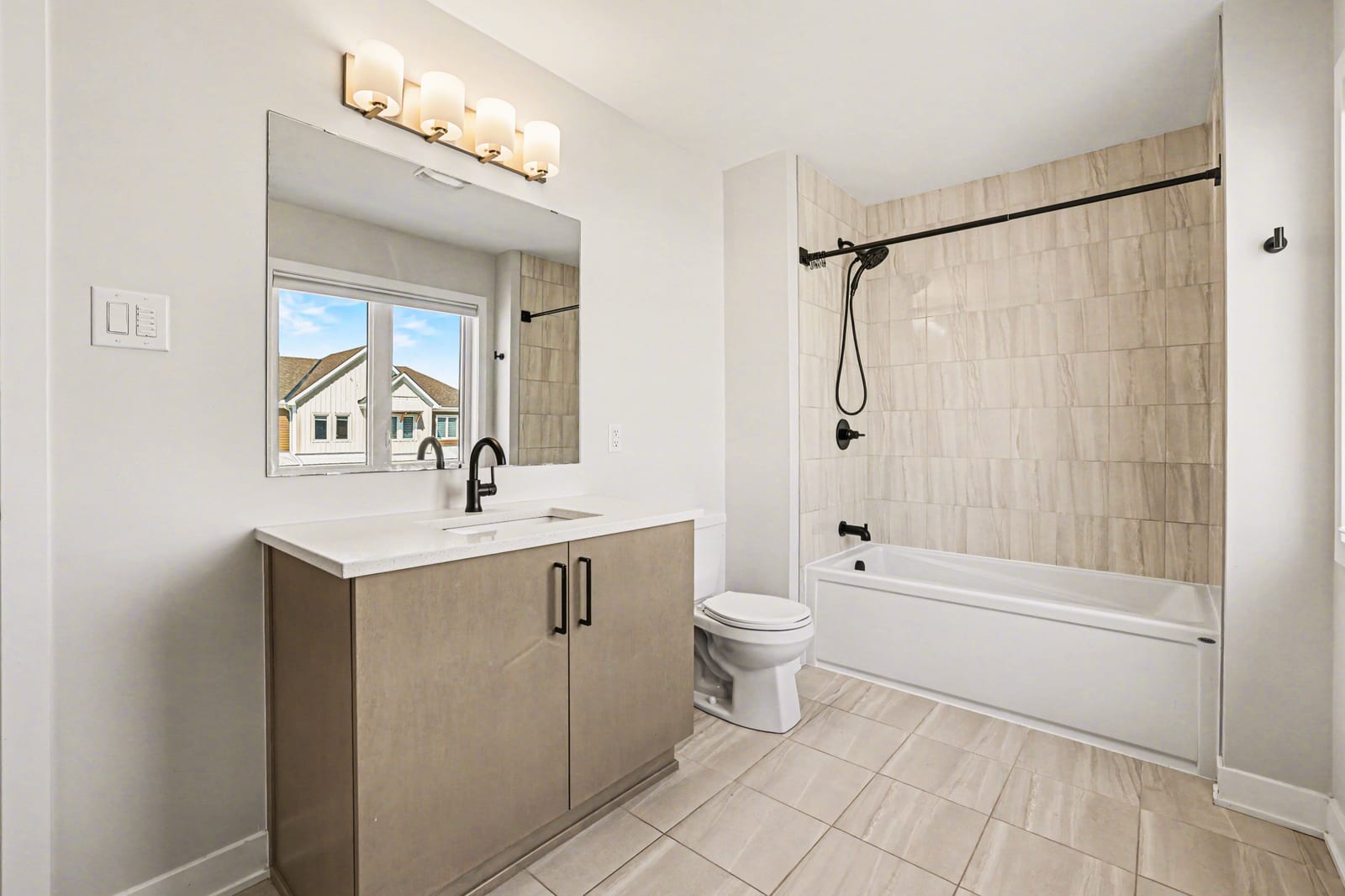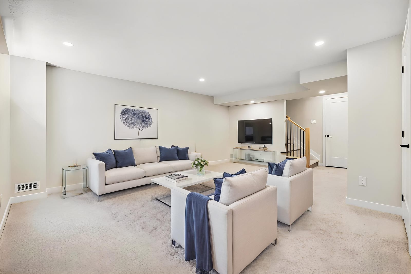 The open-concept main level impresses with 9’ ceilings and a sun-drenched living room, illuminated by oversized windows and upgraded pot lighting. A fresh, neutral color palette flows seamlessly throughout, creating an airy atmosphere that perfectly complements the elegant hardwood floors. This level features a conveniently located powder room and a chef-inspired kitchen boasting crisp white cabinetry, a chic tile backsplash, sleek quartz countertops with a breakfast bar, and premium stainless steel appliances.