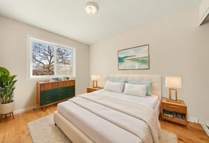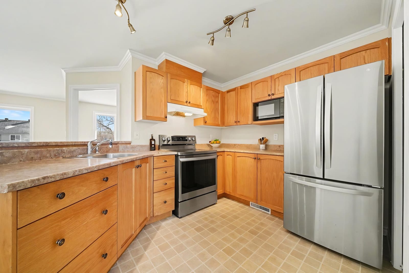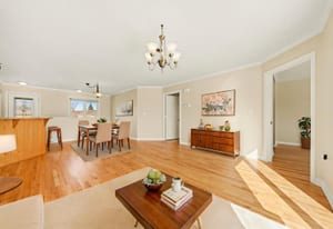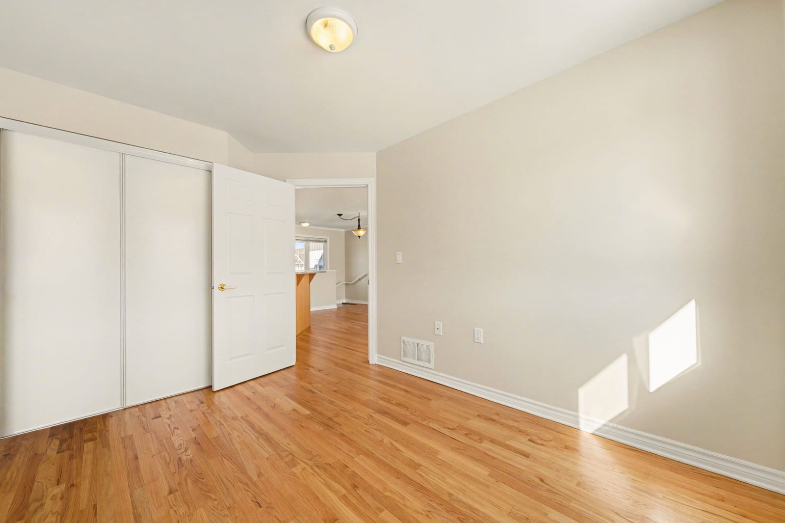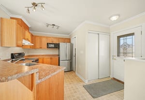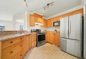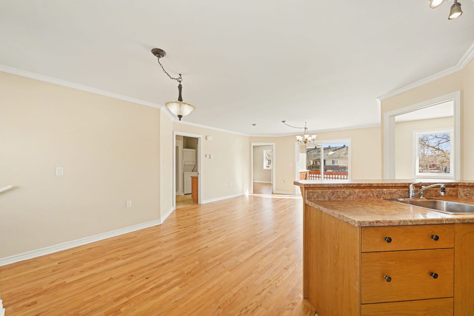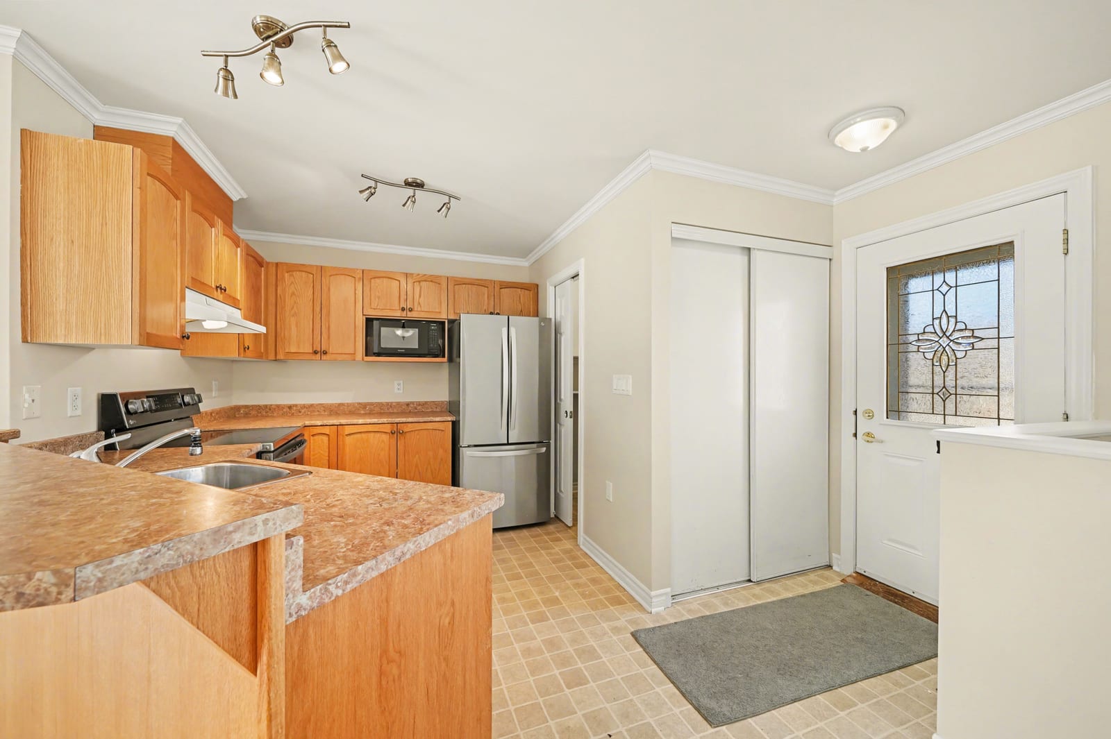 The sun-filled main floor boasts a spacious living area highlighted by recently refinished site-finished oak hardwood flooring that extends through both bedrooms. The updated open kitchen is a chef's delight, featuring stainless steel appliances, a functional breakfast bar, and a bonus pantry for extra storage. The primary bedroom is a true retreat, offering double closets and direct "cheater" access to the four-piece main bathroom, which also houses a convenient stackable washer and dryer.