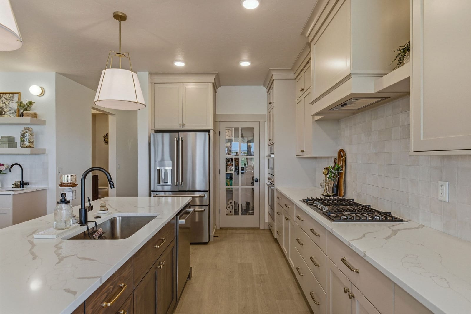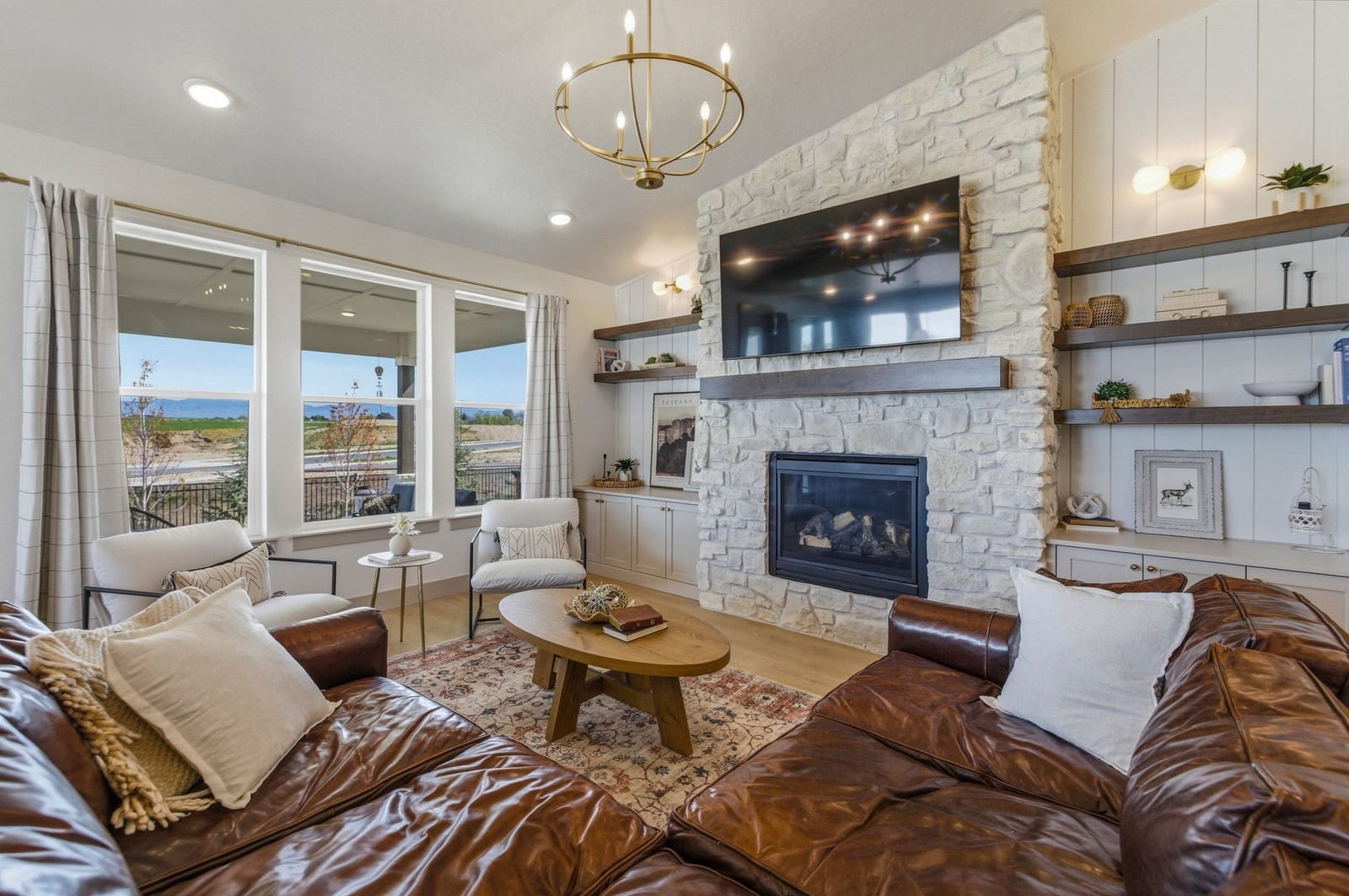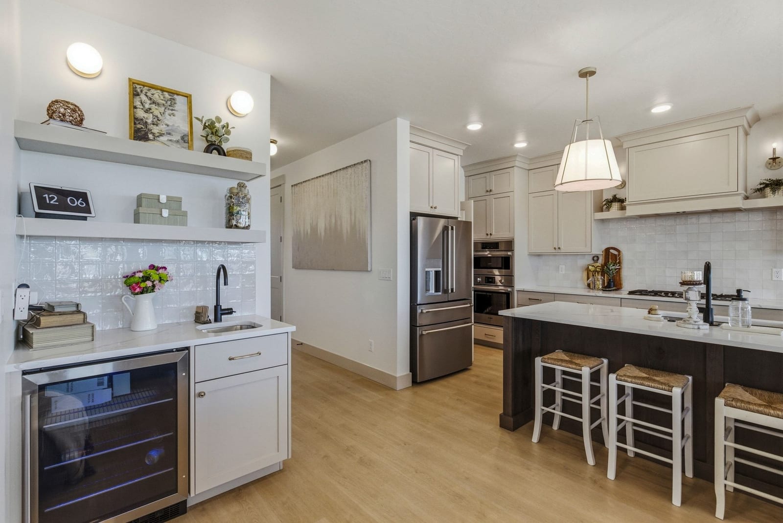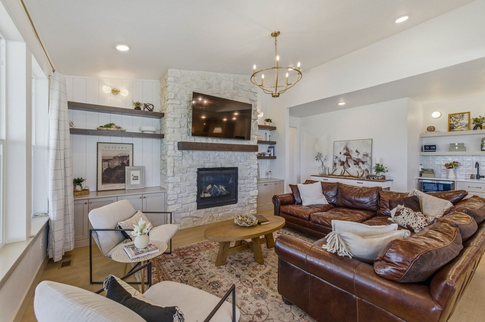 This is the kind of home that just lives well from the moment you walk in. Built by Integrity Homes as a semi-custom home, soaring ceilings and tall doors create an elevated feel, while natural light pours into the great room, drawing you toward a stunning stone fireplace framed by built-ins with soft accent lighting—it’s warm, inviting, and effortlessly elevated. The kitchen is both beautiful and functional, with natural tone cabinetry, quartz counters, double ovens, and a beverage station that makes mornings feel a little more curated. The main-level primary suite feels like a true retreat, with a vaulted ceiling, statement wall, and a walk-in closet that connects directly to the ...