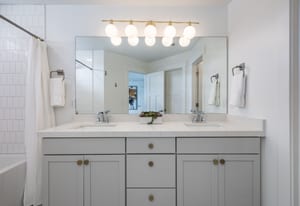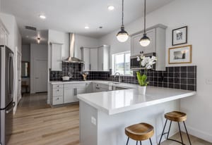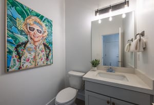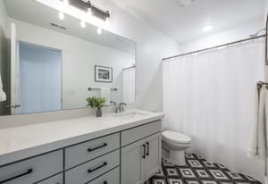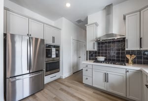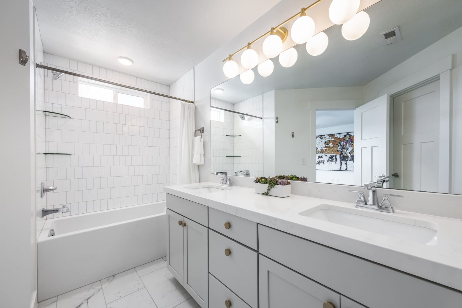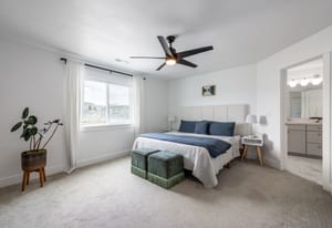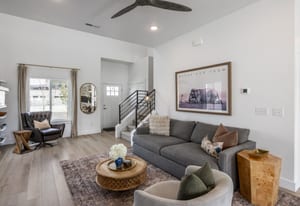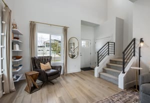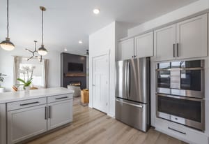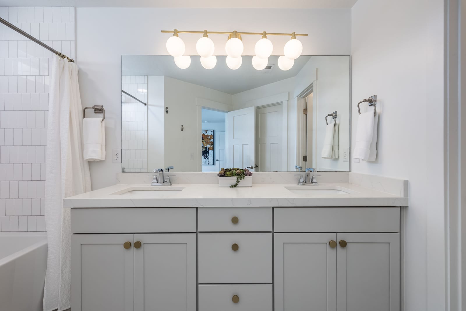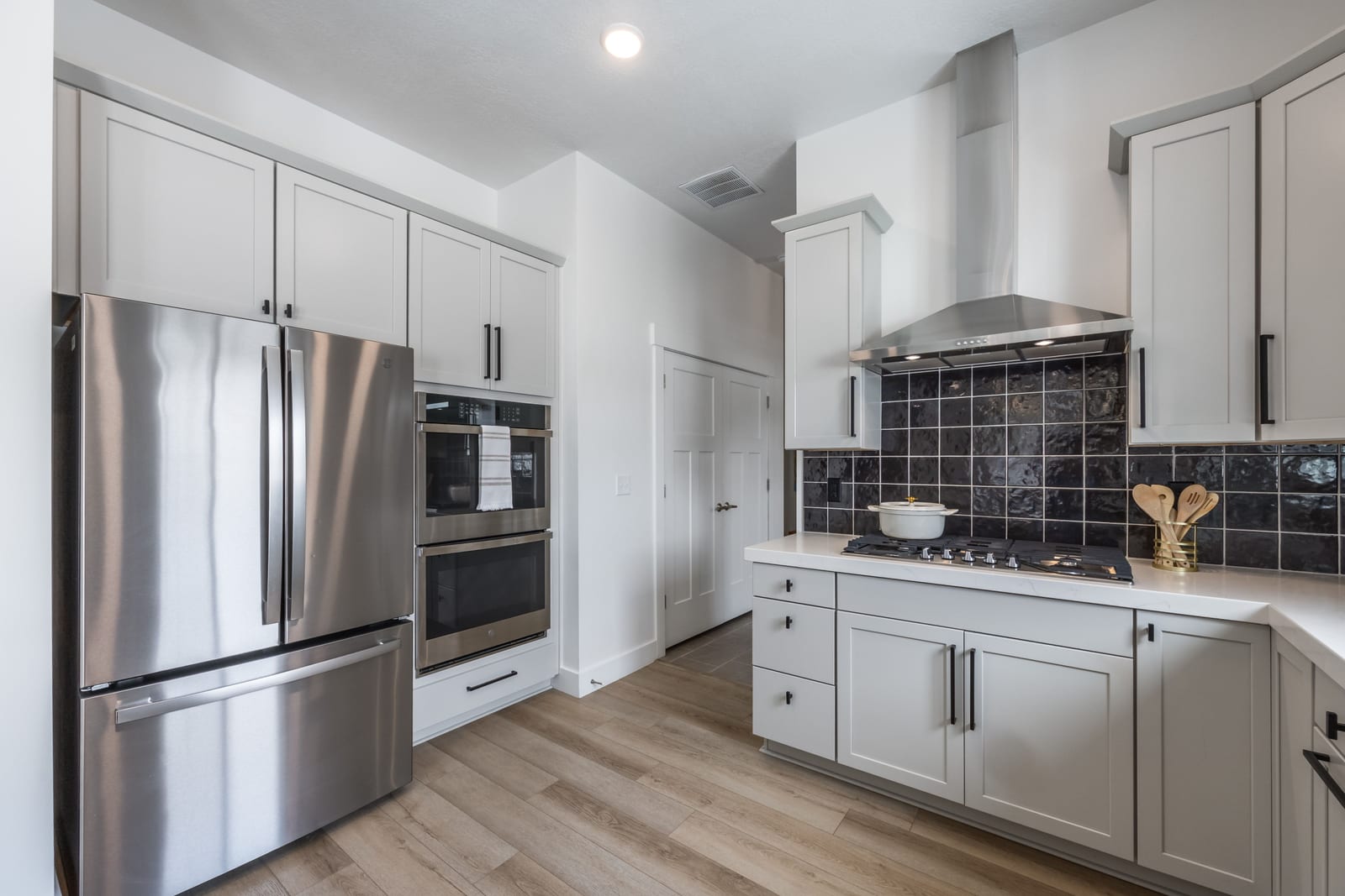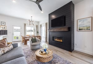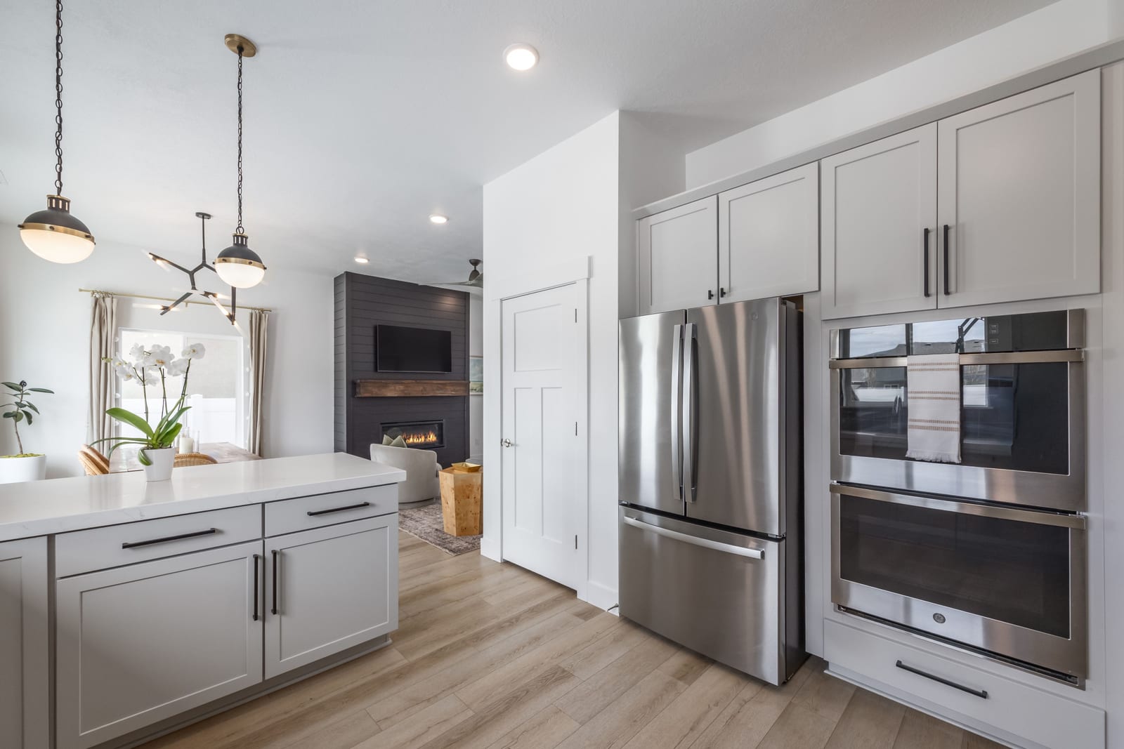 Inside the home unfolds with intention. The main level is anchored by 10-foot ceilings and a vaulted great room that draws in natural light, creating an airy, connected living space. A linear gas fireplace adds warmth and architectural texture, while designer lighting and quartz surfaces throughout elevate the everyday. The kitchen is both refined and highly functional, featuring upgraded shaker cabinetry, a full suite of appliances including double ovens with remote capability, and five-burner gas cooktop with vented hood. The primary suite is generously scaled, complete with a spa-inspired bath with soaking tub, dual vanities, and a walk-in closet. Three additional bedrooms and a large full bath offer flexibility for guests, work, or growing households.