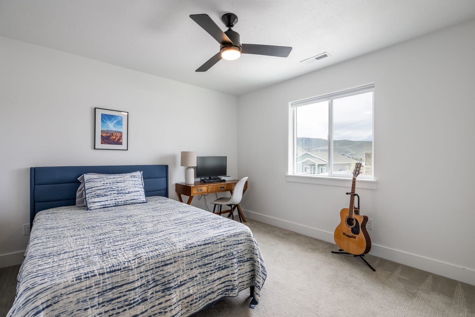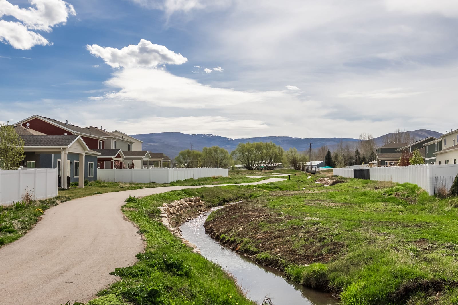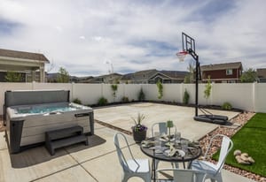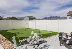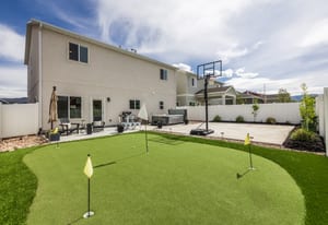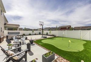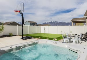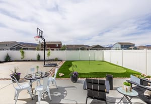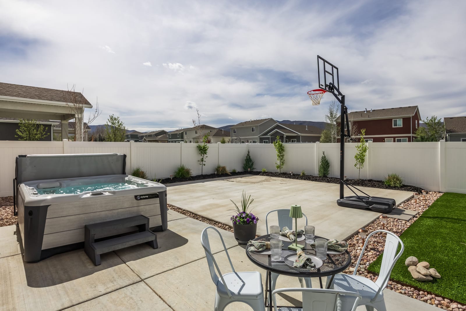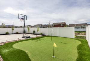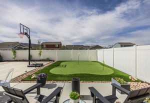 The fully fenced yard has been intentionally curated for low-maintenance living with xeriscape landscaping and drip irrigation, while still offering space to gather and play. A large patio stubbed for gas sets the stage for evenings outside, complemented by a custom putting green, a multi-use sport court, and a premium hot tub for year-round enjoyment. A rear gate opens directly to neighborhood amenities, extending your backyard into a larger community landscape. Walk to schools and easy access to Deer Valley’s East Village and Jordanelle Reservoir (15 minutes), Park City (25 minutes), and