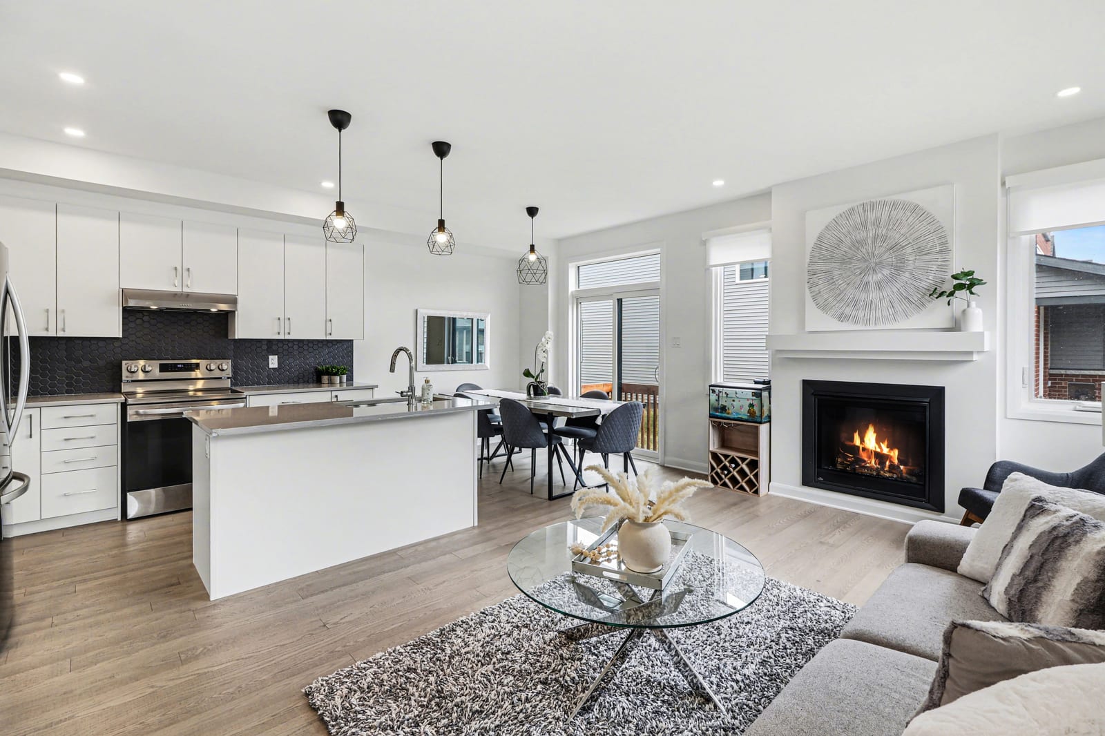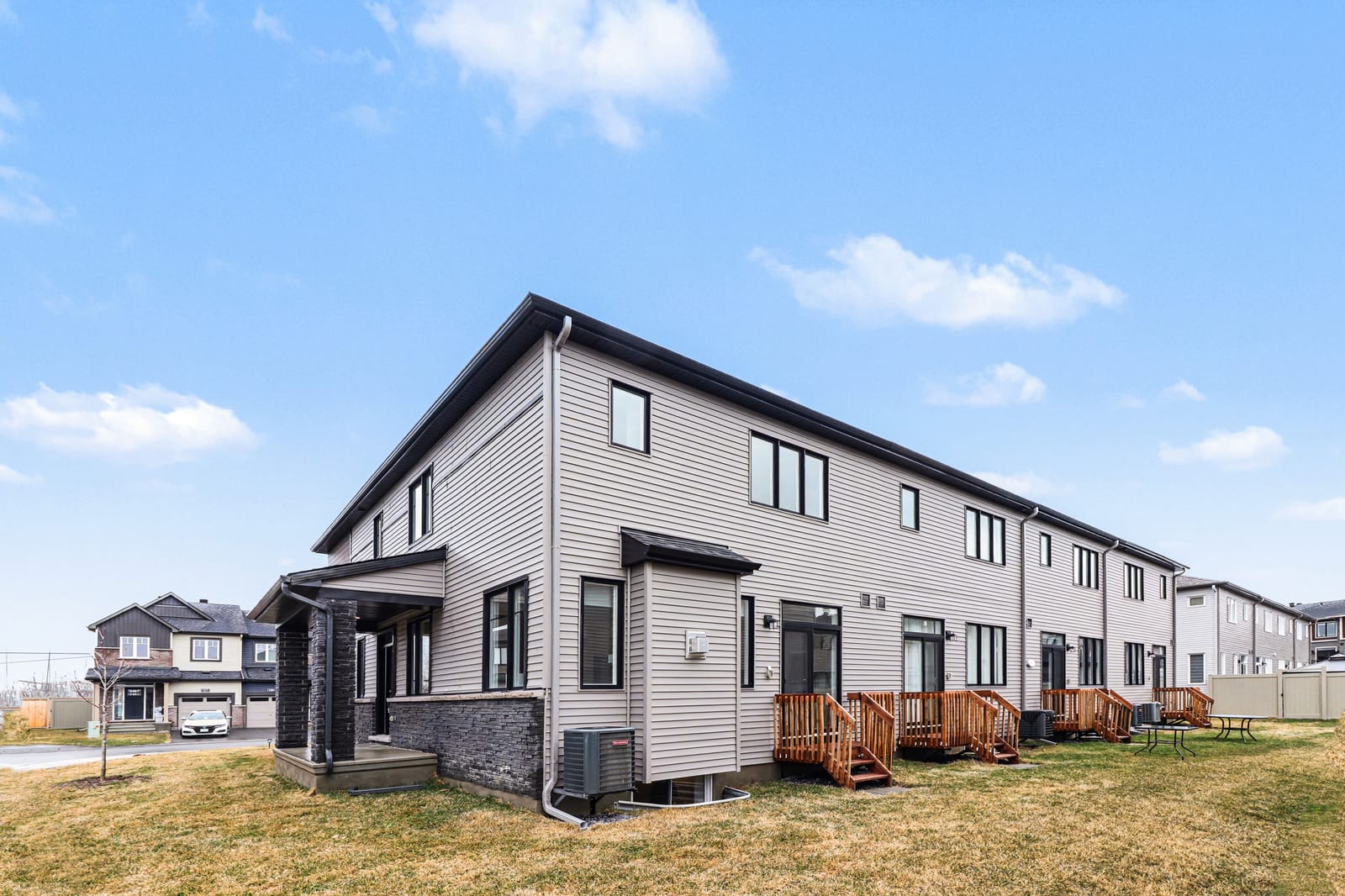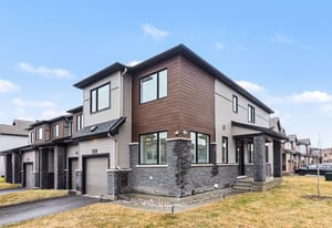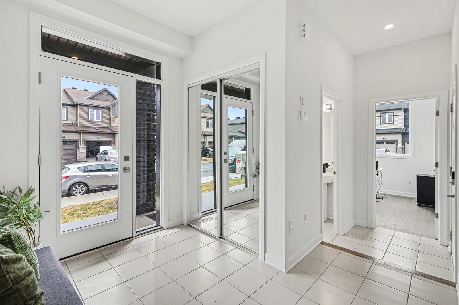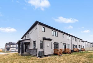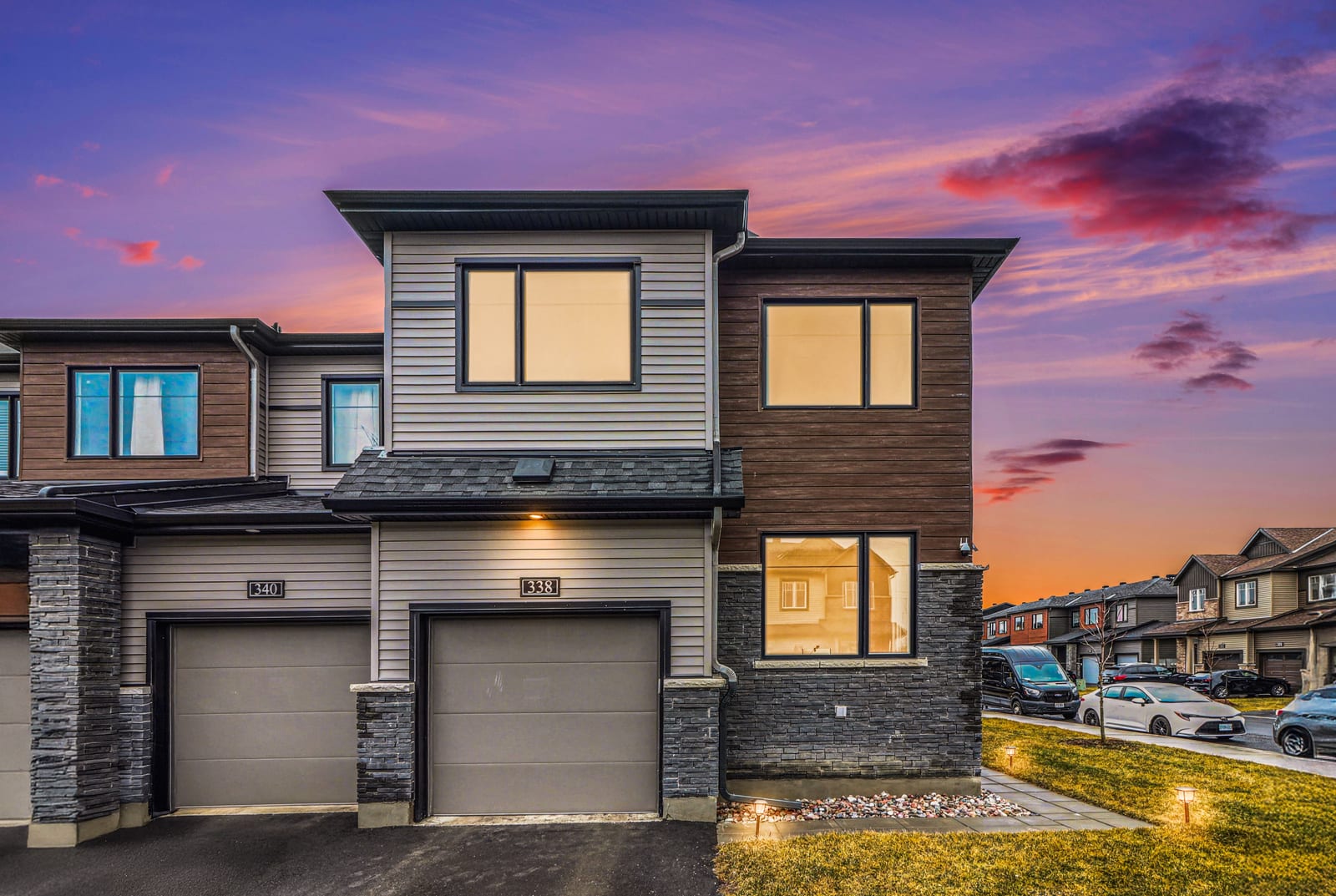 Corner unit with ideal south-west exposure, offering a bright, light-filled interior that is rarely found. Built in 2024, this upgraded end-unit townhouse features 2,218 sq ft of functional living space. The home offers a smart layout with a main floor corner room - ideal for a home office or guest space - plus 4 spacious bedrooms upstairs. Hardwood runs throughout the main level and bedrooms, with custom blinds on most windows.The main floor features 9' ceilings, pot lights, a cozy gas fireplace, and a modern kitchen with quartz countertops. Upstairs includes 4 well appointed bedrooms, including a bright primary with walk-in closet and ensuite with quarz counters and natural light, plus convenient second-floor laundry. The finished basement adds extra living space with a large window for natural light and a rare builder-upgraded powder room as well as storage space. Located in a growing, family-friendly neighbourhood with many amenities around the corner good walkability to nearby grocery, shops, services, parks, and everyday amenities along Tenth Line Road and Innes Road, plus easy access to transit and major routes.