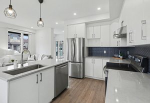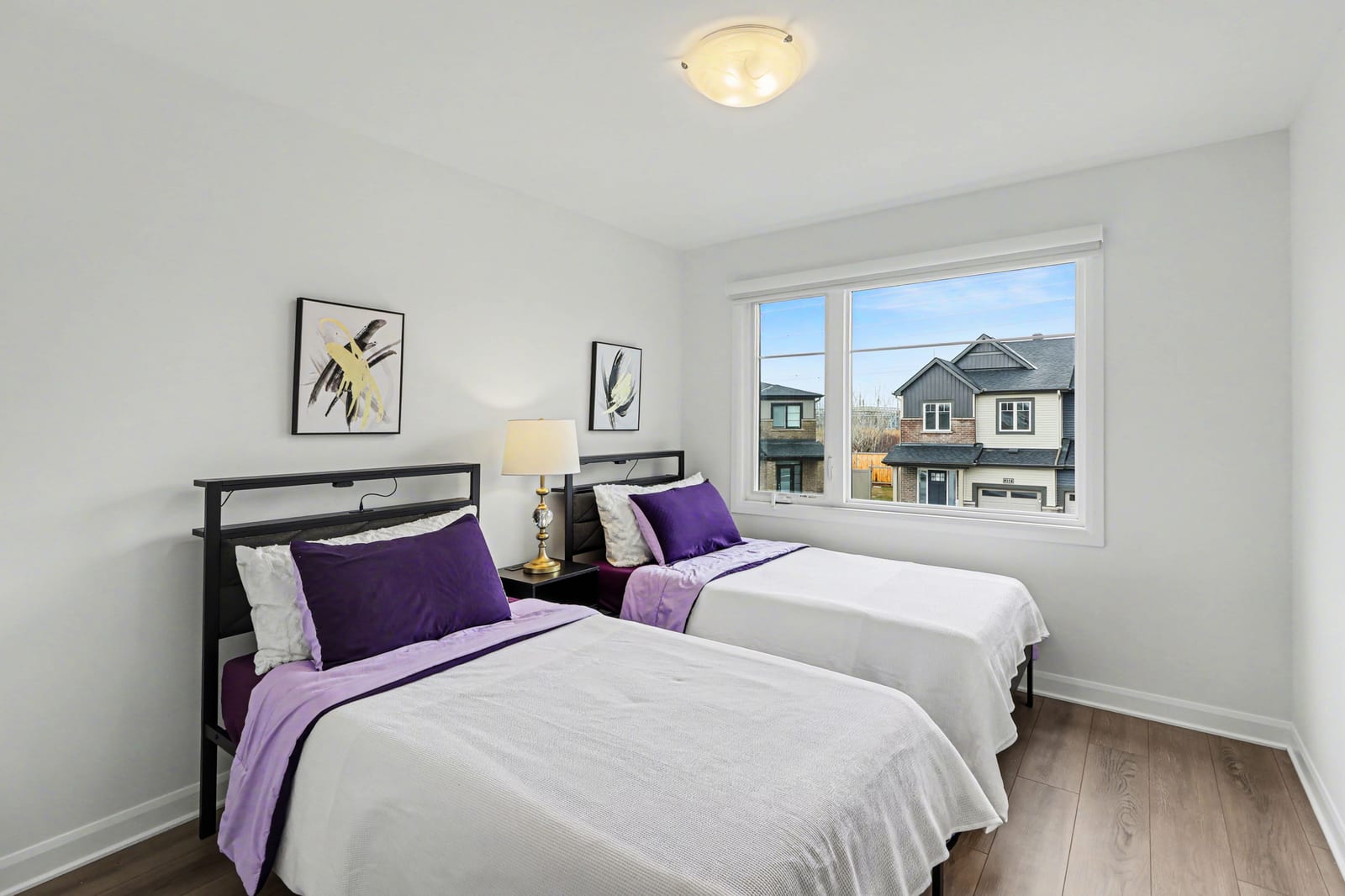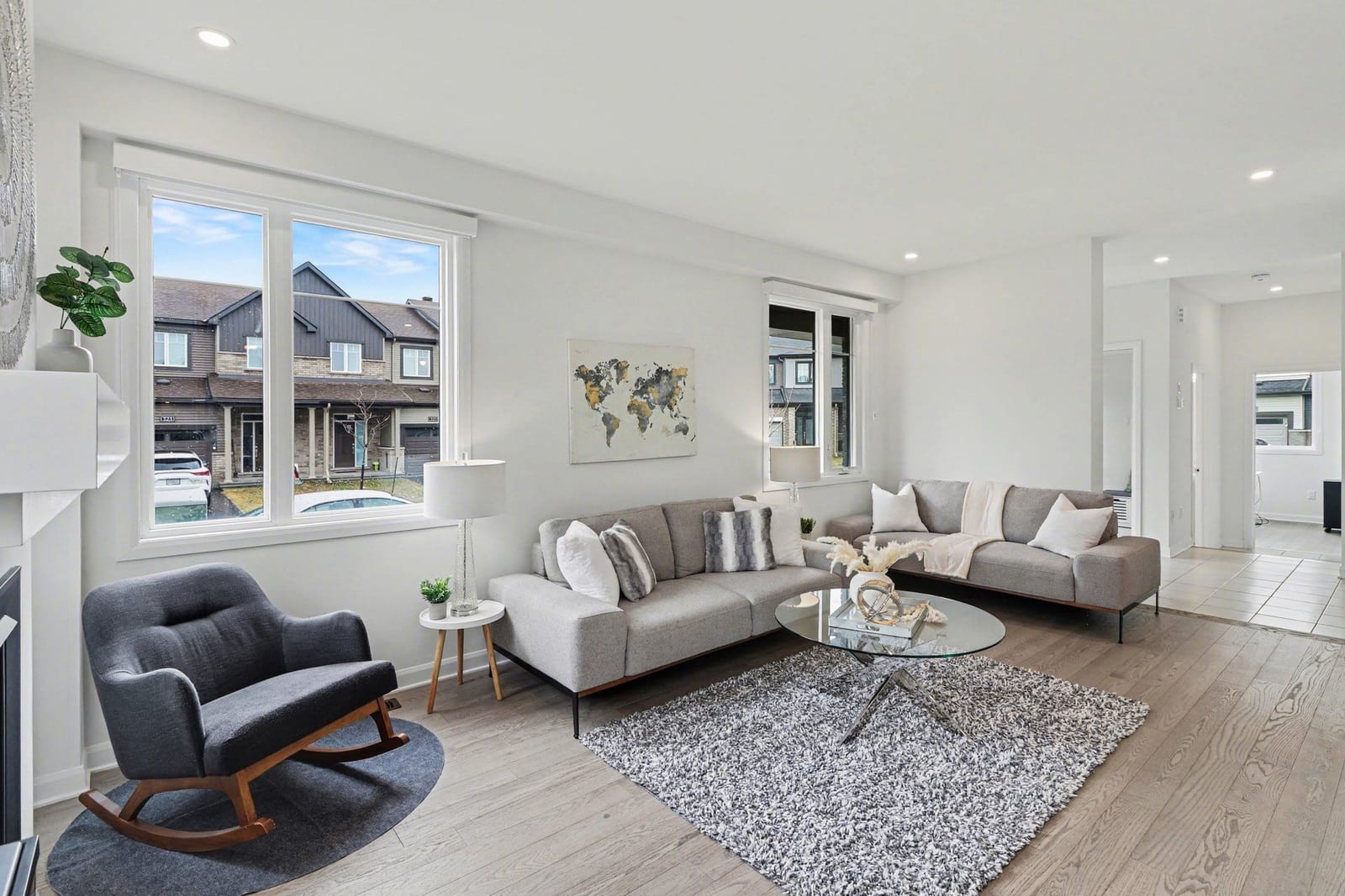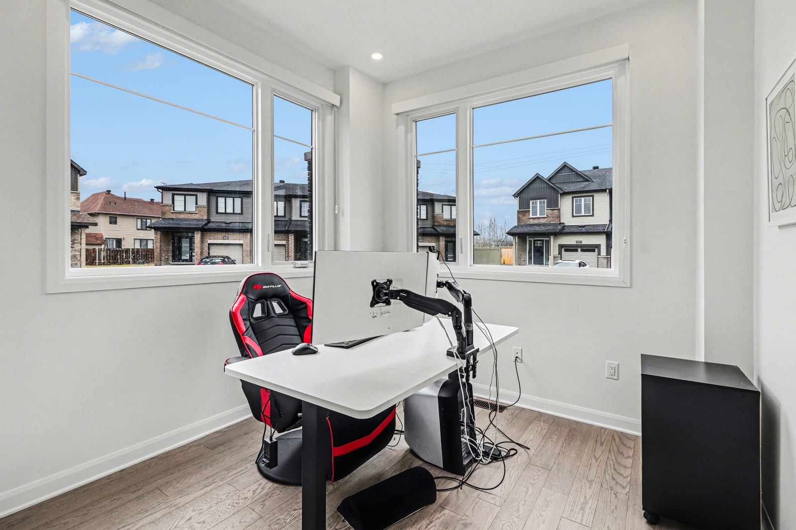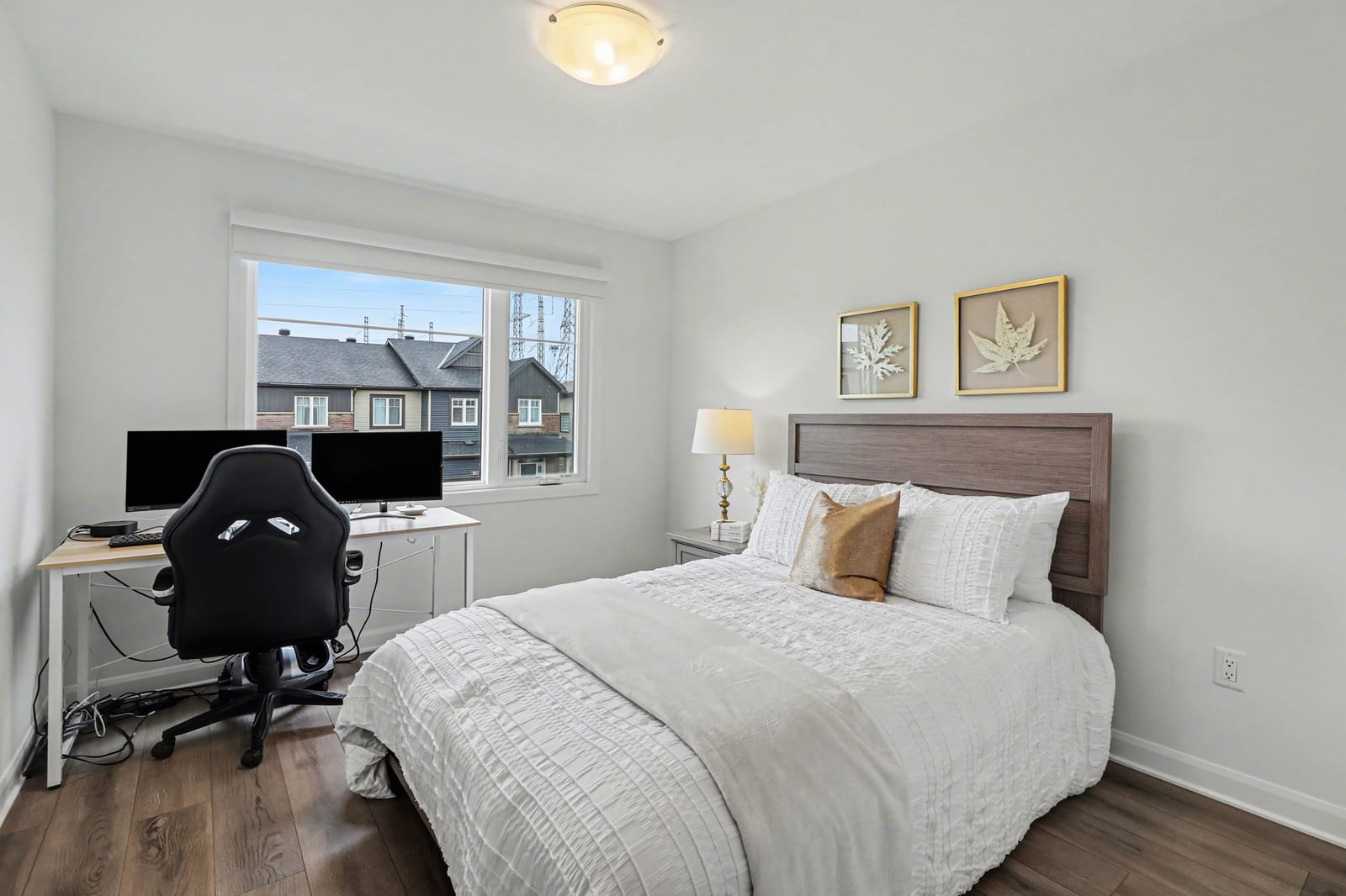 Corner unit with ideal south-west exposure, offering a bright, light-filled interior that is rarely found. Built in 2024, this upgraded end-unit townhouse features 2,218 sq ft of functional living space. The home offers a smart layout with a main floor corner room - ideal for a home office or guest space - plus 4 spacious bedrooms upstairs. Hardwood runs throughout the main level and bedrooms, with custom blinds on most windows.The main floor features 9' ceilings, pot lights, a cozy gas fireplace, and a modern kitchen with quartz countertops. Upstairs includes 4 well appointed bedrooms, including a bright primary with walk-in closet and ensuite with quarz counters and natural light, plus convenient second-floor laundry. The finished basement adds extra living space with a large window for natural light and a rare builder-upgraded powder room as well as storage space. Located in a growing, family-friendly neighbourhood with many amenities around the corner good walkability to nearby grocery, shops, services, parks, and everyday amenities along Tenth Line Road and Innes Road, plus easy access to transit and major routes.