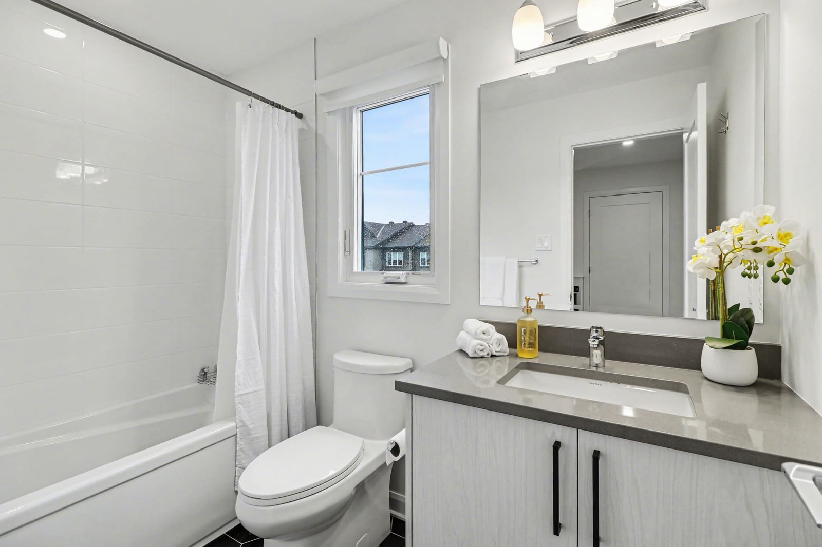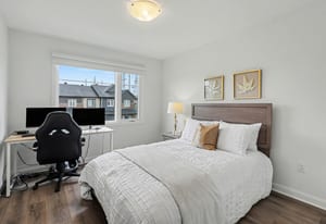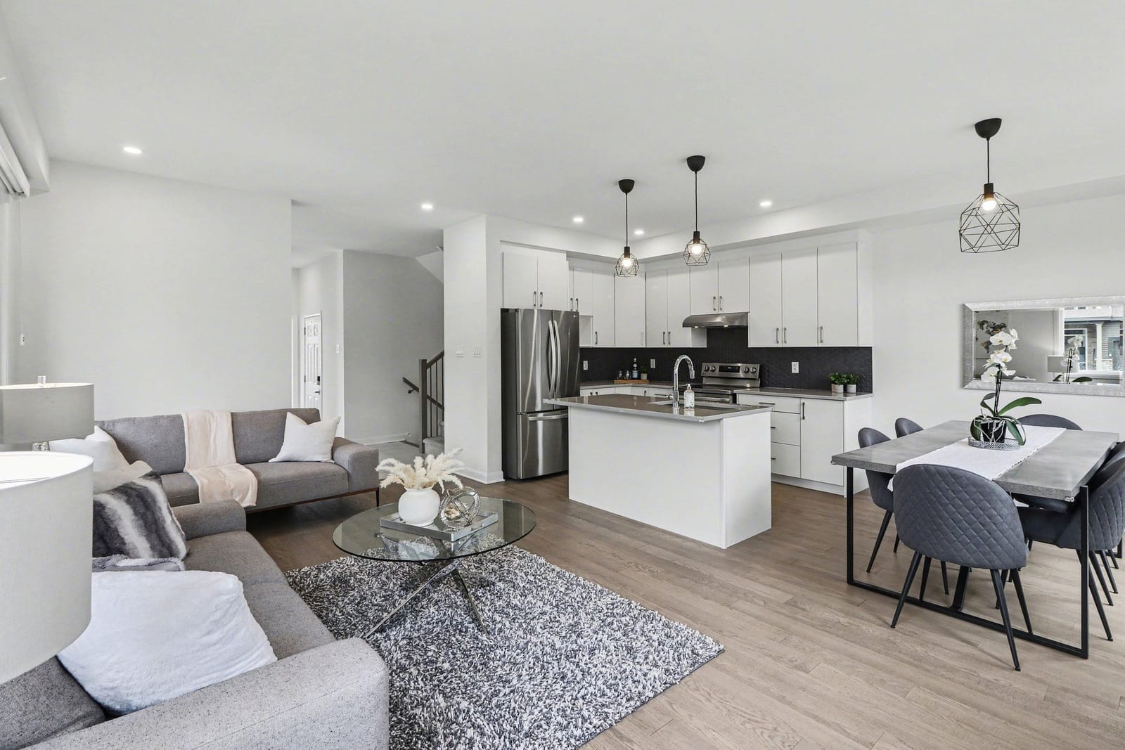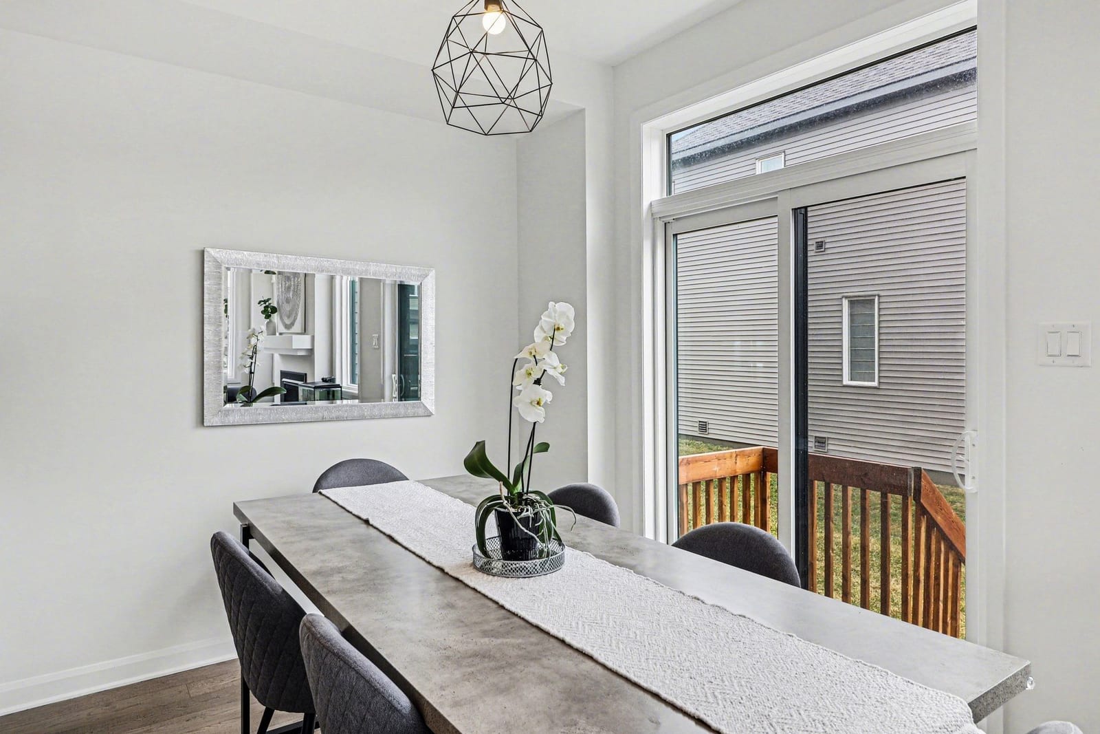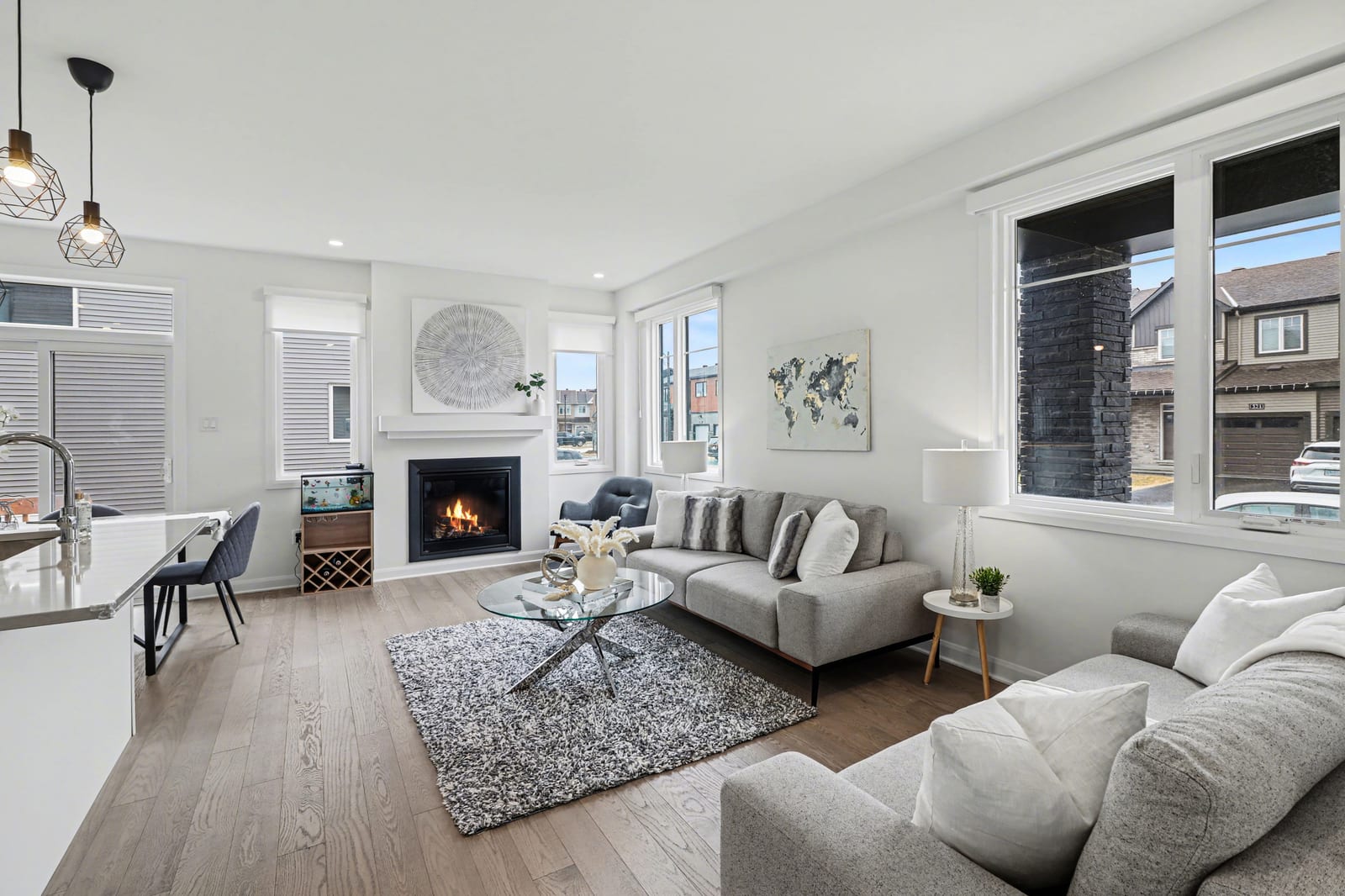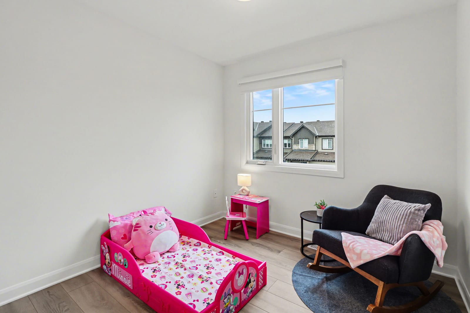 Corner unit with ideal south-west exposure, offering a bright, light-filled interior that is rarely found. Built in 2024, this upgraded end-unit townhouse features 2,218 sq ft of functional living space. The home offers a smart layout with a main floor corner room - ideal for a home office or guest space - plus 4 spacious bedrooms upstairs. Hardwood runs throughout the main level and bedrooms, with custom blinds on most windows.The main floor features 9' ceilings, pot lights, a cozy gas fireplace, and a modern kitchen with quartz countertops. Upstairs includes 4 well appointed bedrooms, including a bright primary with walk-in closet and ensuite with quarz counters and natural light, plus convenient second-floor laundry. The finished basement adds extra living space with a large window for natural light and a rare builder-upgraded powder room as well as storage space. Located in a growing, family-friendly neighbourhood with many amenities around the corner good walkability to nearby grocery, shops, services, parks, and everyday amenities along Tenth Line Road and Innes Road, plus easy access to transit and major routes.