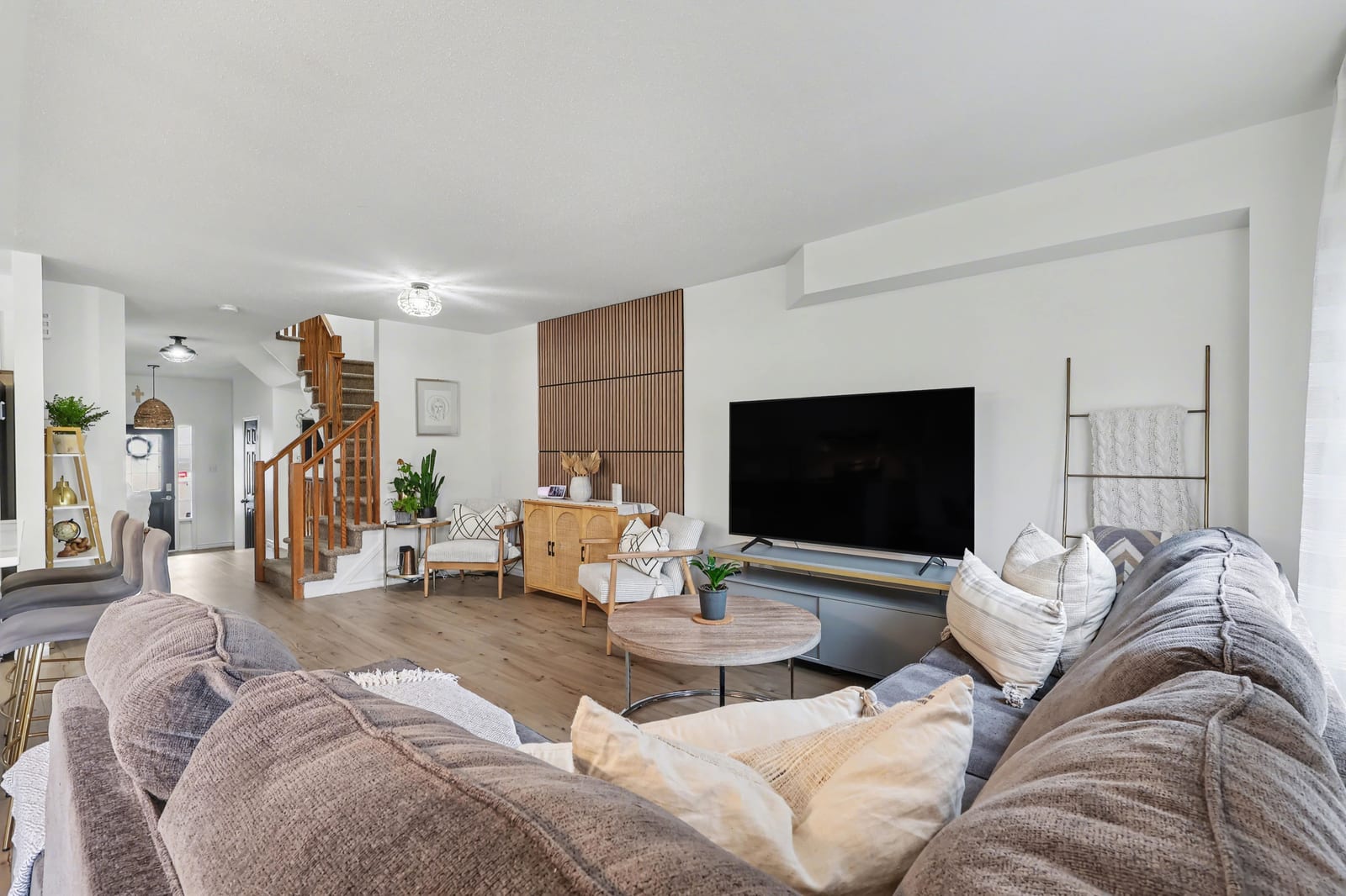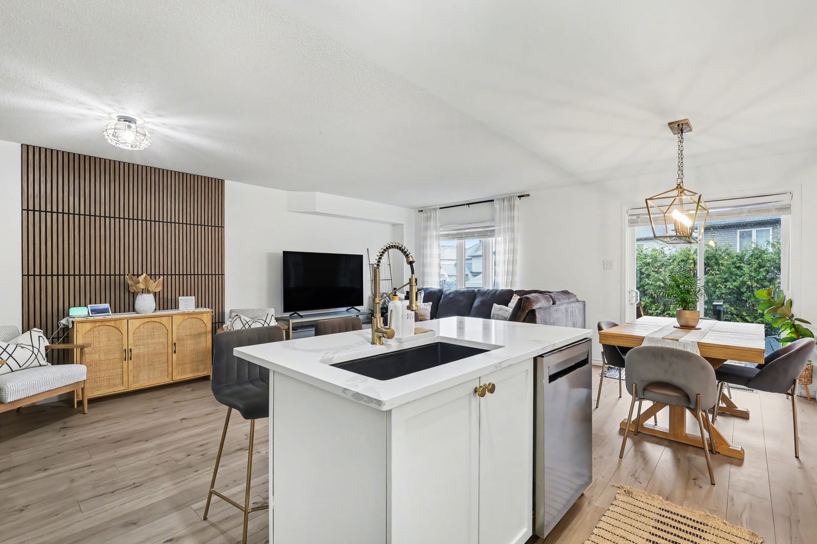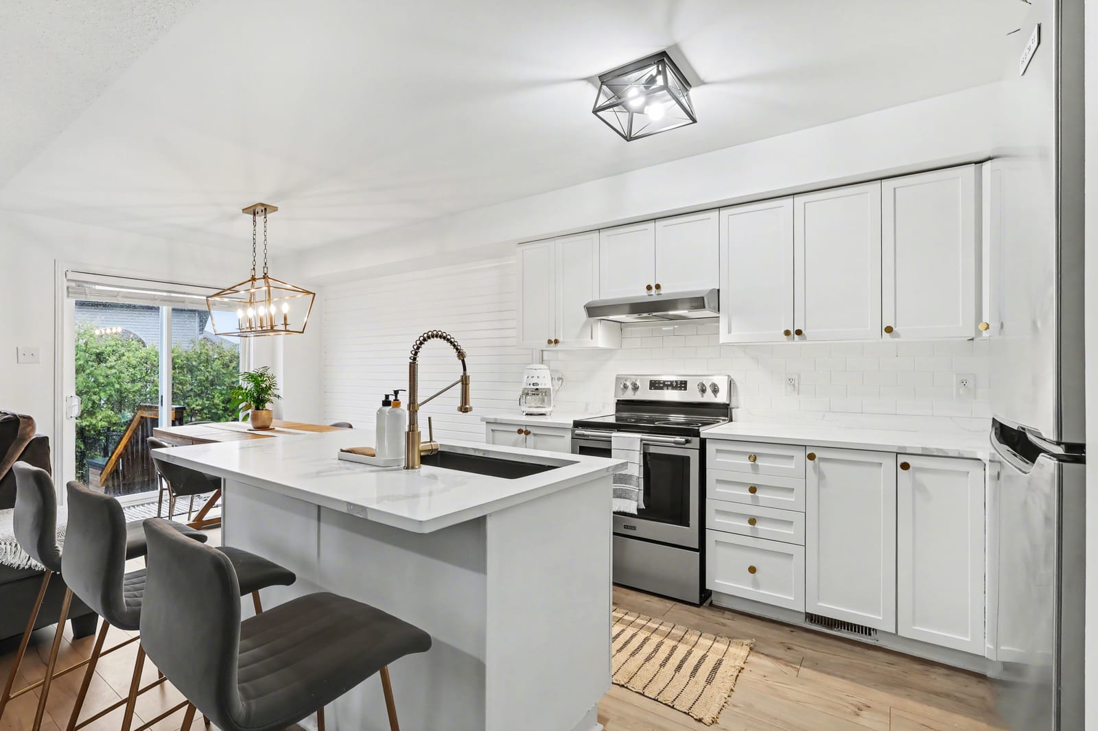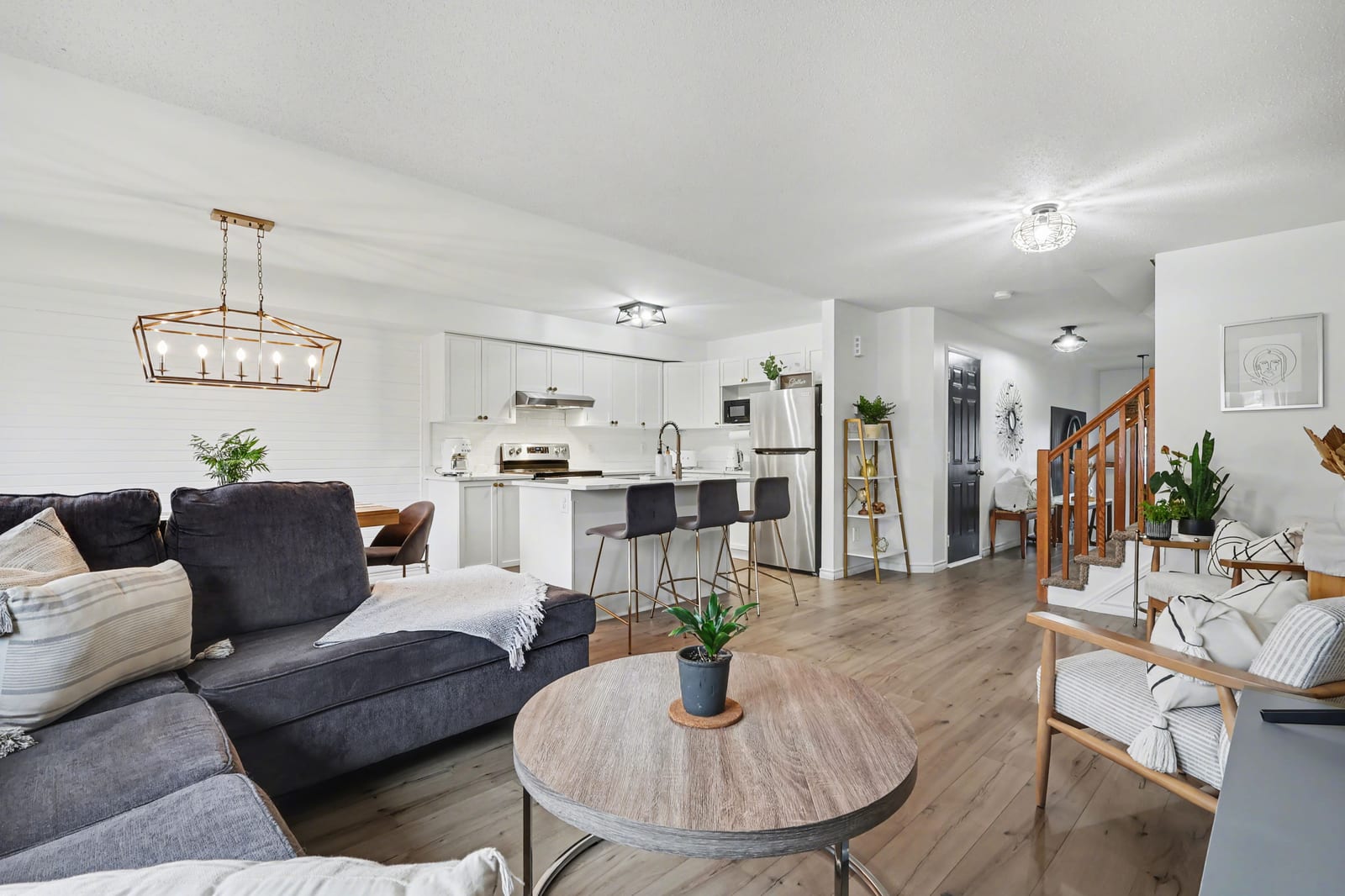 Step inside to a bright, open-concept main floor designed for everyday living and entertaining. The kitchen is a standout with quartz countertops, a farmhouse sink, eat-in island, and plenty of cabinetry, all flooded with natural light from large windows and a patio door leading to your private backyard with deck and fencing.