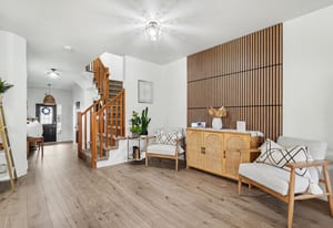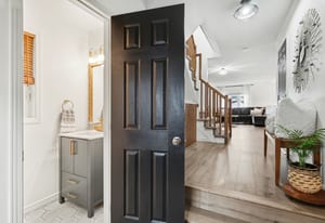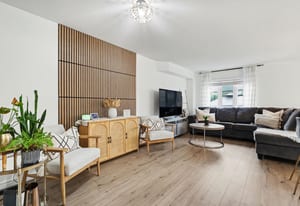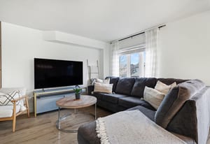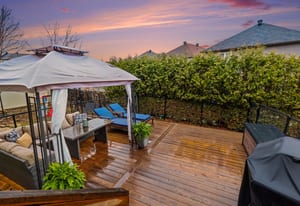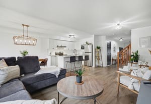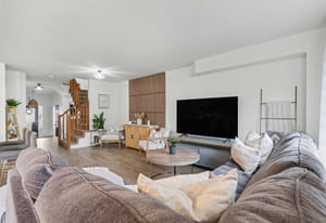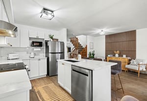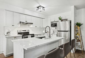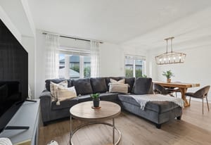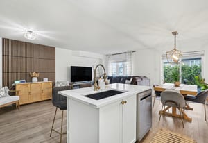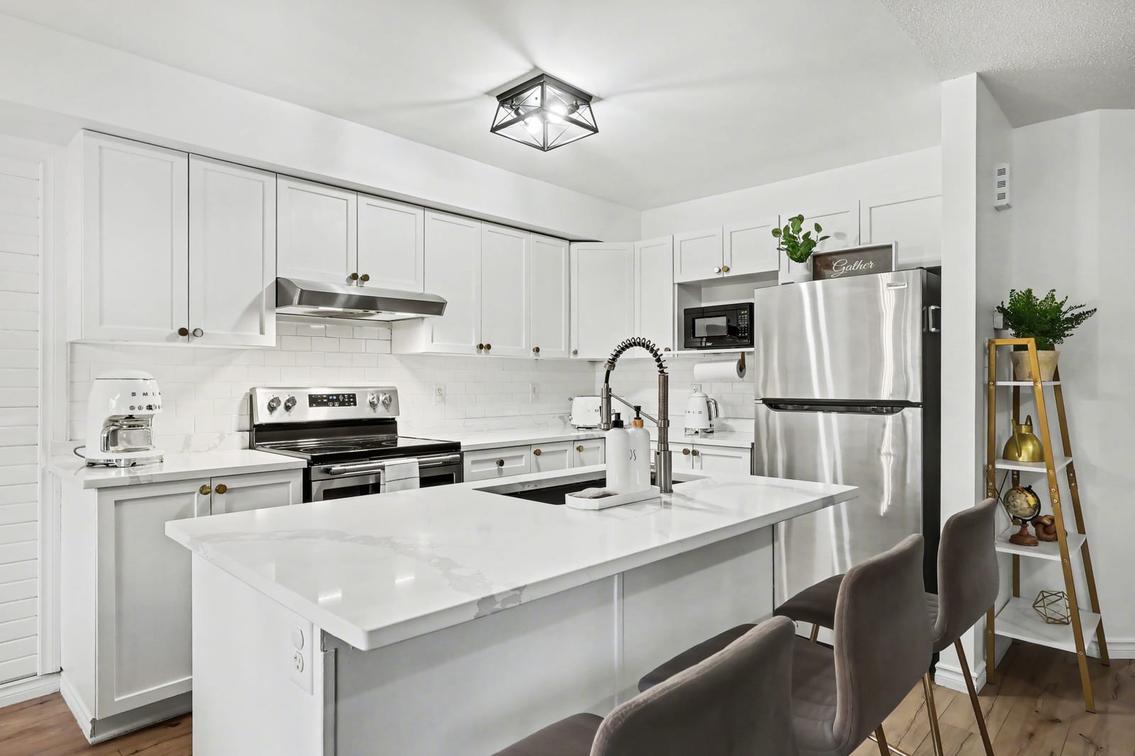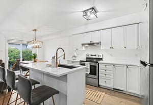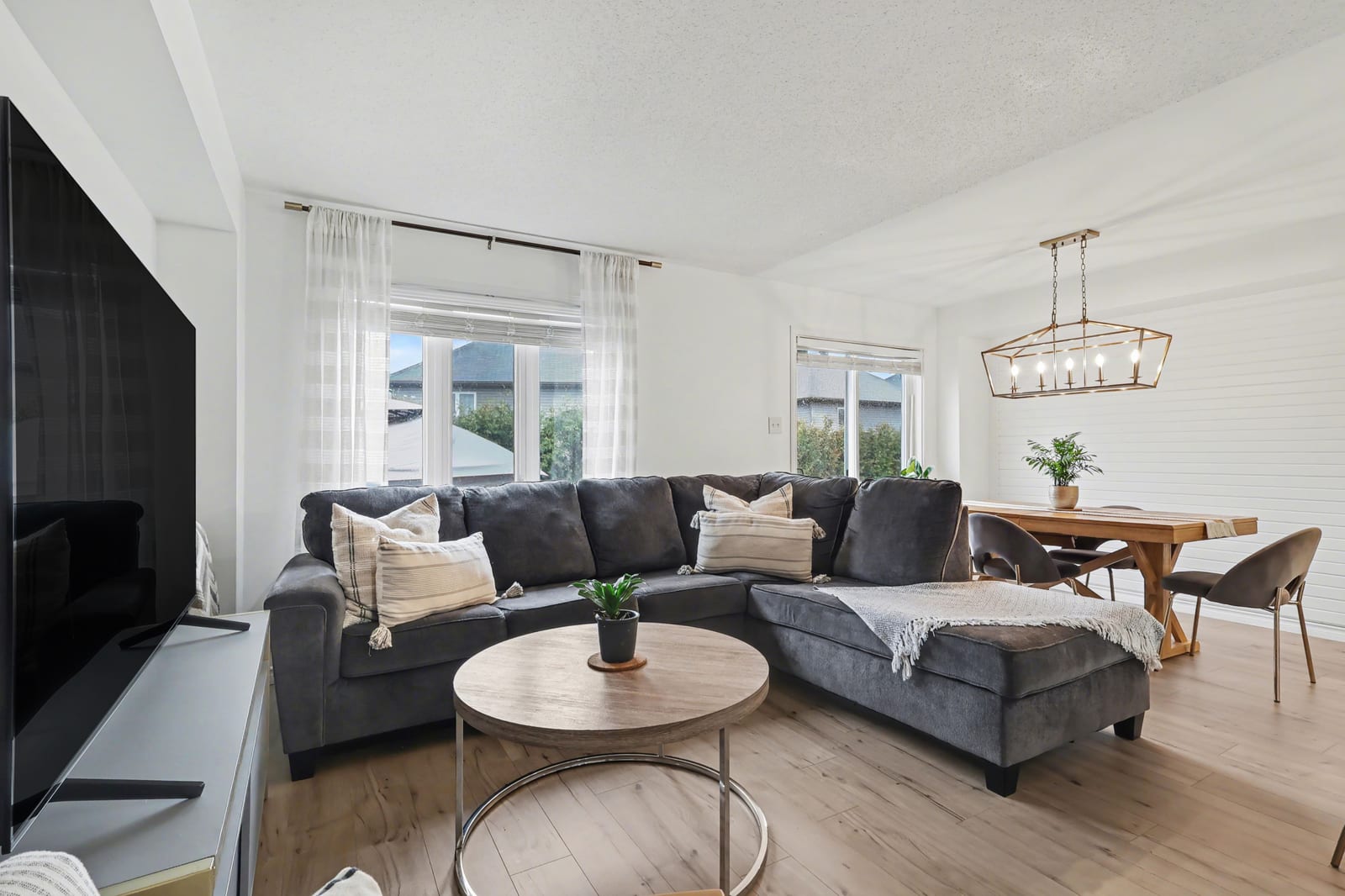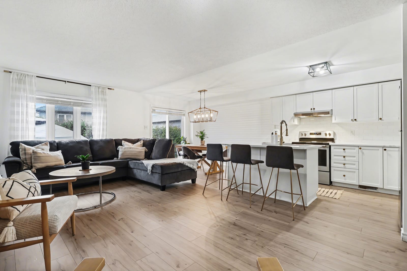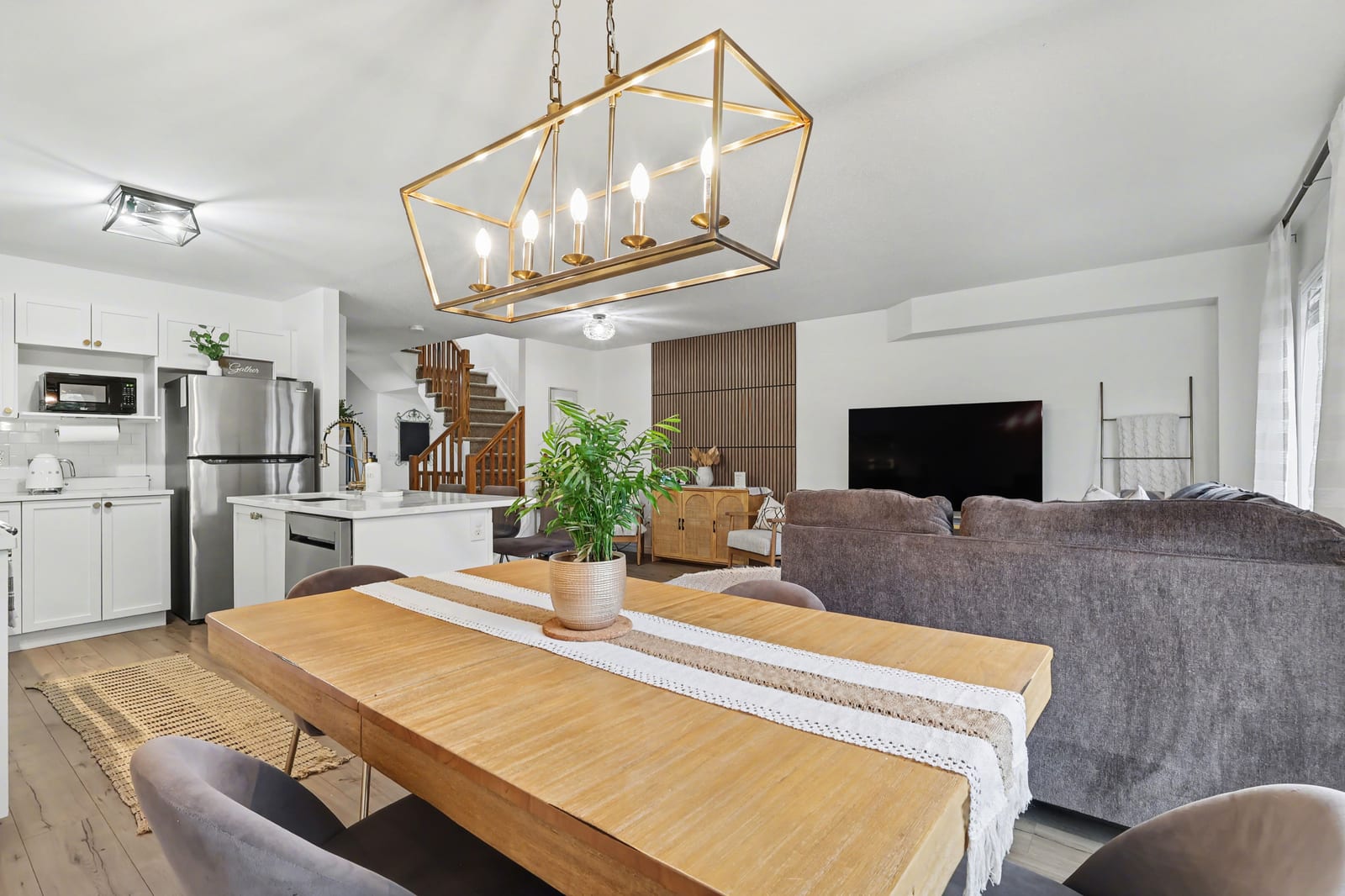 Step inside to a bright, open-concept main floor designed for everyday living and entertaining. The kitchen is a standout with quartz countertops, a farmhouse sink, eat-in island, and plenty of cabinetry, all flooded with natural light from large windows and a patio door leading to your private backyard with deck and fencing.