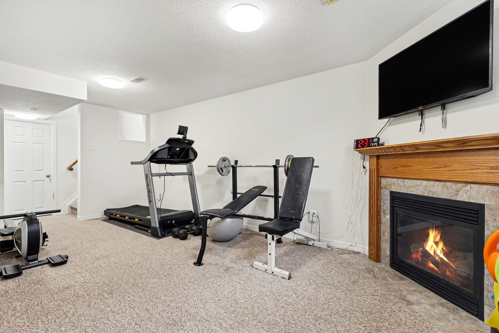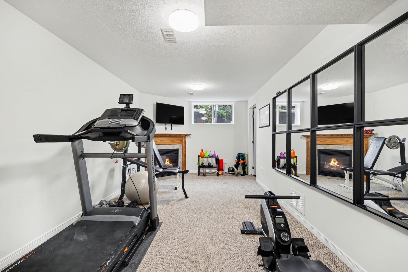 Upstairs, the spacious primary retreat features a walk-in closet and a beautifully updated ensuite with glass shower and modern finishes. Two additional bedrooms and a full bathroom complete the level. The fully finished basement adds even more living space with a cozy fireplace, perfect for movie nights or hosting friends and family.