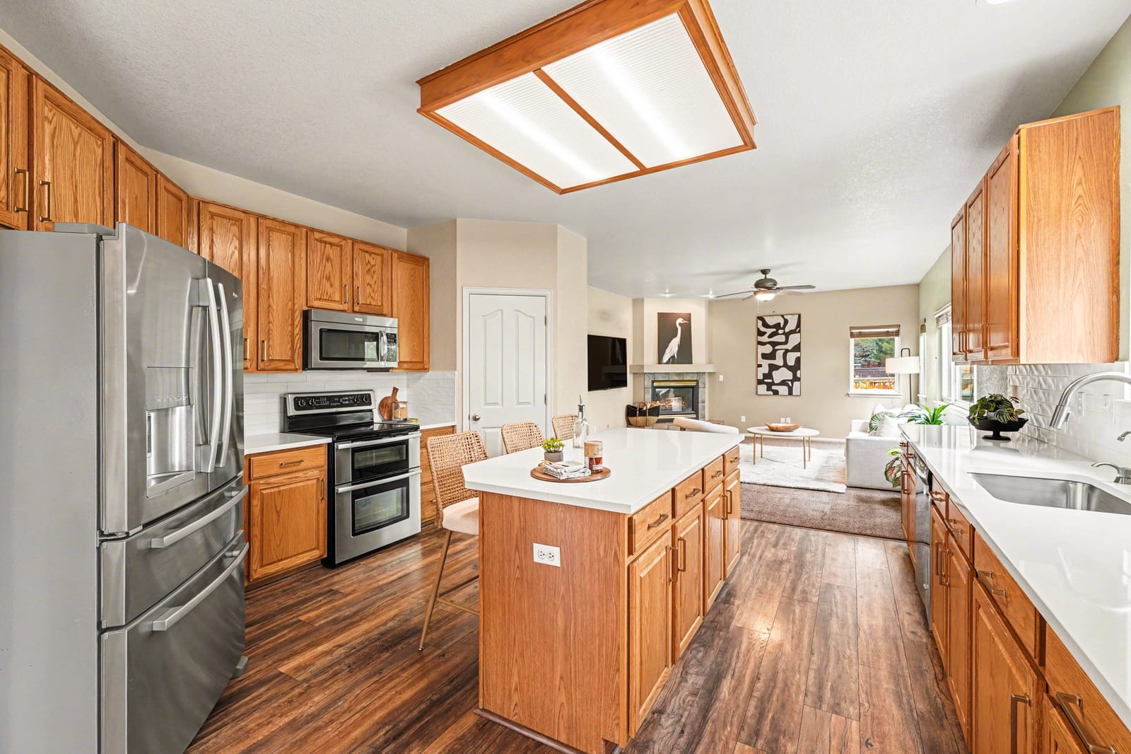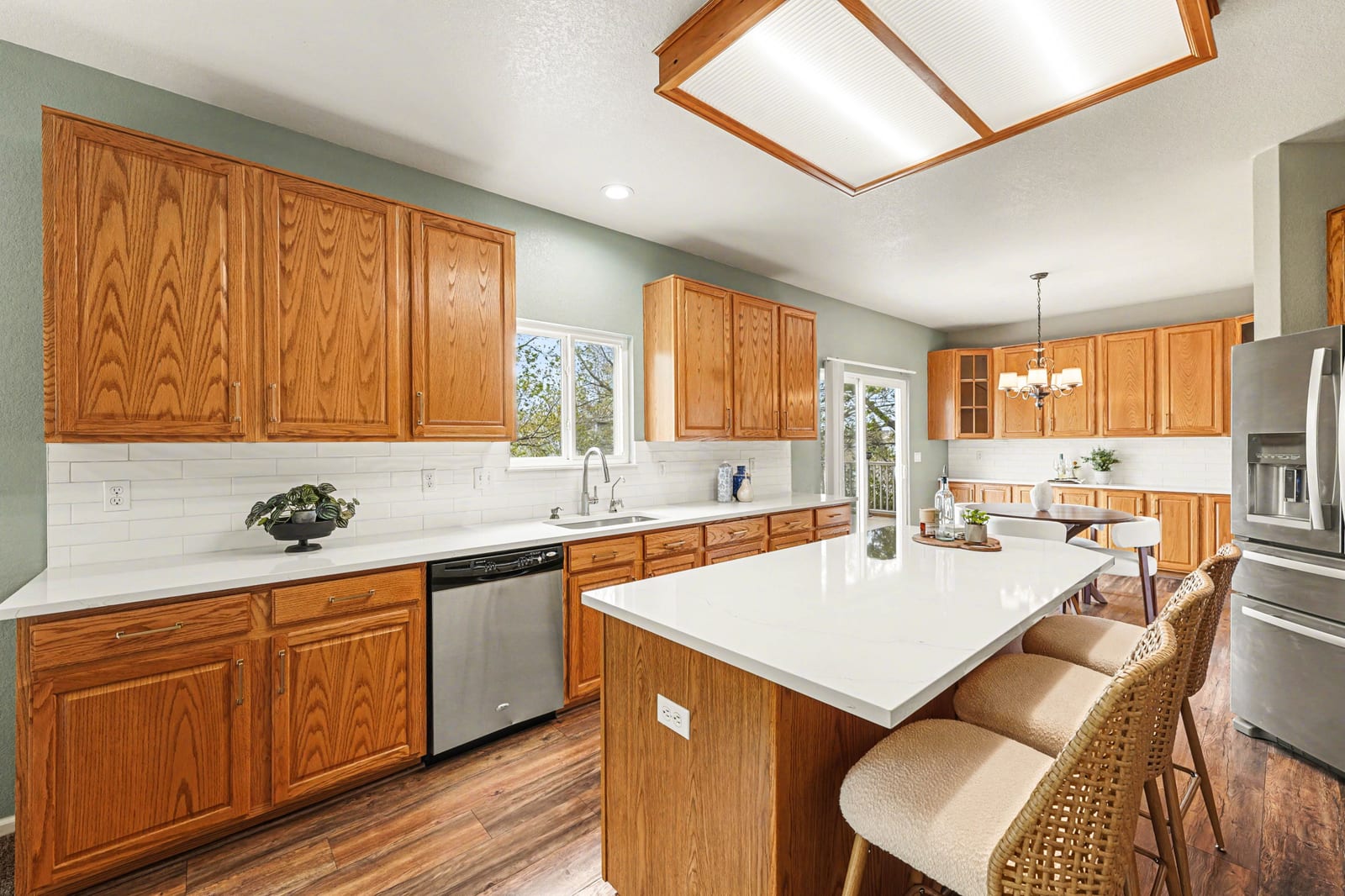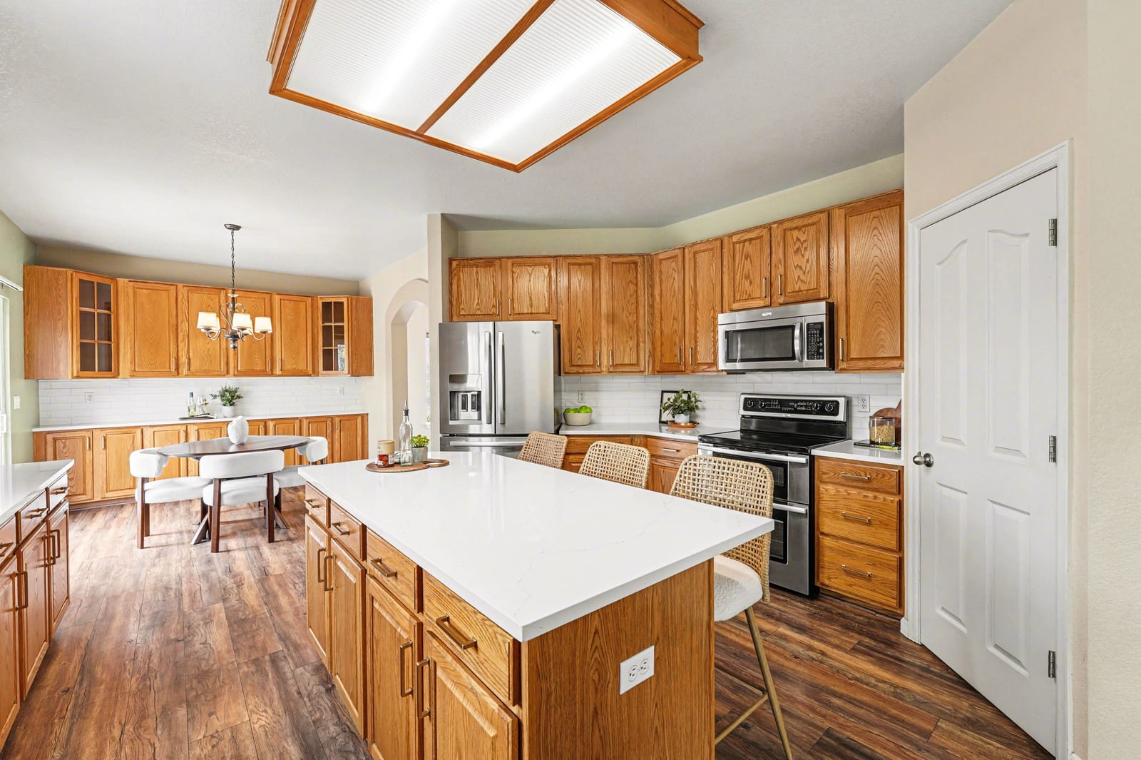 As you enter, you are greeted by a grand foyer featuring a sweeping curved staircase and vaulted ceilings. The main floor is thoughtfully designed for modern living, offering an open great room and a private office. The family room, with its cozy gas burning fireplace and included wall-mounted television, flows seamlessly into a gourmet kitchen that is a chef’s delight. Boasting tons of counterspace from gorgeous, new quartz countertops and stylish tile backsplashes, 42-inch upper cabinets, a central island, and a walk-in pantry, this kitchen provides both beauty and utility.