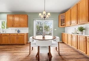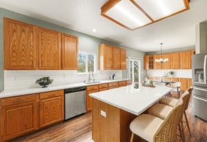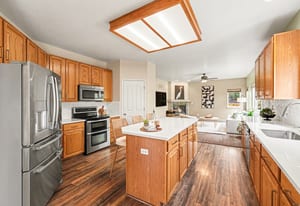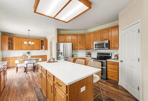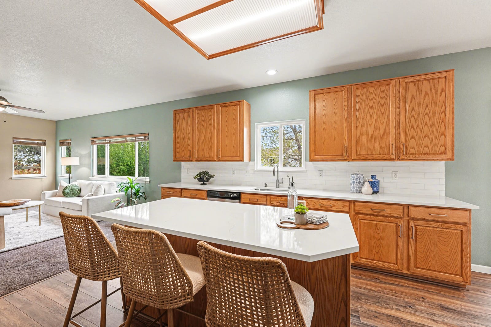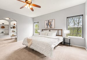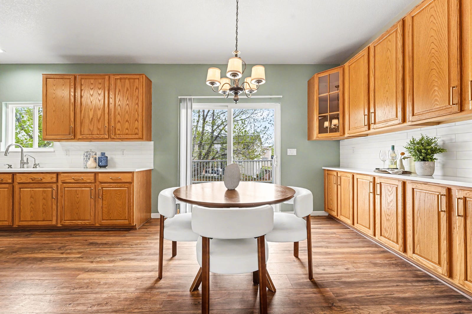 As you enter, you are greeted by a grand foyer featuring a sweeping curved staircase and vaulted ceilings. The main floor is thoughtfully designed for modern living, offering an open great room and a private office. The family room, with its cozy gas burning fireplace and included wall-mounted television, flows seamlessly into a gourmet kitchen that is a chef’s delight. Boasting tons of counterspace from gorgeous, new quartz countertops and stylish tile backsplashes, 42-inch upper cabinets, a central island, and a walk-in pantry, this kitchen provides both beauty and utility.