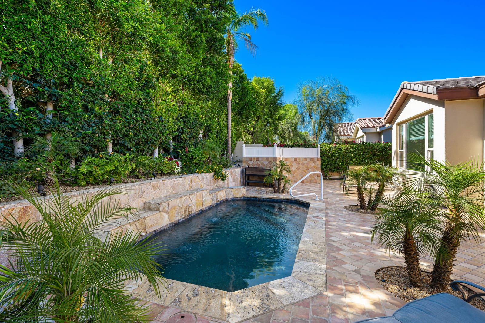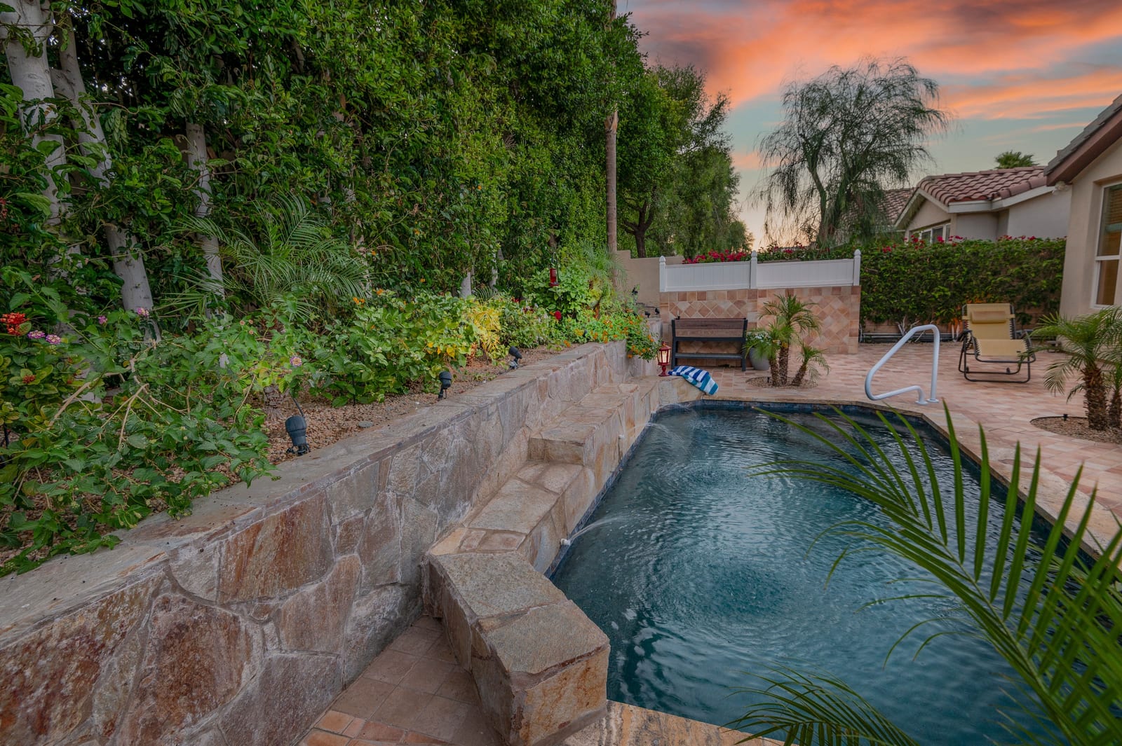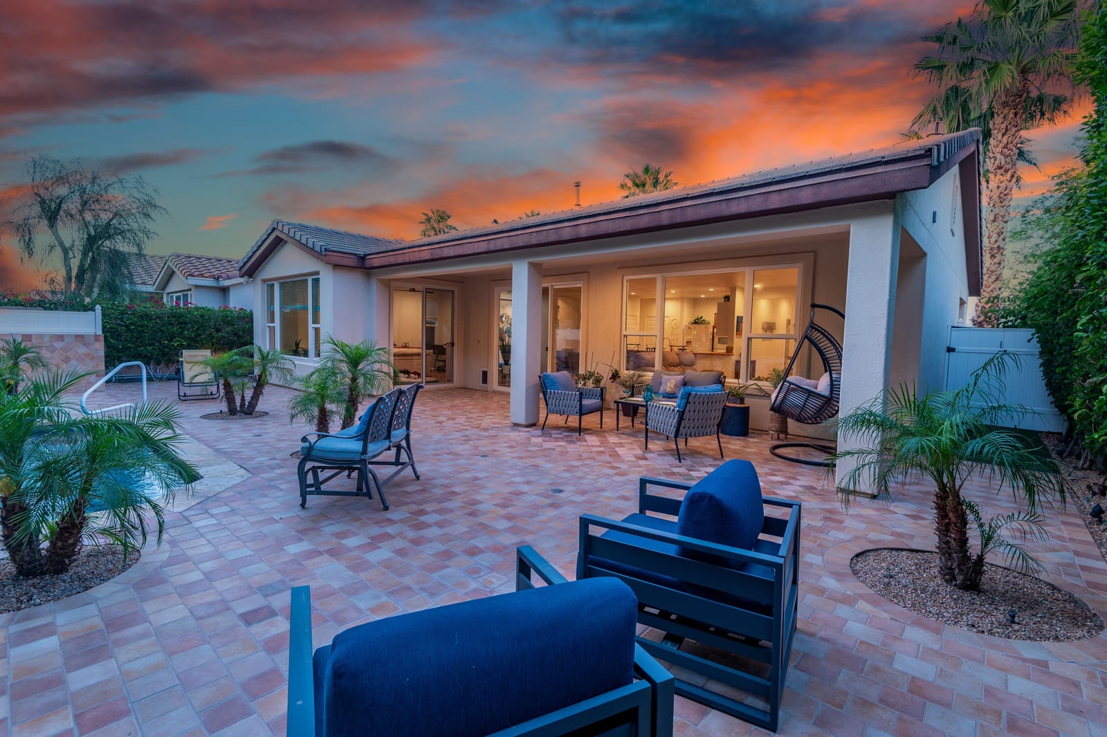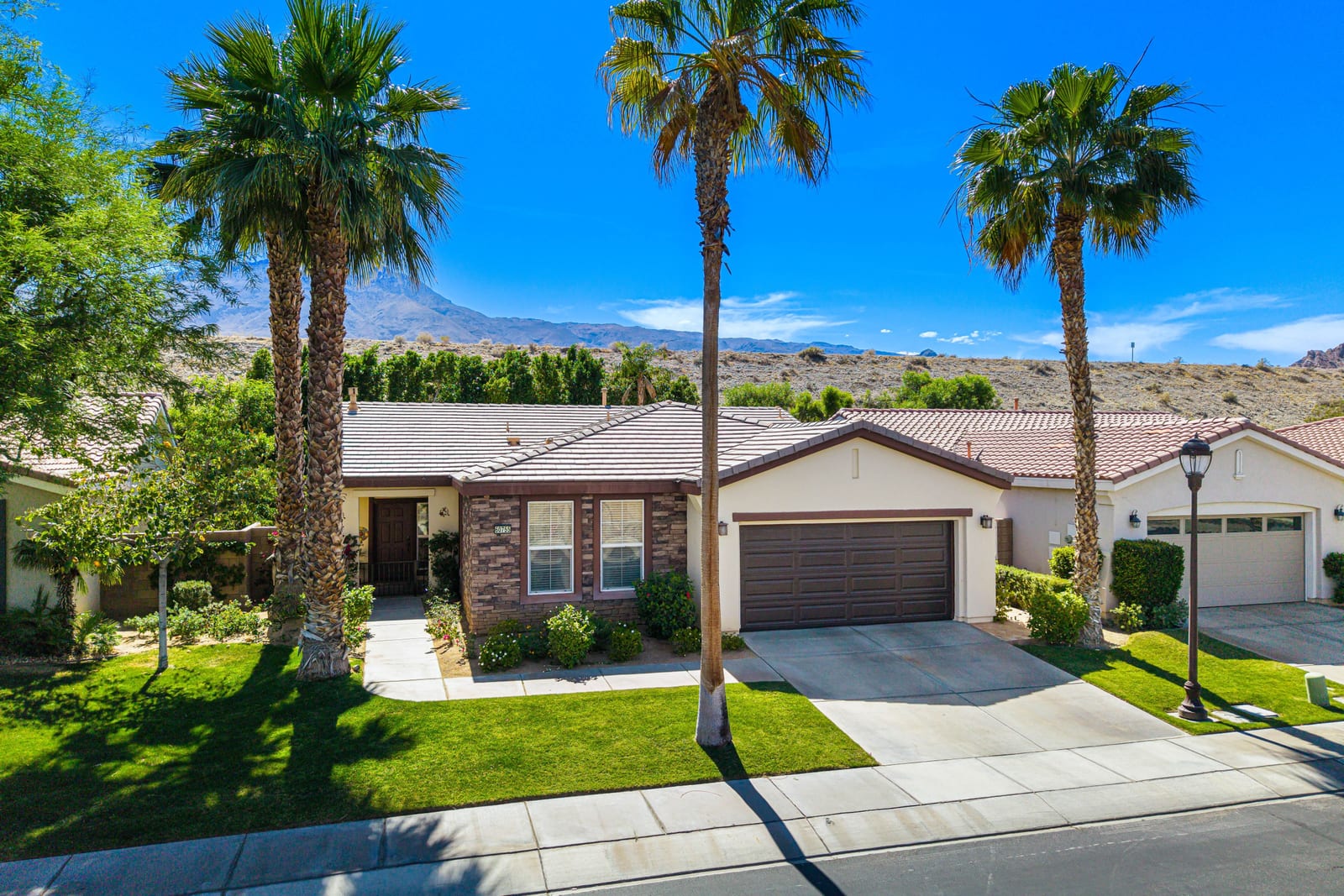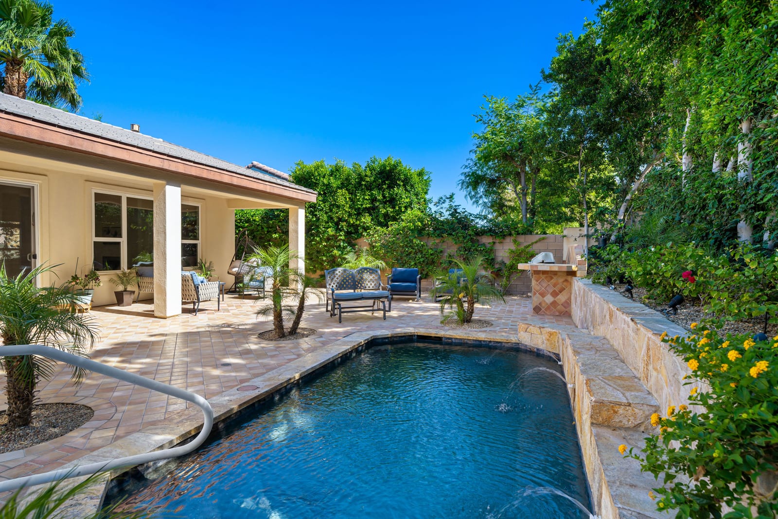 Located at the Trilogy Golf Club at La Quinta, this Oasis model pool/spa home with 1,580 square feet, 2-bedrooms and 2 baths draw from the rich heritage of American Southwestern and Mediterranean interior design, with a fresh contemporary flair. Modern energy saving appliances and interior home systems keep the home comfortable and cost efficient year-round and include a new HVAC system, ceiling fans, tankless water heater, dishwasher, and Culligan reverse osmosis filtration system. Outdoors, the saltwater pool/spa with soothing jets is resurfaced with blue pebble-tec and has new pumps. The lush backyard landscape is kept green and vibrant with a new irrigation system, and pets love the low-maintenance, forever grass along the side yards. As the sun sets and darkness descends the spa shimmers an ethereal blue, and flowers, feathery palms and tall ficus trees glow from a variety of ground spots and uplights. The home is bright and airy with tall ceilings, and large windows and sliders that bring in the beauty of the backyard spa, expansive patio and exquisite landscape. Inside, earthy colored tile floors are counterbalanced with creamy white walls, a white floor to ceiling stone and raised hearth gas log fireplace. Ceiling spotlights in the great room and dining area nooks show off your cherished works of art and furnishings. The kitchen is beautifully designed for ease of cooking and entertaining with views and easy access to all dining areas. The kitchen is fitted with quality solid wood lower cabinets, tile countertops and backsplash punctuated with new clean white soft-close cabinets. A center workspace and handsome custom-made wood coffee bar adds to the comfort and pleasures of the home. The primary bedroom suite is spacious with a bay window overlooking the pool and yard. The roomy bath features double sinks, a walk-in shower and walk-in closet. A separate guest bedroom on the opposite side of the home has a mirrored sliding closet, and a full bath nearby. This stunning outdoor living space is a luxurious private oasis with large sunken jetted spa, three fountains, an expansive patio and mini palms. A professional outdoor barbecue station is the dream of every outdoor chef. The garage is extra-large with durable and easy to clean and tile flooring and fits 2-cars and a golf cart. Need additional workspace? The garage is retrofitted with existing duct work to add air conditioning and heat.