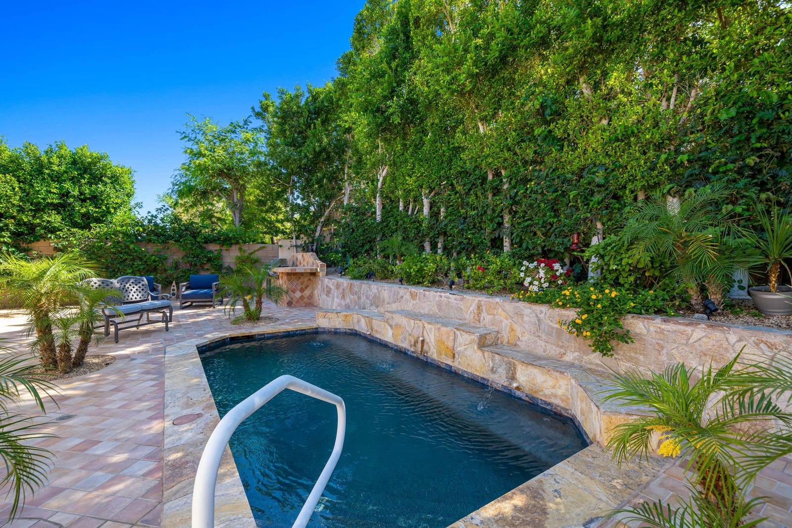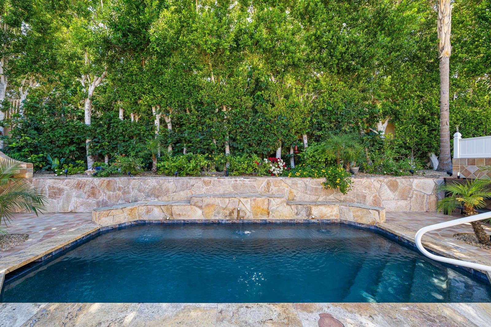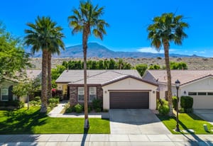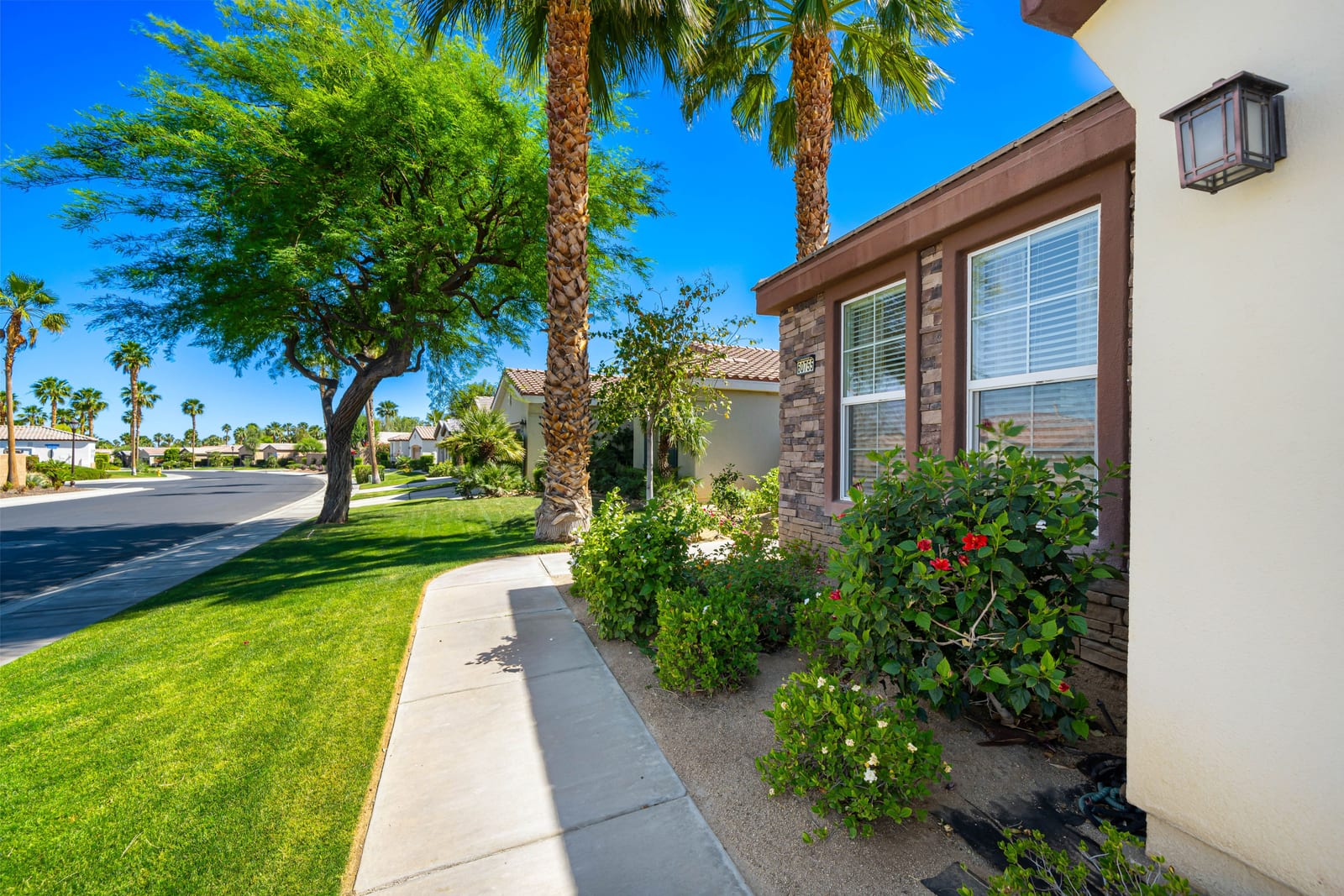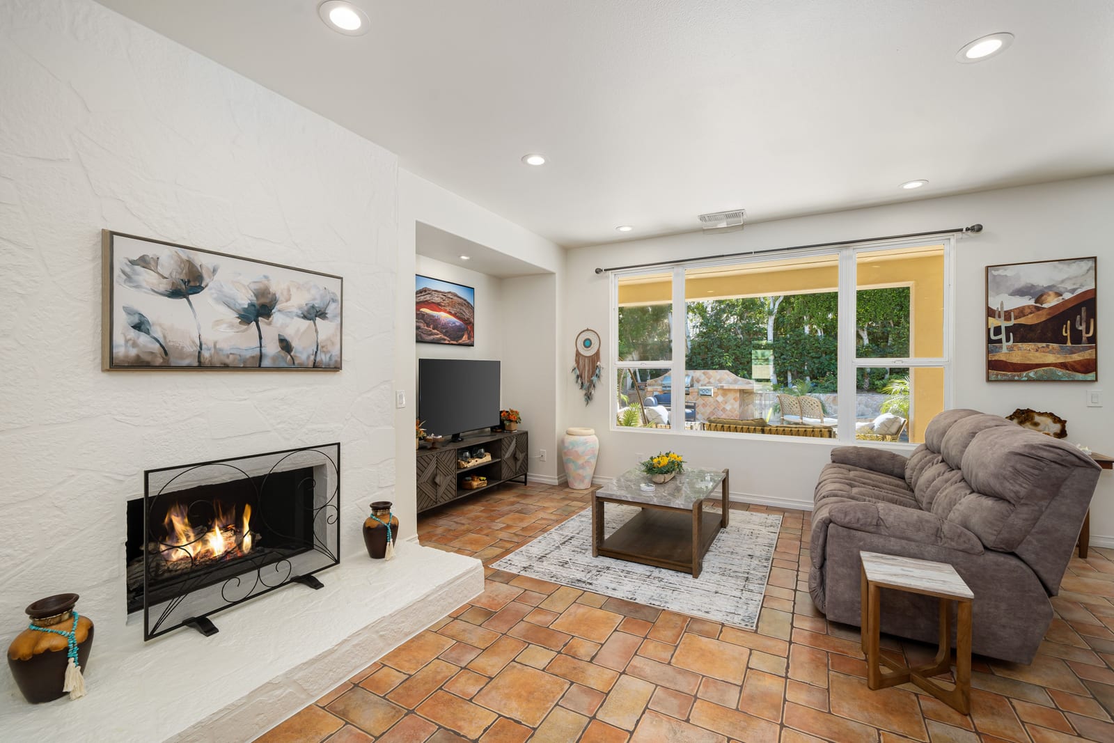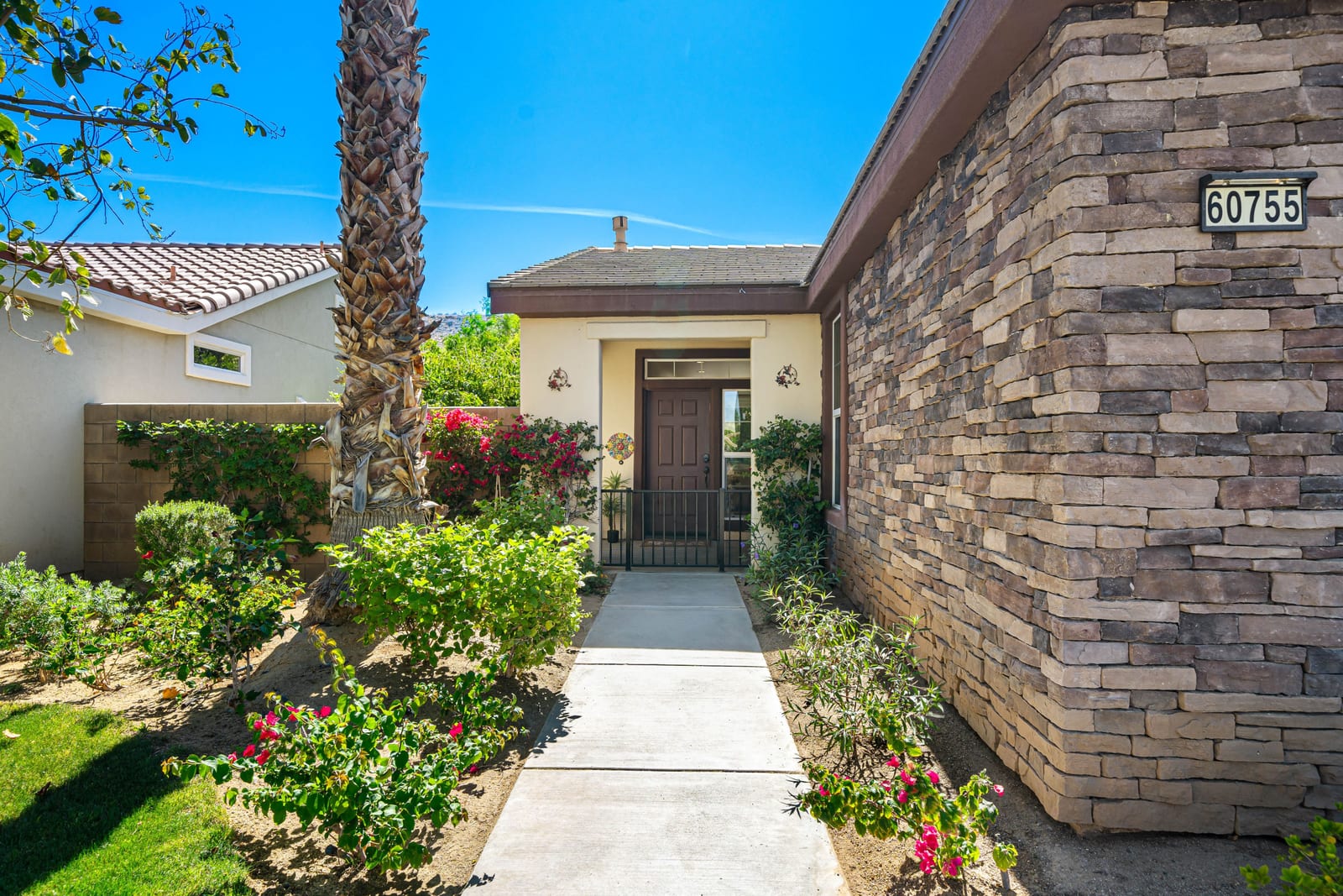 Located at the Trilogy Golf Club at La Quinta, this Oasis model pool/spa home with 1,580 square feet, 2-bedrooms and 2 baths draw from the rich heritage of American Southwestern and Mediterranean interior design, with a fresh contemporary flair. Modern energy saving appliances and interior home systems keep the home comfortable and cost efficient year-round and include a new HVAC system, ceiling fans, tankless water heater, dishwasher, and Culligan reverse osmosis filtration system. Outdoors, the saltwater pool/spa with soothing jets is resurfaced with blue pebble-tec and has new pumps. The lush backyard landscape is kept green and vibrant with a new irrigation system, and pets love the low-maintenance, forever grass along the side yards. As the sun sets and darkness descends the spa shimmers an ethereal blue, and flowers, feathery palms and tall ficus trees glow from a variety of ground spots and uplights. The home is bright and airy with tall ceilings, and large windows and sliders that bring in the beauty of the backyard spa, expansive patio and exquisite landscape. Inside, earthy colored tile floors are counterbalanced with creamy white walls, a white floor to ceiling stone and raised hearth gas log fireplace. Ceiling spotlights in the great room and dining area nooks show off your cherished works of art and furnishings. The kitchen is beautifully designed for ease of cooking and entertaining with views and easy access to all dining areas. The kitchen is fitted with quality solid wood lower cabinets, tile countertops and backsplash punctuated with new clean white soft-close cabinets. A center workspace and handsome custom-made wood coffee bar adds to the comfort and pleasures of the home. The primary bedroom suite is spacious with a bay window overlooking the pool and yard. The roomy bath features double sinks, a walk-in shower and walk-in closet. A separate guest bedroom on the opposite side of the home has a mirrored sliding closet, and a full bath nearby. This stunning outdoor living space is a luxurious private oasis with large sunken jetted spa, three fountains, an expansive patio and mini palms. A professional outdoor barbecue station is the dream of every outdoor chef. The garage is extra-large with durable and easy to clean and tile flooring and fits 2-cars and a golf cart. Need additional workspace? The garage is retrofitted with existing duct work to add air conditioning and heat.