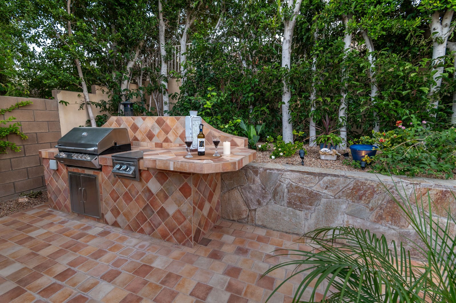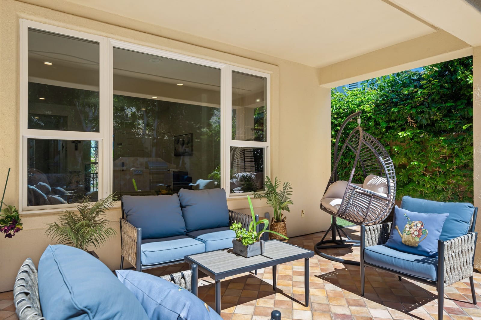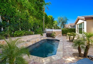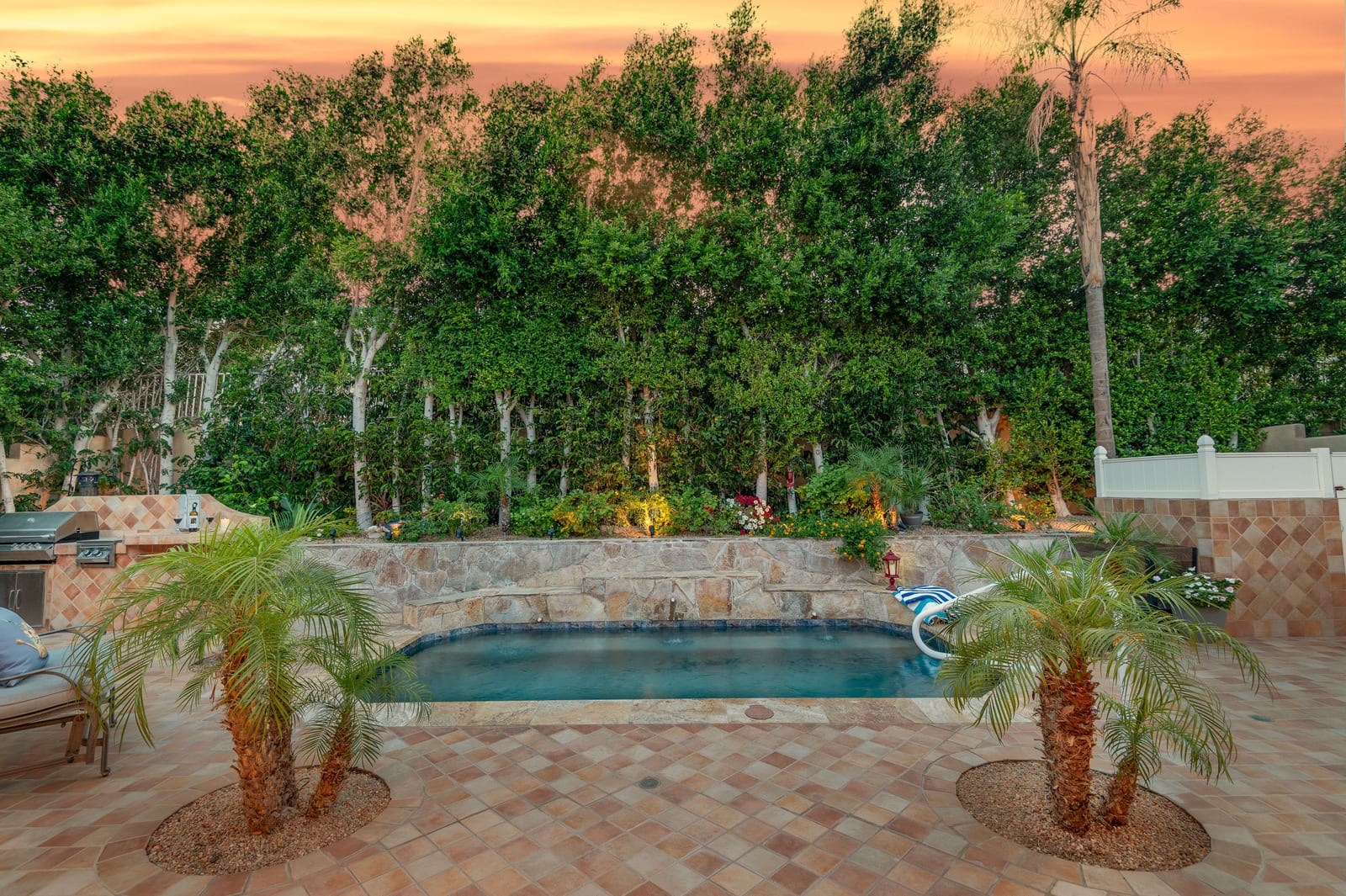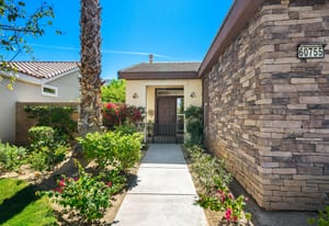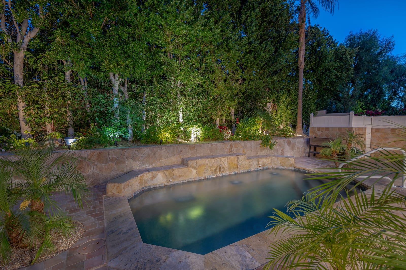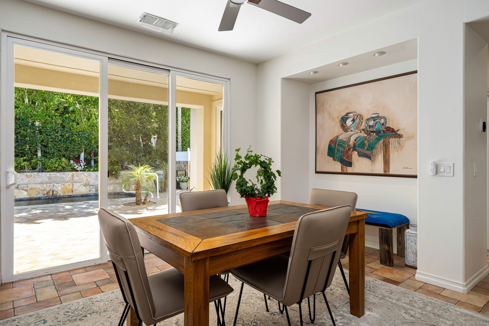 Located at the Trilogy Golf Club at La Quinta, this Oasis model pool/spa home with 1,580 square feet, 2-bedrooms and 2 baths draw from the rich heritage of American Southwestern and Mediterranean interior design, with a fresh contemporary flair. Modern energy saving appliances and interior home systems keep the home comfortable and cost efficient year-round and include a new HVAC system, ceiling fans, tankless water heater, dishwasher, and Culligan reverse osmosis filtration system. Outdoors, the saltwater pool/spa with soothing jets is resurfaced with blue pebble-tec and has new pumps. The lush backyard landscape is kept green and vibrant with a new irrigation system, and pets love the low-maintenance, forever grass along the side yards. As the sun sets and darkness descends the spa shimmers an ethereal blue, and flowers, feathery palms and tall ficus trees glow from a variety of ground spots and uplights. The home is bright and airy with tall ceilings, and large windows and sliders that bring in the beauty of the backyard spa, expansive patio and exquisite landscape. Inside, earthy colored tile floors are counterbalanced with creamy white walls, a white floor to ceiling stone and raised hearth gas log fireplace. Ceiling spotlights in the great room and dining area nooks show off your cherished works of art and furnishings. The kitchen is beautifully designed for ease of cooking and entertaining with views and easy access to all dining areas. The kitchen is fitted with quality solid wood lower cabinets, tile countertops and backsplash punctuated with new clean white soft-close cabinets. A center workspace and handsome custom-made wood coffee bar adds to the comfort and pleasures of the home. The primary bedroom suite is spacious with a bay window overlooking the pool and yard. The roomy bath features double sinks, a walk-in shower and walk-in closet. A separate guest bedroom on the opposite side of the home has a mirrored sliding closet, and a full bath nearby. This stunning outdoor living space is a luxurious private oasis with large sunken jetted spa, three fountains, an expansive patio and mini palms. A professional outdoor barbecue station is the dream of every outdoor chef. The garage is extra-large with durable and easy to clean and tile flooring and fits 2-cars and a golf cart. Need additional workspace? The garage is retrofitted with existing duct work to add air conditioning and heat.