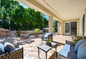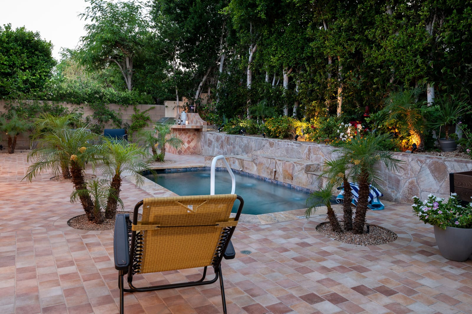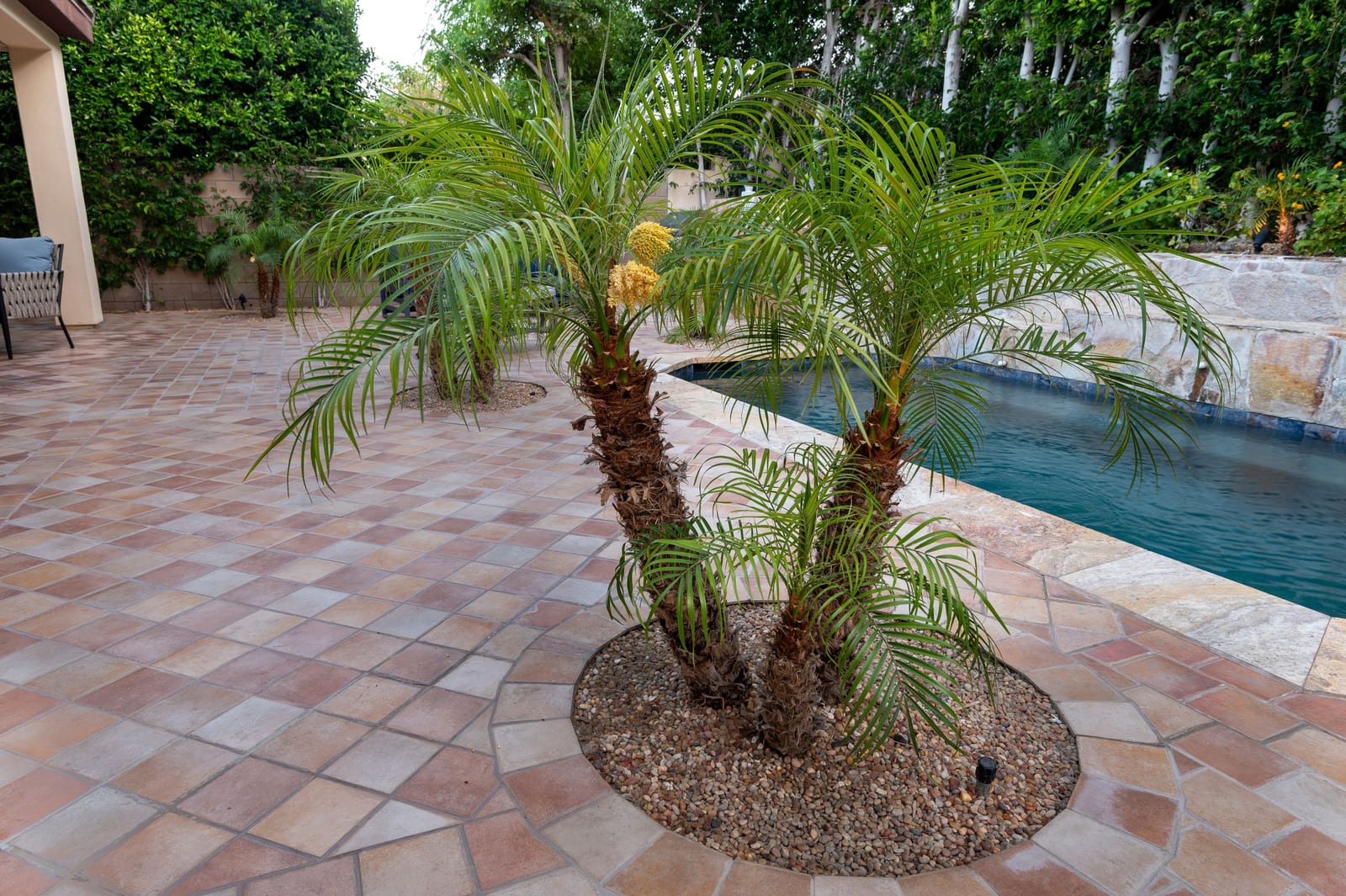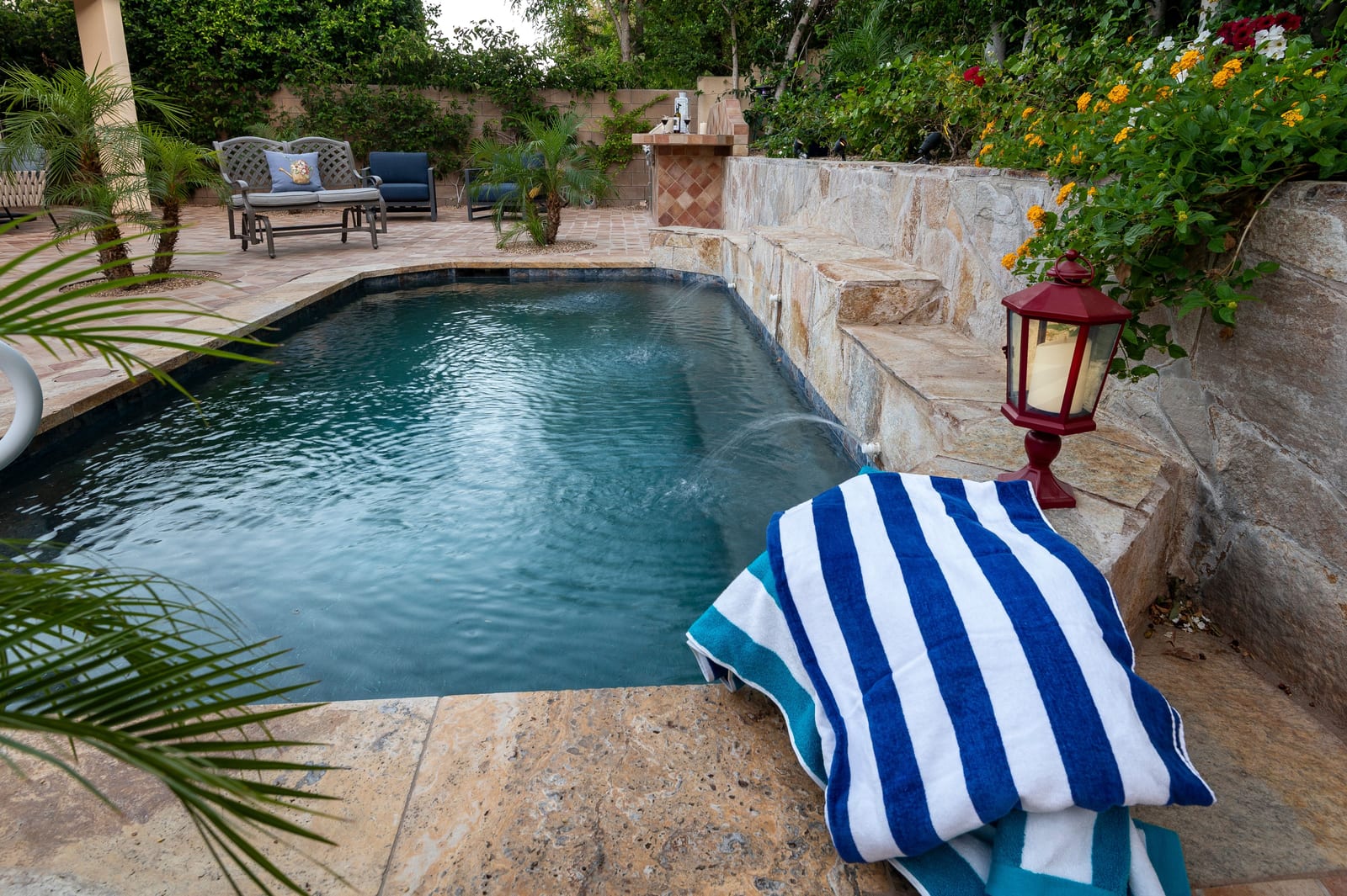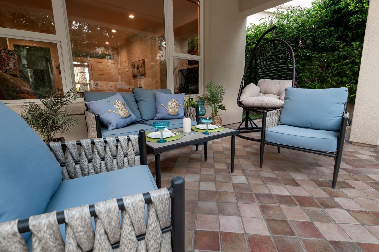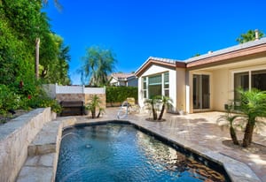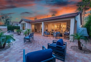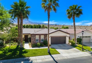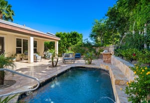 Located at the Trilogy Golf Club at La Quinta, this Oasis model pool/spa home with 1,580 square feet, 2-bedrooms and 2 baths draw from the rich heritage of American Southwestern and Mediterranean interior design, with a fresh contemporary flair. Modern energy saving appliances and interior home systems keep the home comfortable and cost efficient year-round and include a new HVAC system, ceiling fans, tankless water heater, dishwasher, and Culligan reverse osmosis filtration system. Outdoors, the saltwater pool/spa with soothing jets is resurfaced with blue pebble-tec and has new pumps. The lush backyard landscape is kept green and vibrant with a new irrigation system, and pets love the low-maintenance, forever grass along the side yards. As the sun sets and darkness descends the spa shimmers an ethereal blue, and flowers, feathery palms and tall ficus trees glow from a variety of ground spots and uplights. The home is bright and airy with tall ceilings, and large windows and sliders that bring in the beauty of the backyard spa, expansive patio and exquisite landscape. Inside, earthy colored tile floors are counterbalanced with creamy white walls, a white floor to ceiling stone and raised hearth gas log fireplace. Ceiling spotlights in the great room and dining area nooks show off your cherished works of art and furnishings. The kitchen is beautifully designed for ease of cooking and entertaining with views and easy access to all dining areas. The kitchen is fitted with quality solid wood lower cabinets, tile countertops and backsplash punctuated with new clean white soft-close cabinets. A center workspace and handsome custom-made wood coffee bar adds to the comfort and pleasures of the home. The primary bedroom suite is spacious with a bay window overlooking the pool and yard. The roomy bath features double sinks, a walk-in shower and walk-in closet. A separate guest bedroom on the opposite side of the home has a mirrored sliding closet, and a full bath nearby. This stunning outdoor living space is a luxurious private oasis with large sunken jetted spa, three fountains, an expansive patio and mini palms. A professional outdoor barbecue station is the dream of every outdoor chef. The garage is extra-large with durable and easy to clean and tile flooring and fits 2-cars and a golf cart. Need additional workspace? The garage is retrofitted with existing duct work to add air conditioning and heat.