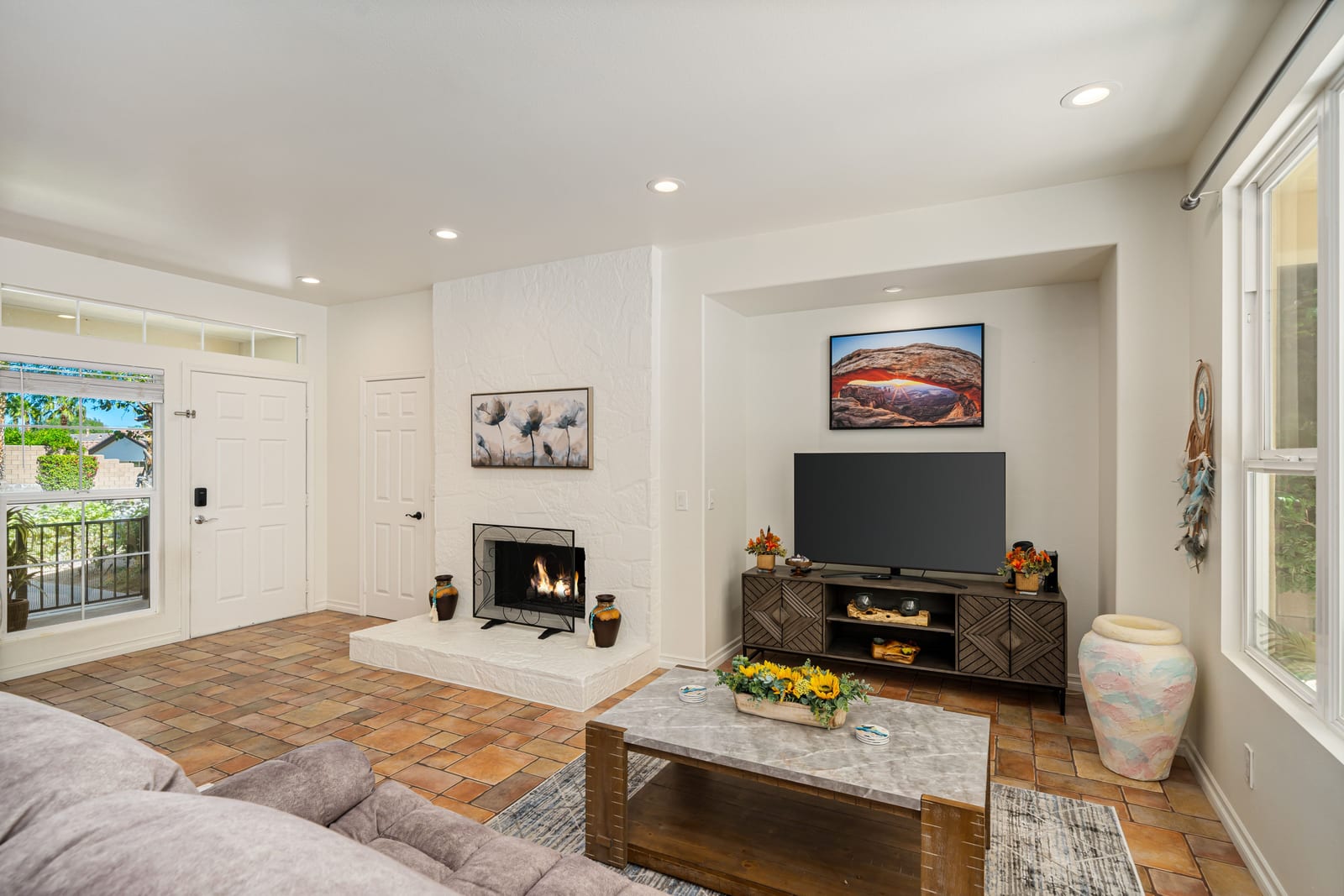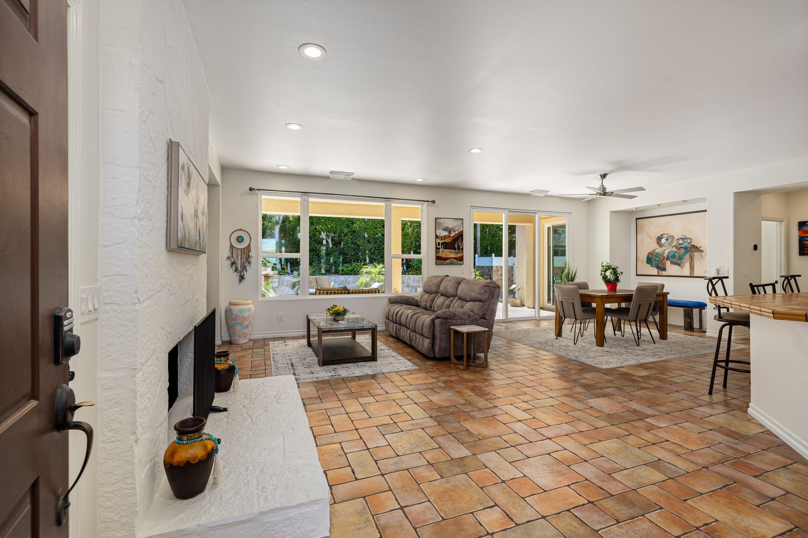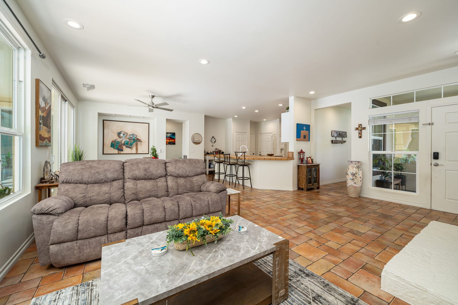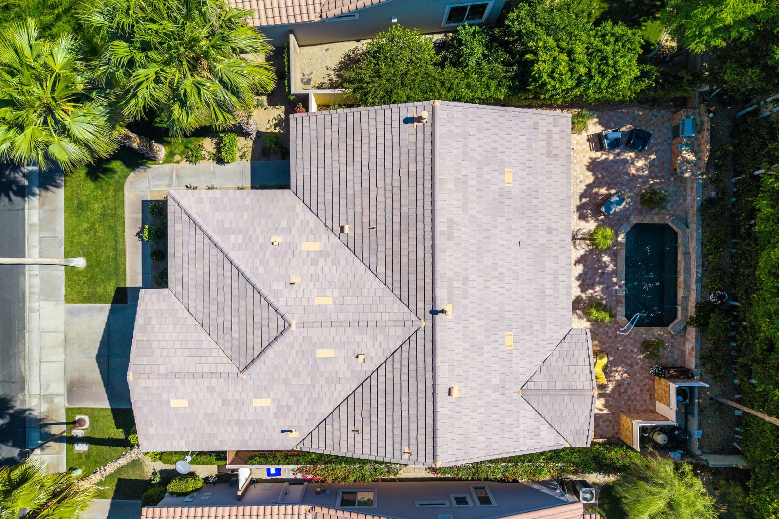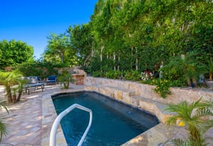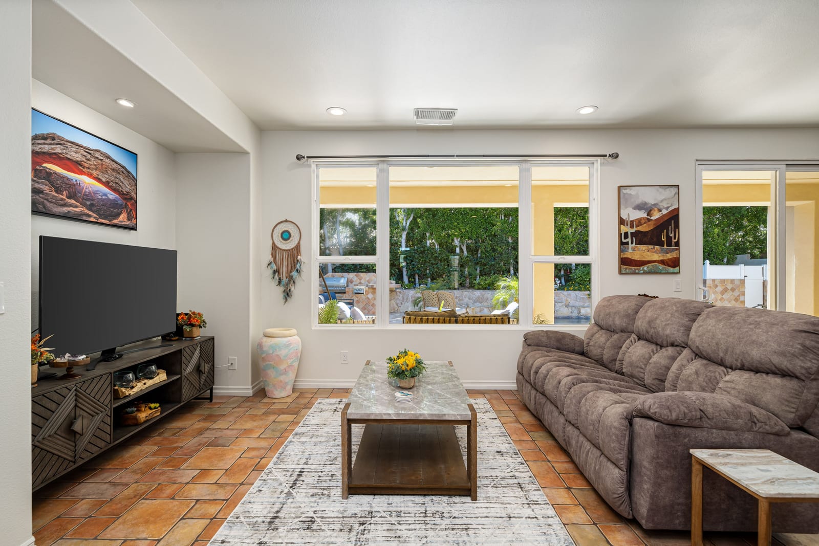 Located at the Trilogy Golf Club at La Quinta, this Oasis model pool/spa home with 1,580 square feet, 2-bedrooms and 2 baths draw from the rich heritage of American Southwestern and Mediterranean interior design, with a fresh contemporary flair. Modern energy saving appliances and interior home systems keep the home comfortable and cost efficient year-round and include a new HVAC system, ceiling fans, tankless water heater, dishwasher, and Culligan reverse osmosis filtration system. Outdoors, the saltwater pool/spa with soothing jets is resurfaced with blue pebble-tec and has new pumps. The lush backyard landscape is kept green and vibrant with a new irrigation system, and pets love the low-maintenance, forever grass along the side yards. As the sun sets and darkness descends the spa shimmers an ethereal blue, and flowers, feathery palms and tall ficus trees glow from a variety of ground spots and uplights. The home is bright and airy with tall ceilings, and large windows and sliders that bring in the beauty of the backyard spa, expansive patio and exquisite landscape. Inside, earthy colored tile floors are counterbalanced with creamy white walls, a white floor to ceiling stone and raised hearth gas log fireplace. Ceiling spotlights in the great room and dining area nooks show off your cherished works of art and furnishings. The kitchen is beautifully designed for ease of cooking and entertaining with views and easy access to all dining areas. The kitchen is fitted with quality solid wood lower cabinets, tile countertops and backsplash punctuated with new clean white soft-close cabinets. A center workspace and handsome custom-made wood coffee bar adds to the comfort and pleasures of the home. The primary bedroom suite is spacious with a bay window overlooking the pool and yard. The roomy bath features double sinks, a walk-in shower and walk-in closet. A separate guest bedroom on the opposite side of the home has a mirrored sliding closet, and a full bath nearby. This stunning outdoor living space is a luxurious private oasis with large sunken jetted spa, three fountains, an expansive patio and mini palms. A professional outdoor barbecue station is the dream of every outdoor chef. The garage is extra-large with durable and easy to clean and tile flooring and fits 2-cars and a golf cart. Need additional workspace? The garage is retrofitted with existing duct work to add air conditioning and heat.