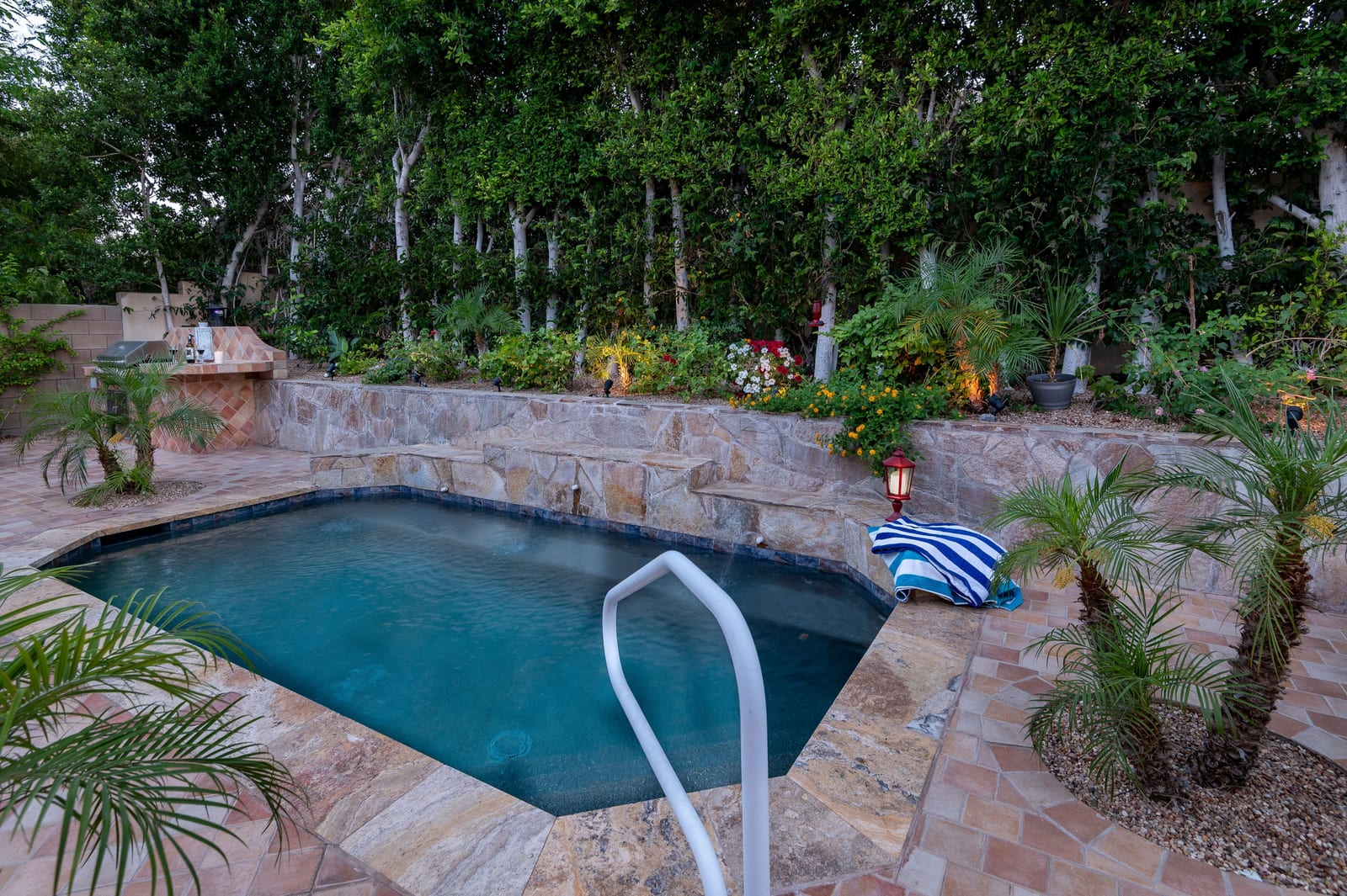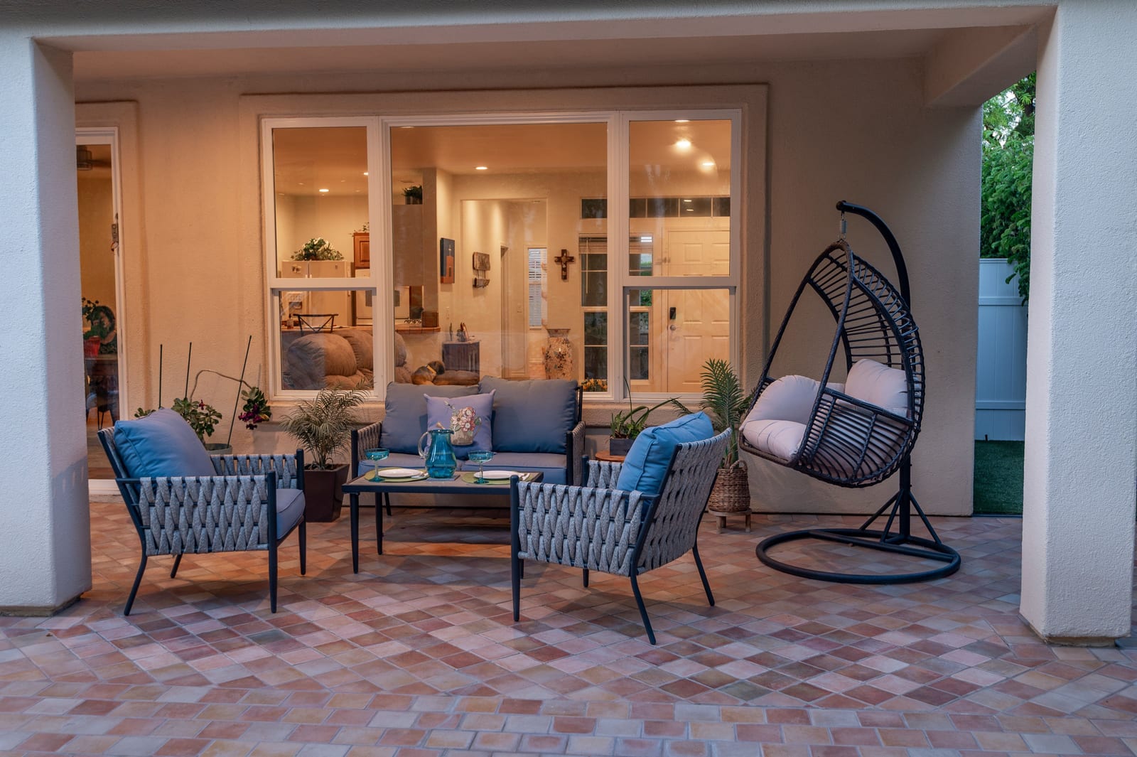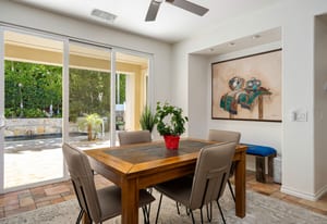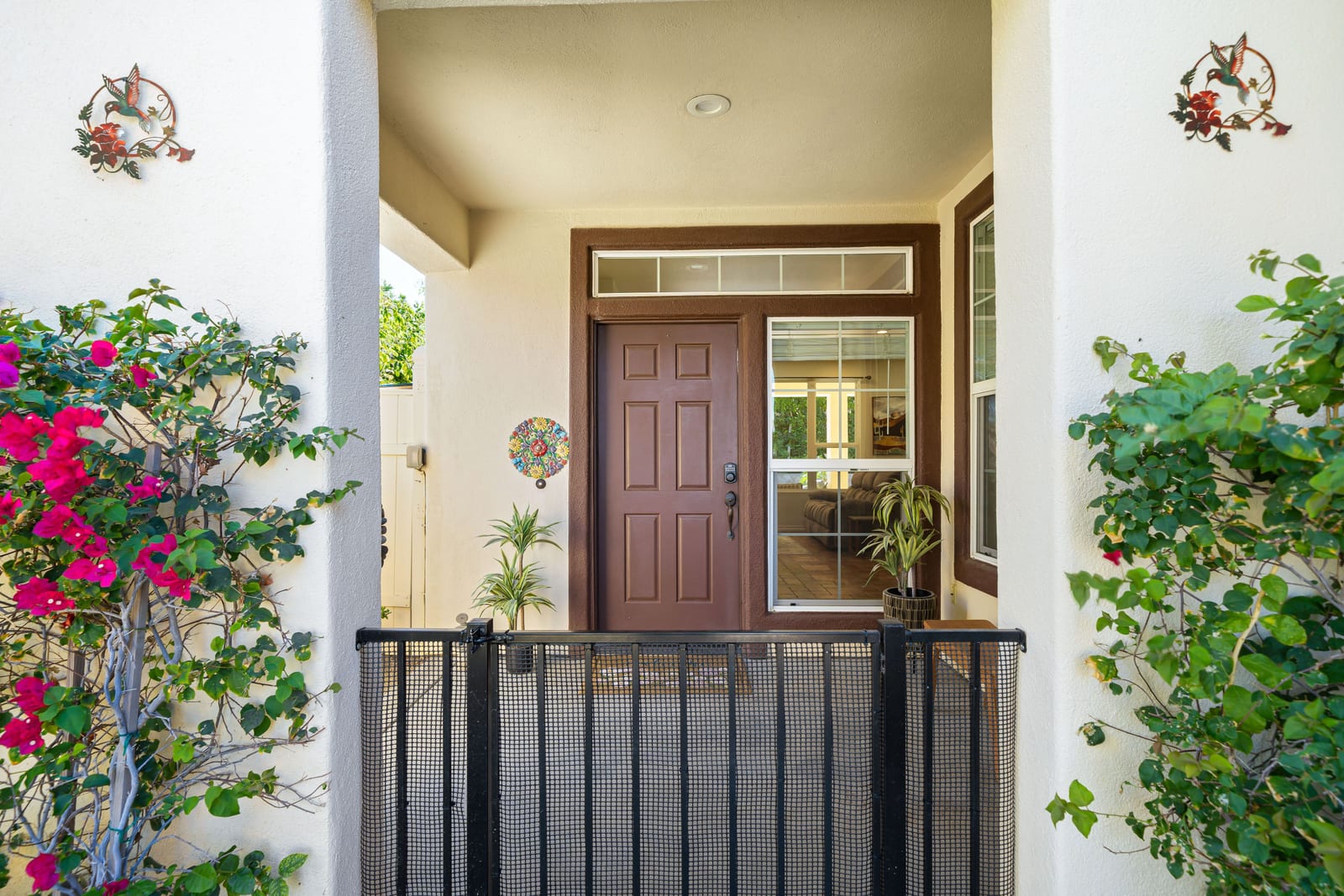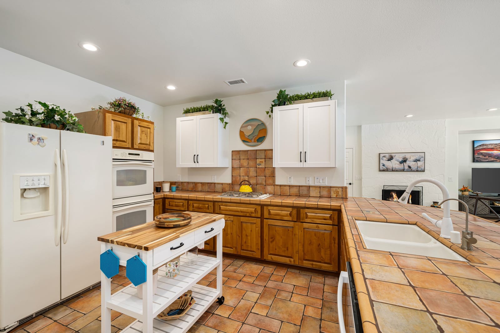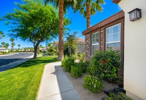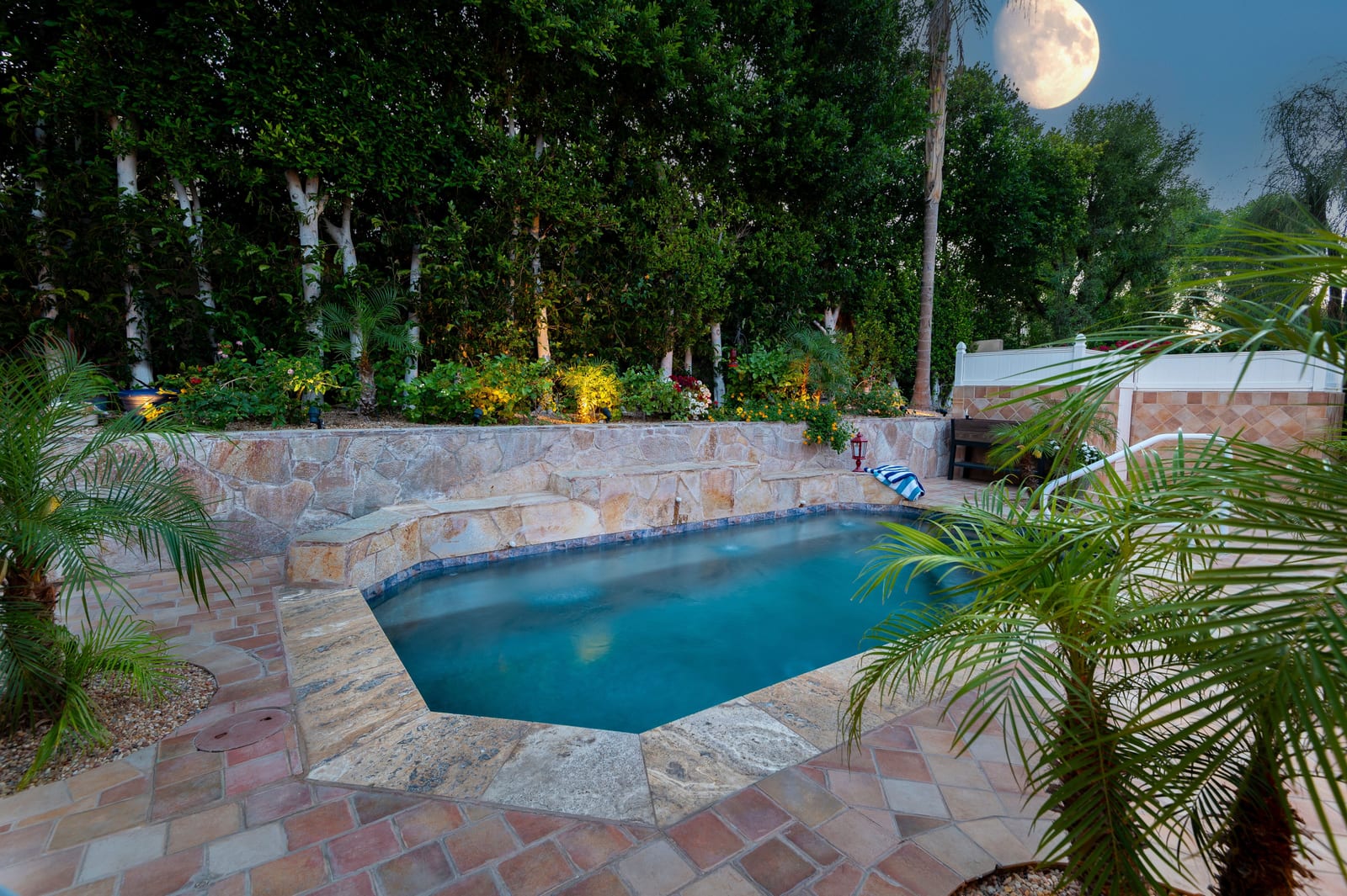 Located at the Trilogy Golf Club at La Quinta, this Oasis model pool/spa home with 1,580 square feet, 2-bedrooms and 2 baths draw from the rich heritage of American Southwestern and Mediterranean interior design, with a fresh contemporary flair. Modern energy saving appliances and interior home systems keep the home comfortable and cost efficient year-round and include a new HVAC system, ceiling fans, tankless water heater, dishwasher, and Culligan reverse osmosis filtration system. Outdoors, the saltwater pool/spa with soothing jets is resurfaced with blue pebble-tec and has new pumps. The lush backyard landscape is kept green and vibrant with a new irrigation system, and pets love the low-maintenance, forever grass along the side yards. As the sun sets and darkness descends the spa shimmers an ethereal blue, and flowers, feathery palms and tall ficus trees glow from a variety of ground spots and uplights. The home is bright and airy with tall ceilings, and large windows and sliders that bring in the beauty of the backyard spa, expansive patio and exquisite landscape. Inside, earthy colored tile floors are counterbalanced with creamy white walls, a white floor to ceiling stone and raised hearth gas log fireplace. Ceiling spotlights in the great room and dining area nooks show off your cherished works of art and furnishings. The kitchen is beautifully designed for ease of cooking and entertaining with views and easy access to all dining areas. The kitchen is fitted with quality solid wood lower cabinets, tile countertops and backsplash punctuated with new clean white soft-close cabinets. A center workspace and handsome custom-made wood coffee bar adds to the comfort and pleasures of the home. The primary bedroom suite is spacious with a bay window overlooking the pool and yard. The roomy bath features double sinks, a walk-in shower and walk-in closet. A separate guest bedroom on the opposite side of the home has a mirrored sliding closet, and a full bath nearby. This stunning outdoor living space is a luxurious private oasis with large sunken jetted spa, three fountains, an expansive patio and mini palms. A professional outdoor barbecue station is the dream of every outdoor chef. The garage is extra-large with durable and easy to clean and tile flooring and fits 2-cars and a golf cart. Need additional workspace? The garage is retrofitted with existing duct work to add air conditioning and heat.
