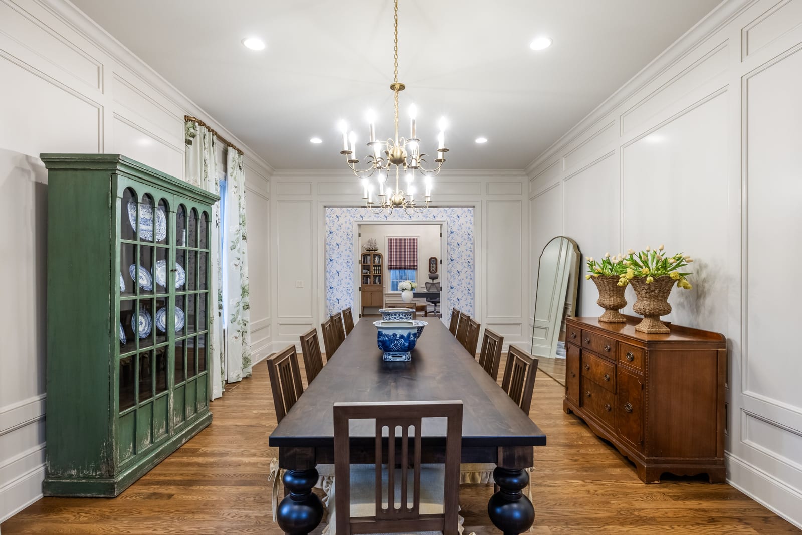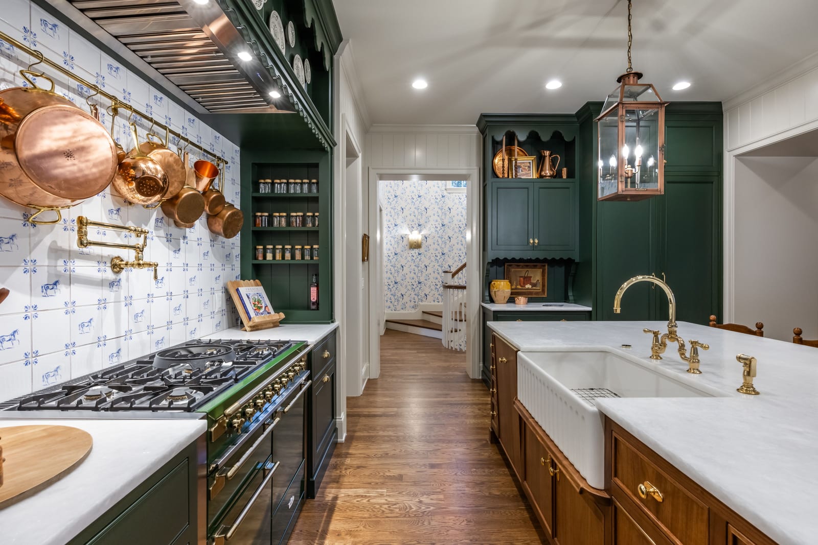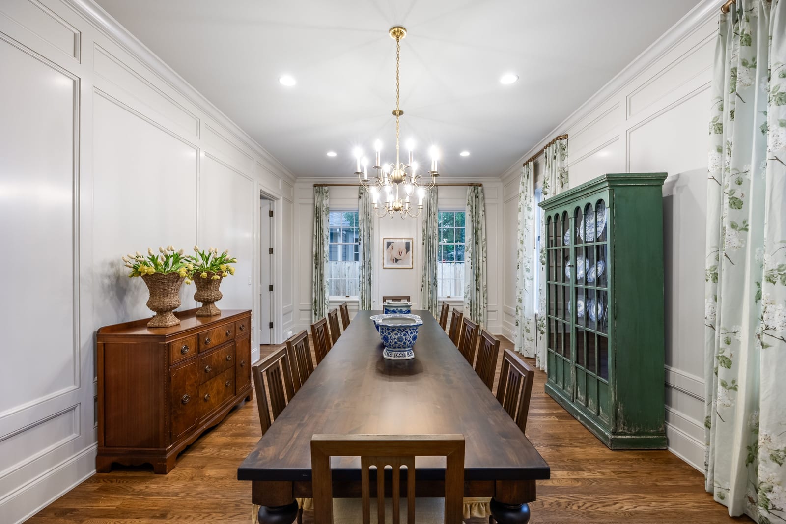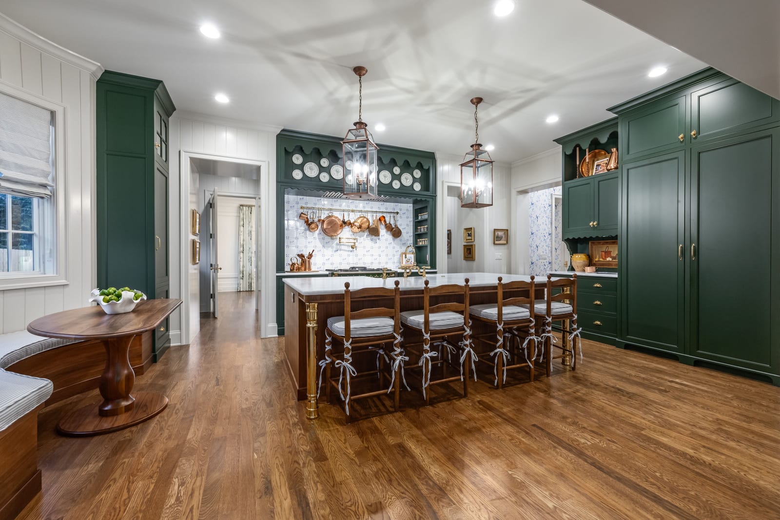 Inside, the home is warm, layered, and effortlessly functional. The kitchen serves as the heart of the home, with rich cabinetry, intricate millwork, warm wood tones, and a statement backsplash that anchors the space. The butler’s pantry offers both beauty and utility, ideal for hosting or keeping daily life beautifully organized. Throughout the home, custom built-ins add character and purpose.