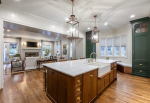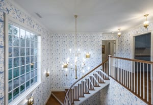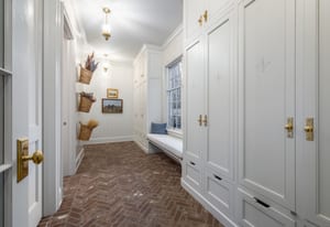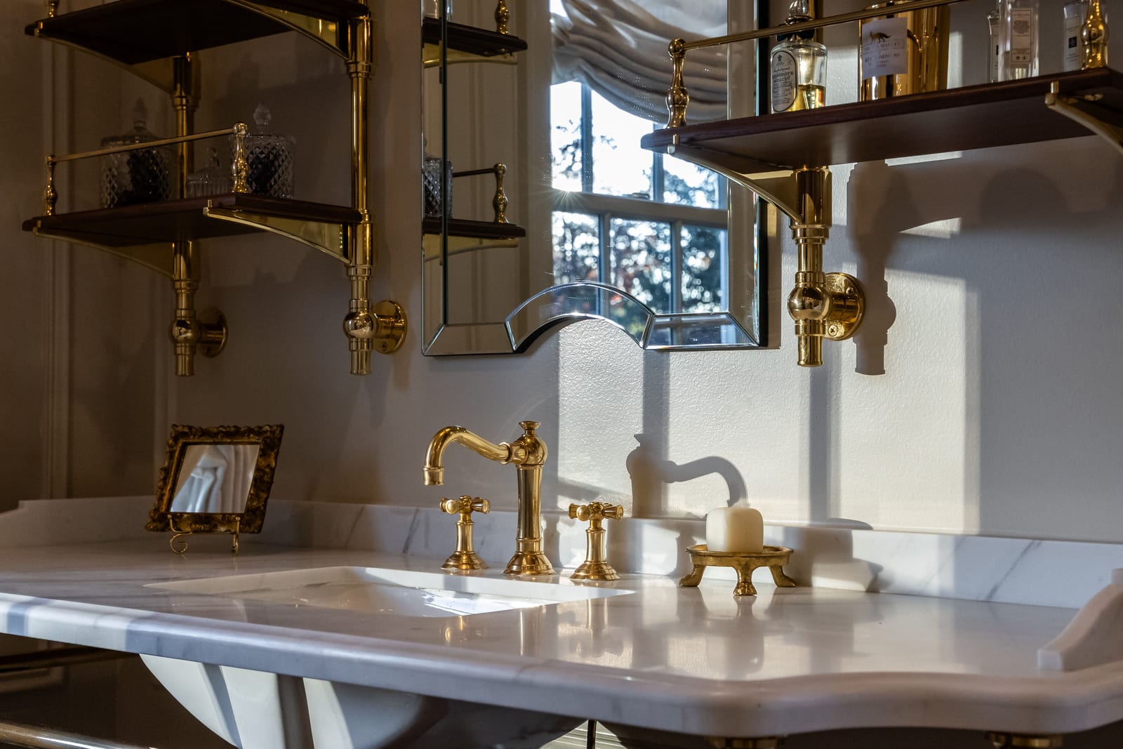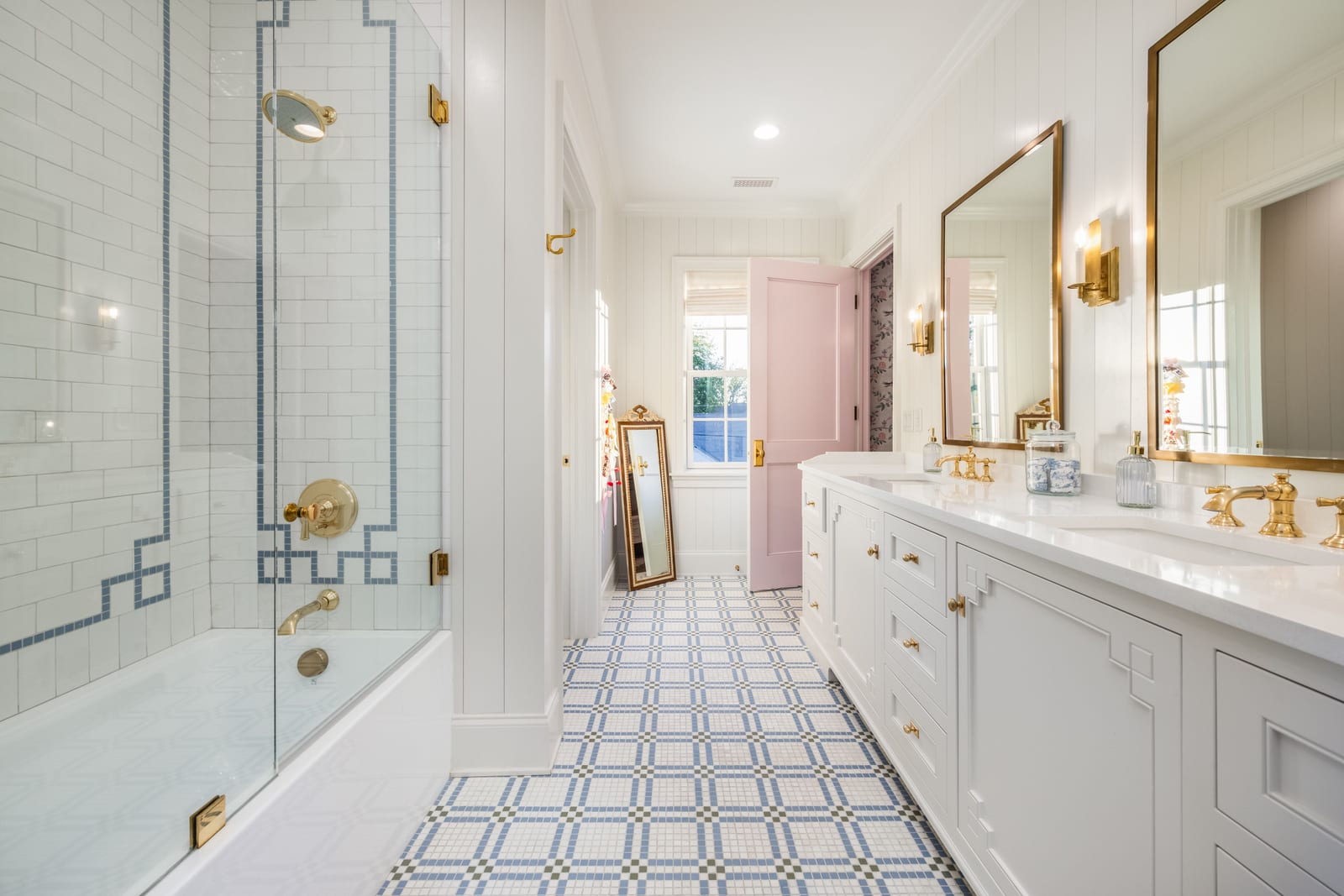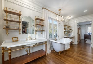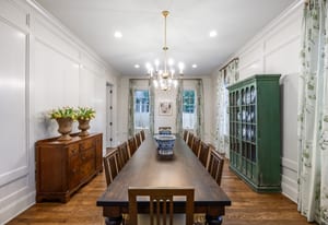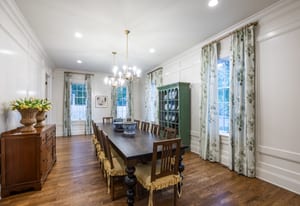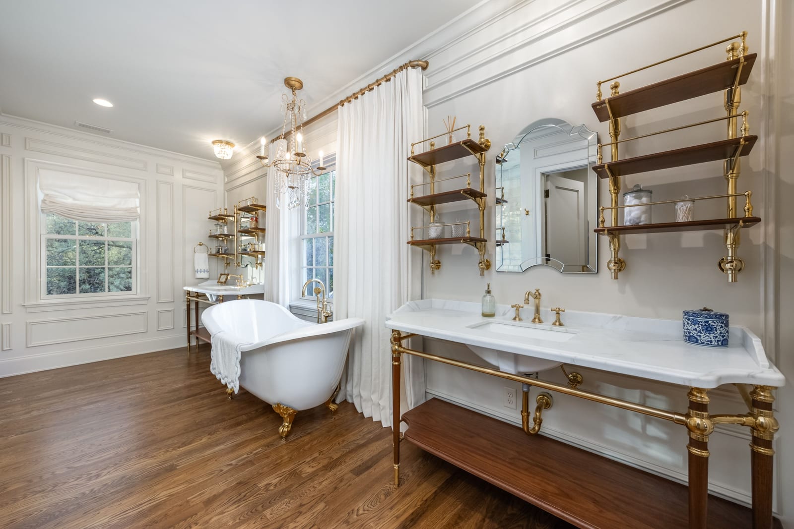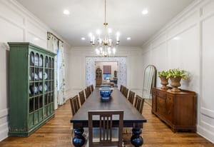A soft, cohesive palette paired with timeless finishes—brass hardware, custom moldings, and curated lighting—creates a sense of quiet luxury and continuity from room to room.