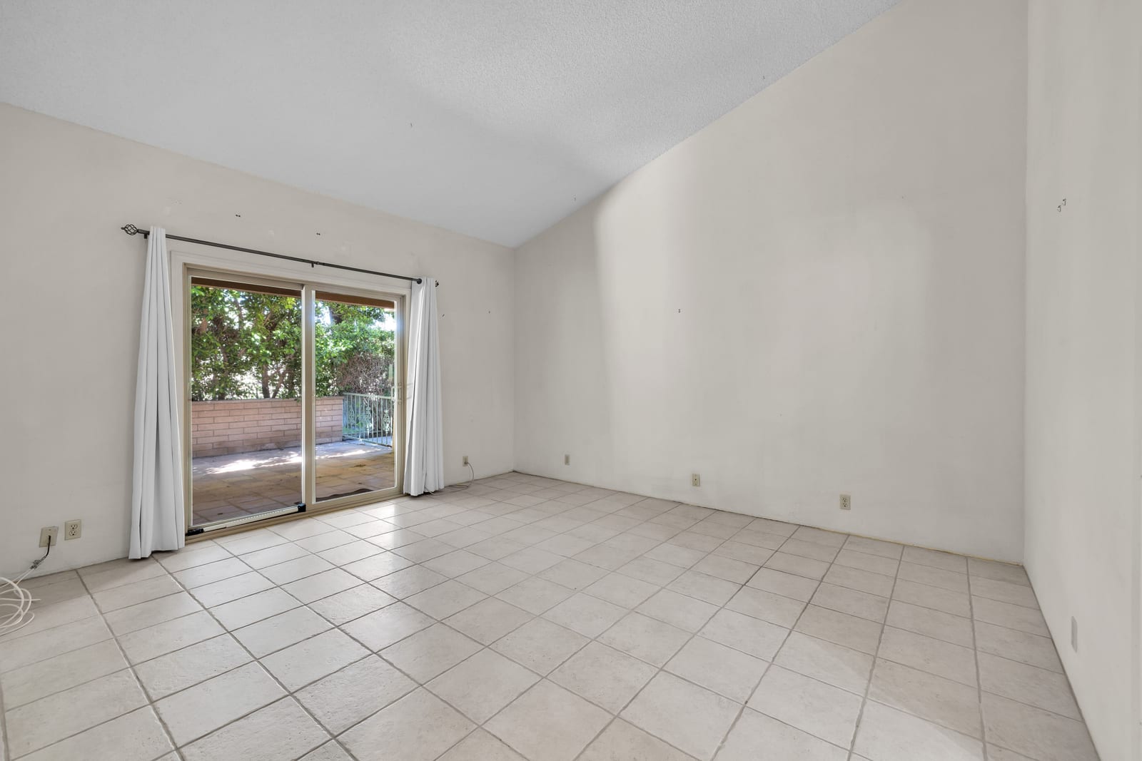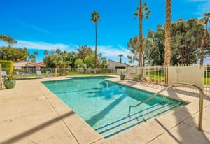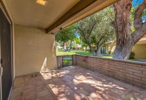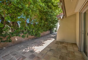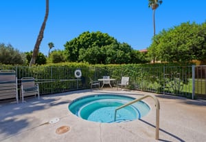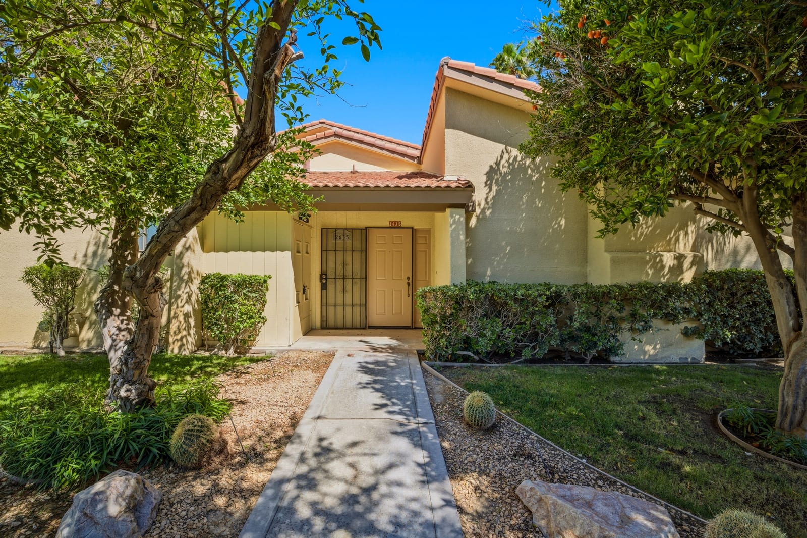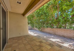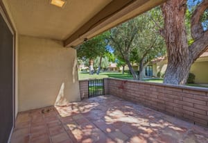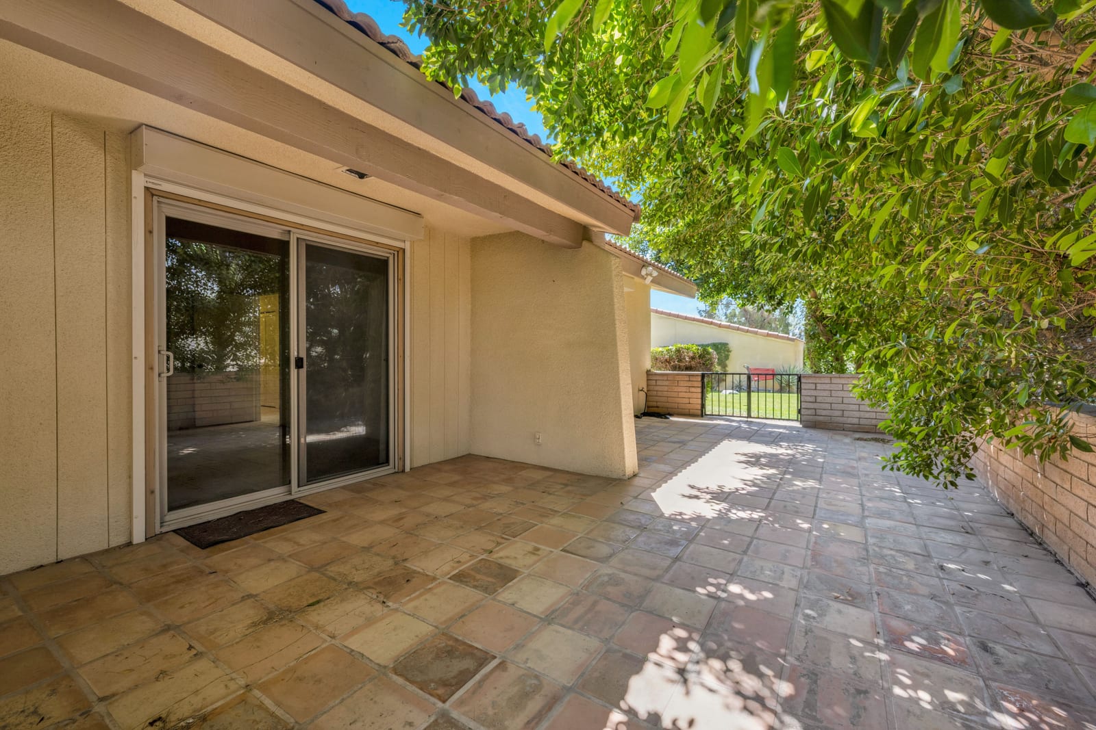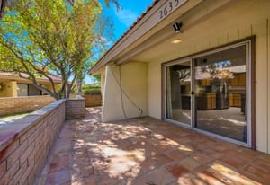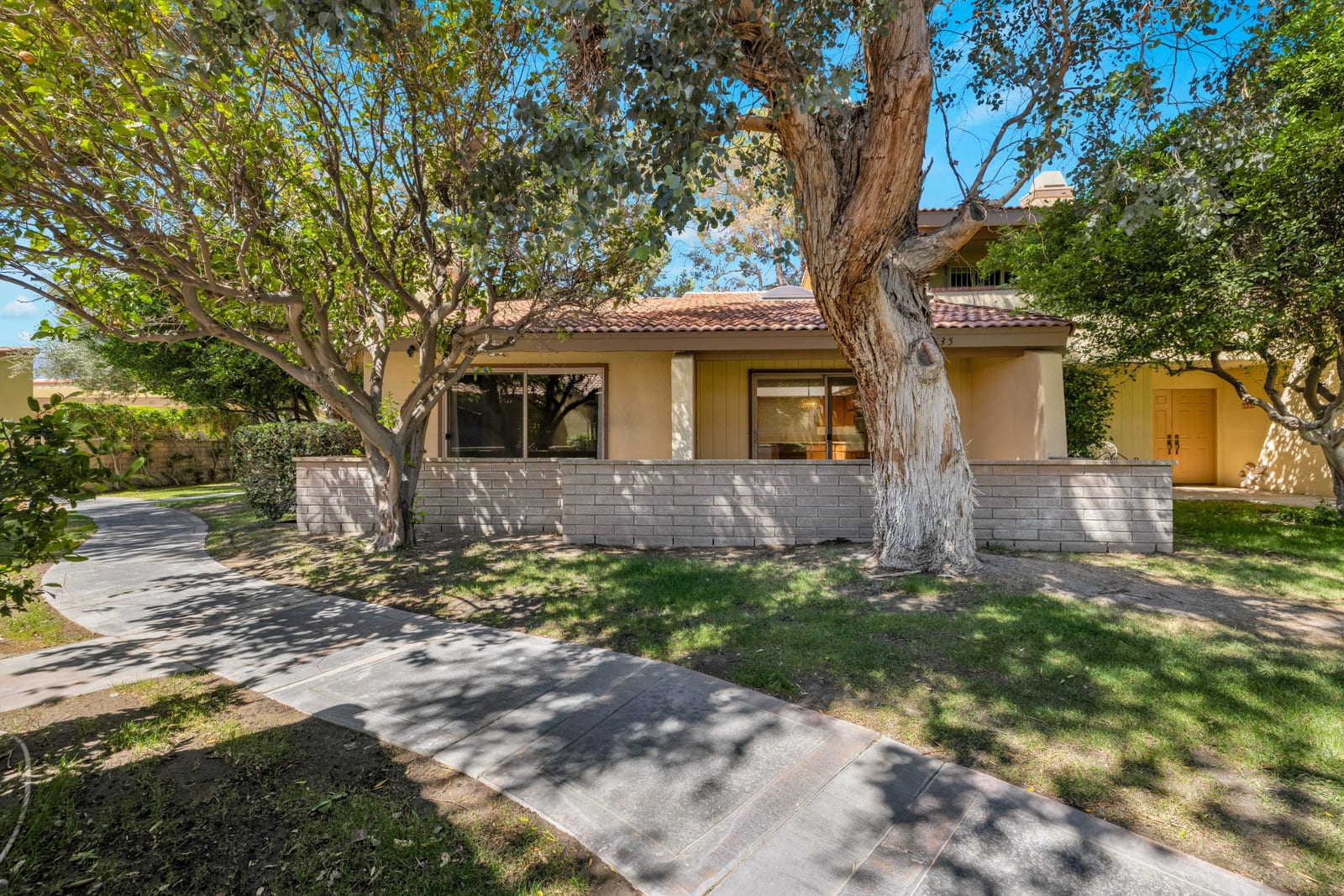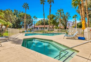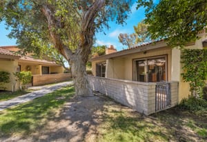 Welcome to Palm Springs Country Cluban iconic gated community designed by renowned mid-century architect William F. Cody where timeless design meets resort-style living. This 2-bedroom, 2-bath end-unit condo offers approximately 1,538 sq ft of interior space and is ideally located in Phase 5, one of the most desirable sections of the community. Being an end unit, it provides added privacy, abundant natural light, and convenient proximity to parking. The home features two spacious private patios, a rare and highly desirable setup. Enjoy stunning San Jacinto Mountain views from the west-facing patio, while the second patio opens to lush garden surroundings creating the perfect indoor-outdoor desert lifestyle. Inside, you will find soaring vaulted ceilings, a gas fireplace with tile surround, and an open-concept living space filled with natural light. The kitchen offers mid-century inspired design elements, including an island, wood cabinetry, stainless steel appliances, and a skylight that brightens the space throughout the day. Large sliding doors from both the living room and kitchen create seamless access to the patios. The primary suite is generously sized with direct patio access, mountain views, dual vanities, and a walk-in closet. A spacious guest bedroom also features patio access, complemented by a well-sized guest bath. Additional features include an in-unit washer and dryer with newer appliances. Palm Springs Country Club offers resort-style amenities, including beautifully landscaped grounds, a sparkling saltwater pool, spa, and included services such as cable, internet, water, and trash, all within a peaceful, well-maintained gated setting. This is a successor trust sale and presents a fantastic fixer opportunity to customize and add value within a historically significant mid-century community. With solid bones, a desirable layout, and an unbeatable setting, this unit is ready for your vision. Bring your ideas and make it your own, opportunities like this are rare, and the property is being sold as-is, where-is.