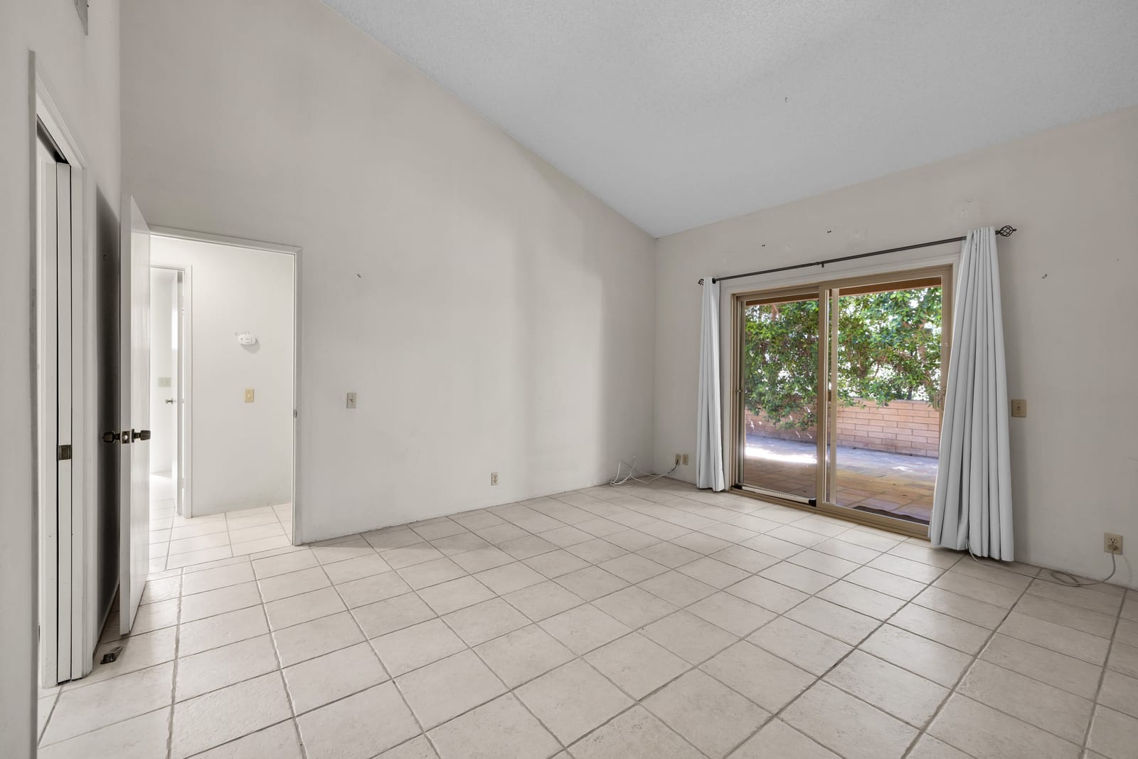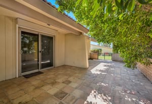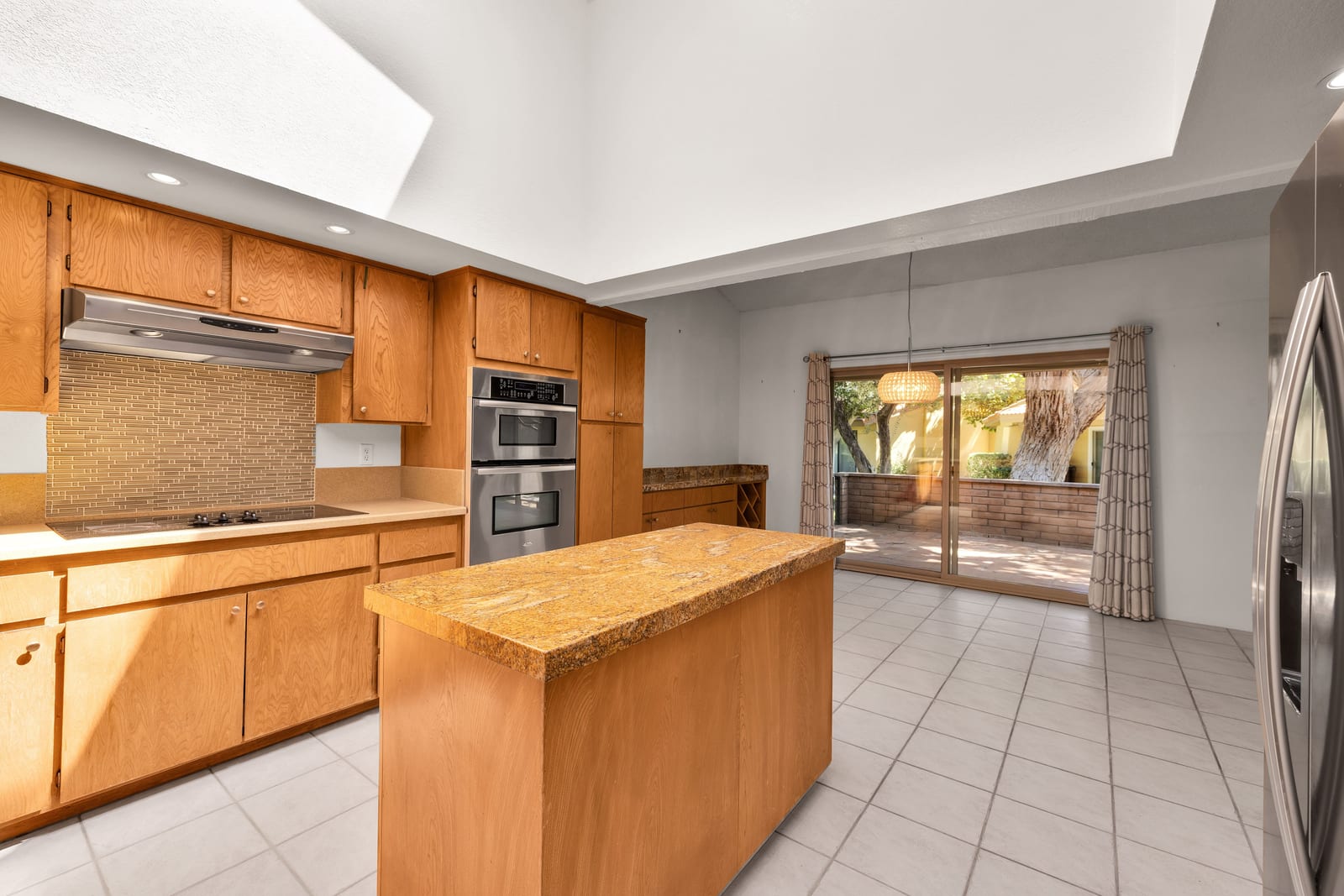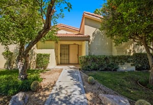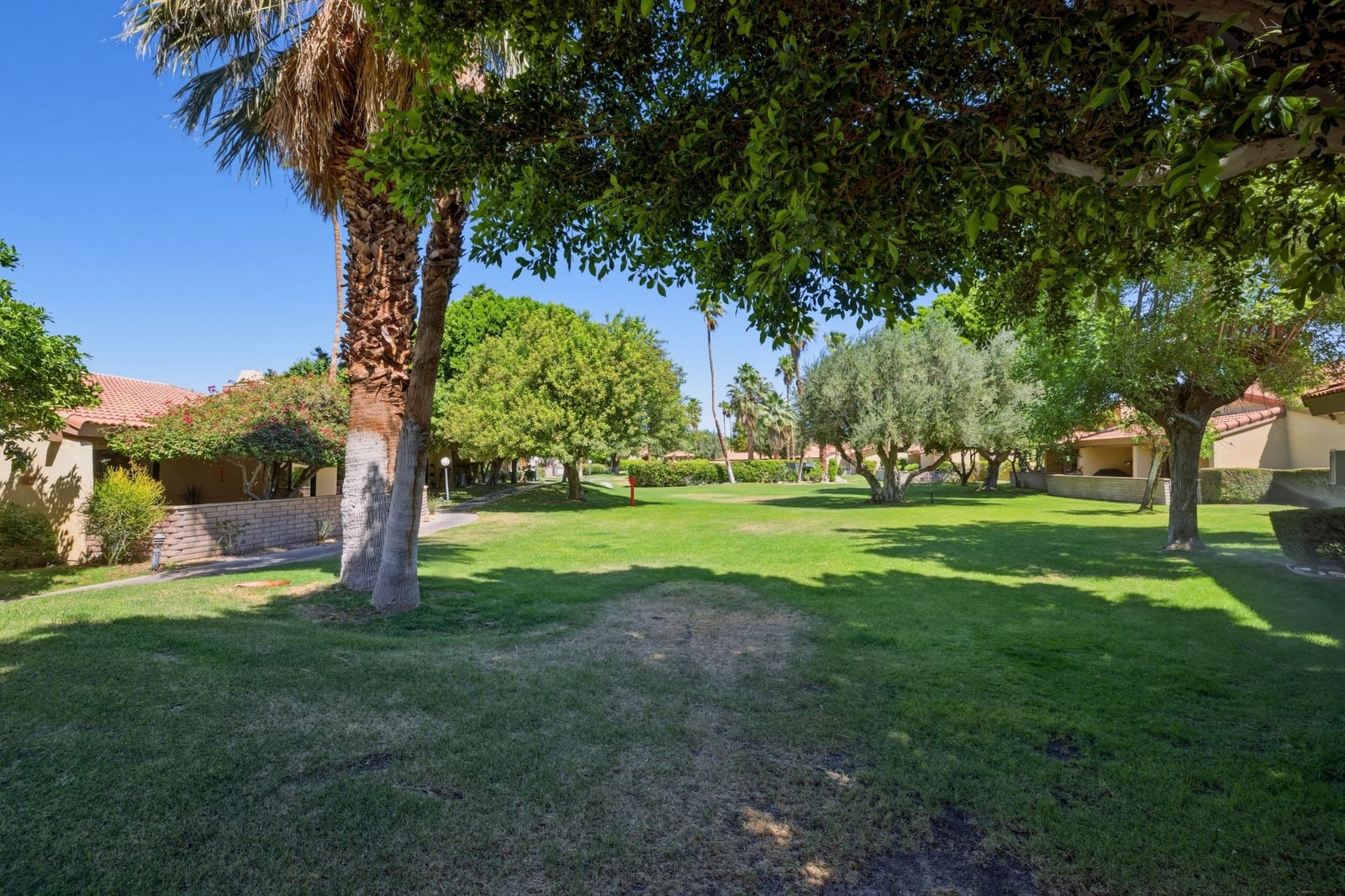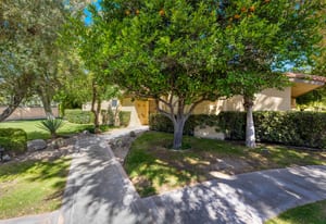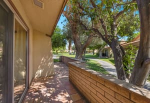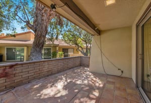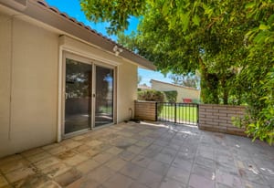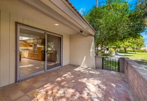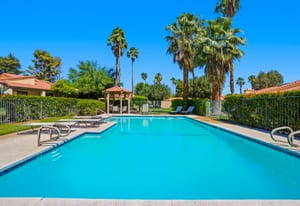 Welcome to Palm Springs Country Cluban iconic gated community designed by renowned mid-century architect William F. Cody where timeless design meets resort-style living. This 2-bedroom, 2-bath end-unit condo offers approximately 1,538 sq ft of interior space and is ideally located in Phase 5, one of the most desirable sections of the community. Being an end unit, it provides added privacy, abundant natural light, and convenient proximity to parking. The home features two spacious private patios, a rare and highly desirable setup. Enjoy stunning San Jacinto Mountain views from the west-facing patio, while the second patio opens to lush garden surroundings creating the perfect indoor-outdoor desert lifestyle. Inside, you will find soaring vaulted ceilings, a gas fireplace with tile surround, and an open-concept living space filled with natural light. The kitchen offers mid-century inspired design elements, including an island, wood cabinetry, stainless steel appliances, and a skylight that brightens the space throughout the day. Large sliding doors from both the living room and kitchen create seamless access to the patios. The primary suite is generously sized with direct patio access, mountain views, dual vanities, and a walk-in closet. A spacious guest bedroom also features patio access, complemented by a well-sized guest bath. Additional features include an in-unit washer and dryer with newer appliances. Palm Springs Country Club offers resort-style amenities, including beautifully landscaped grounds, a sparkling saltwater pool, spa, and included services such as cable, internet, water, and trash, all within a peaceful, well-maintained gated setting. This is a successor trust sale and presents a fantastic fixer opportunity to customize and add value within a historically significant mid-century community. With solid bones, a desirable layout, and an unbeatable setting, this unit is ready for your vision. Bring your ideas and make it your own, opportunities like this are rare, and the property is being sold as-is, where-is.