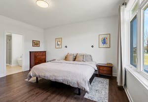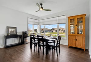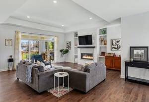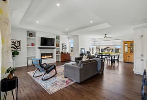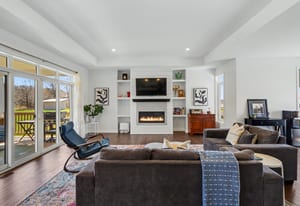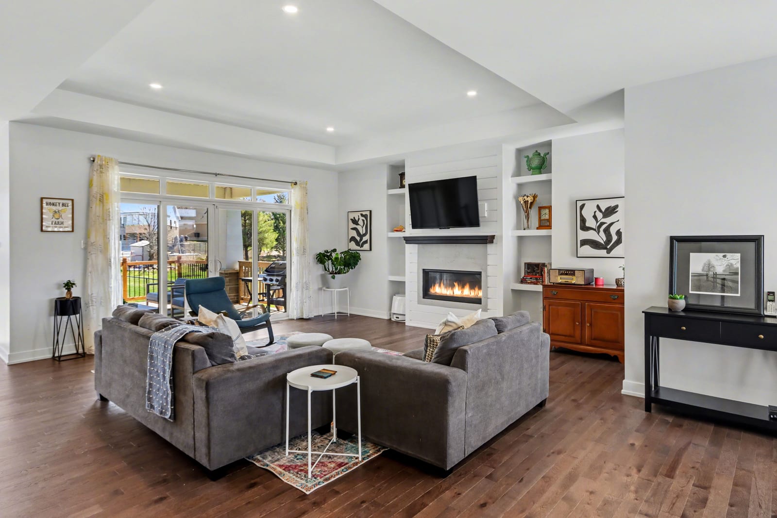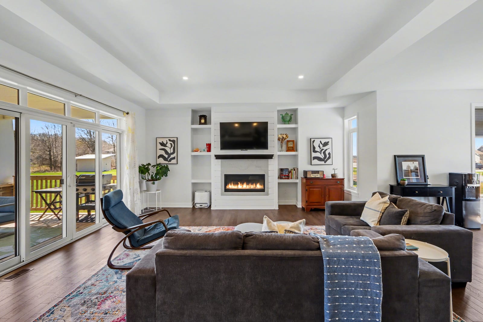 The inviting living room showcases a cozy gas fireplace with a shiplap feature wall and built-in shelving, complemented by oversized windows that fill the space with natural light. Sliding doors with side panes lead to a covered porch complete with a BBQ gas line—perfect for outdoor entertaining.