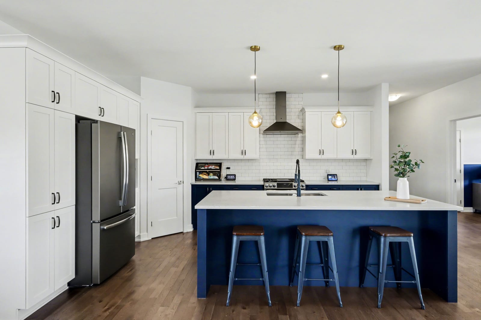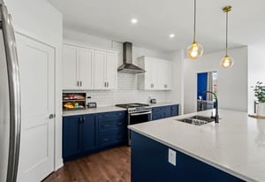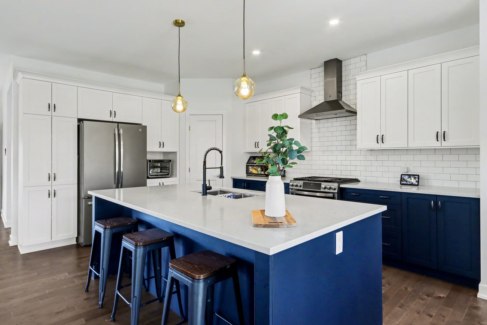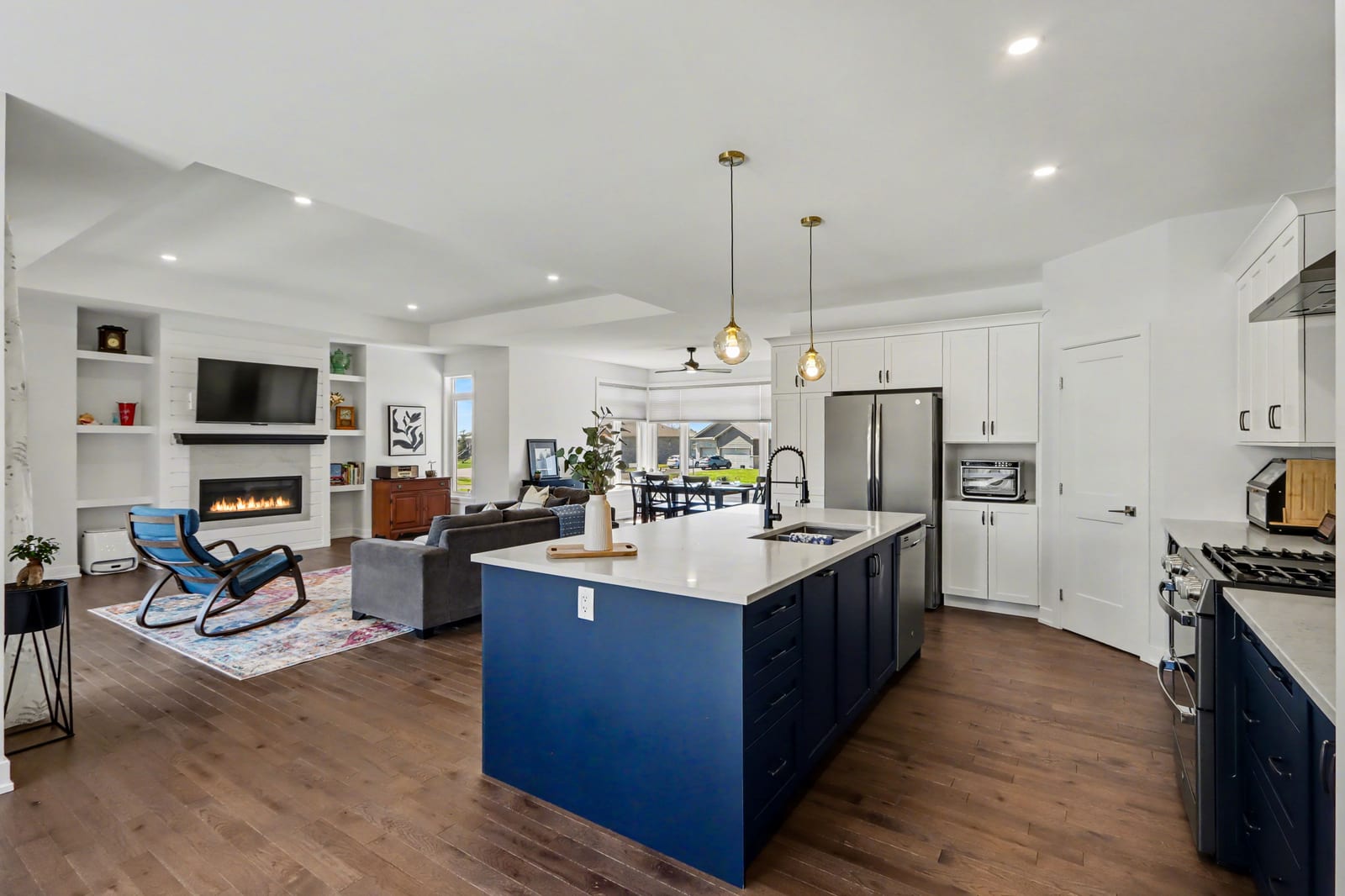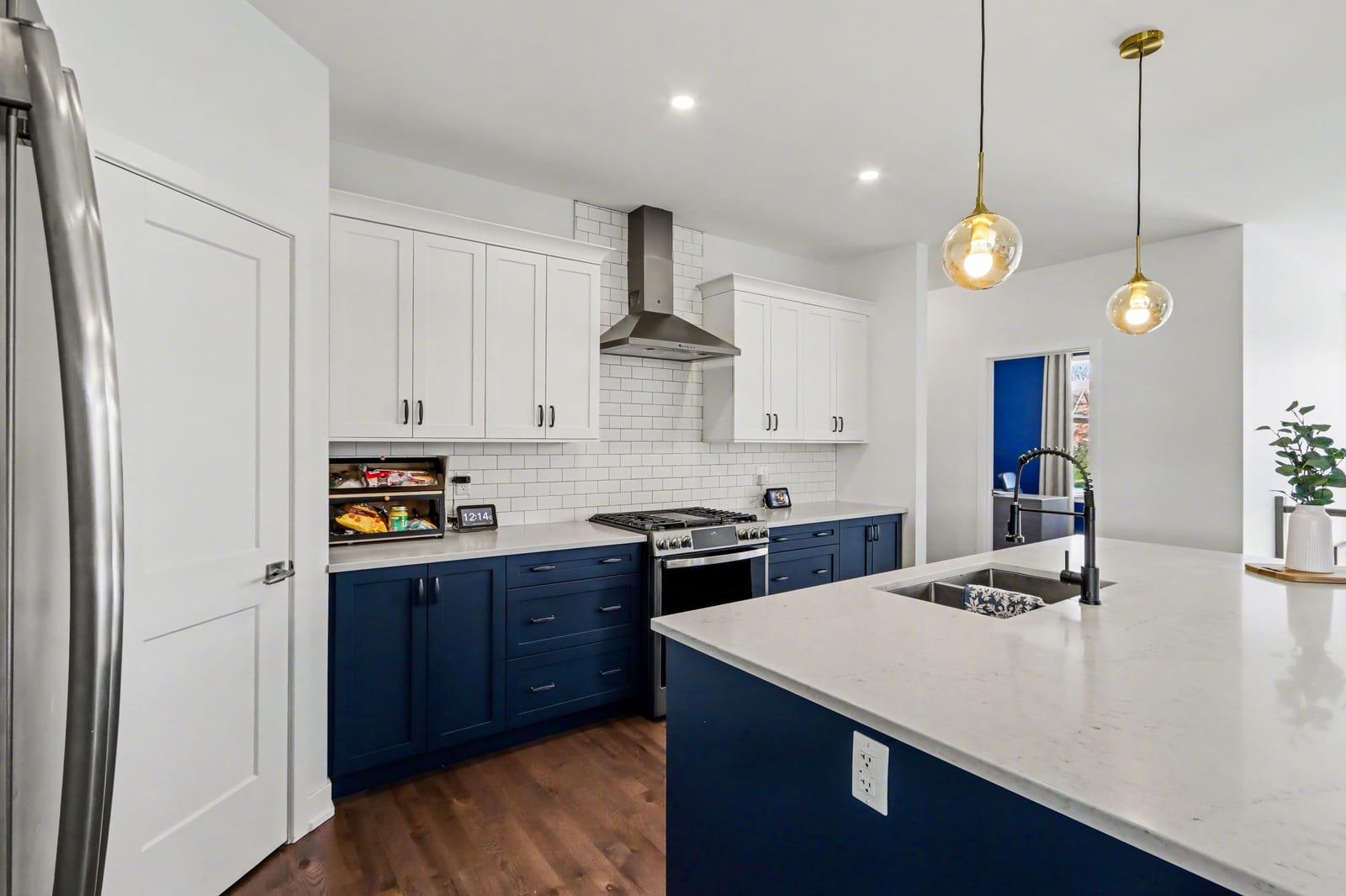 Enjoy elegant hardwood flooring throughout the main floor and impressive 9-foot smooth ceilings. The chef-inspired kitchen is an entertainer’s dream, featuring classic white cabinetry with navy lower cabinets, an oversized island, quartz countertops, tile backsplash, stainless steel appliances, and a gas stove. A walk-in pantry adds extra convenience, while the open-concept layout seamlessly connects the kitchen to the dining and living areas.