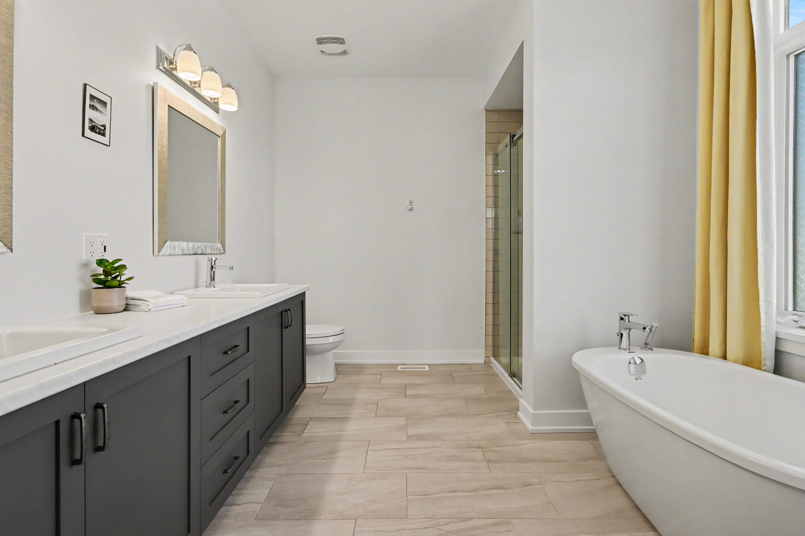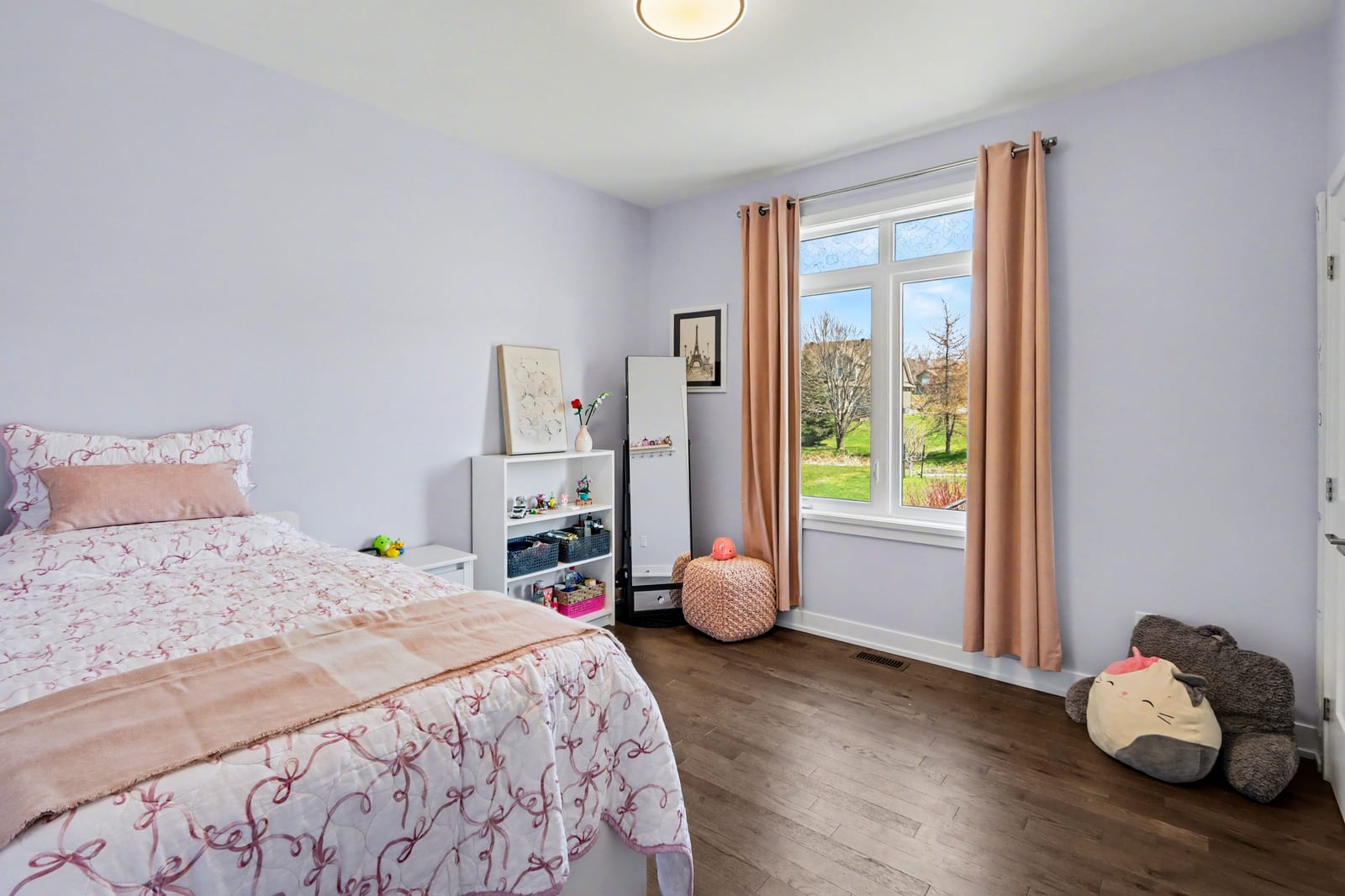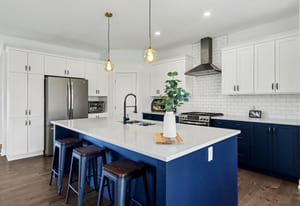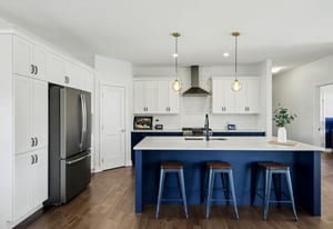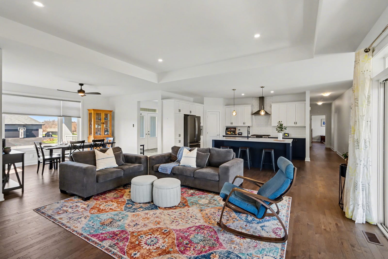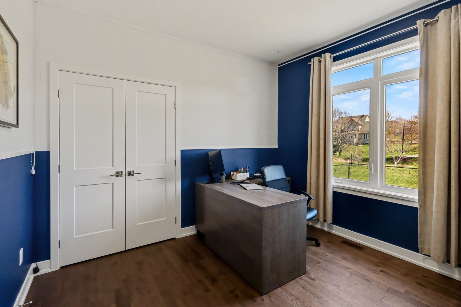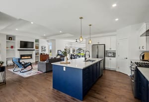 Enjoy elegant hardwood flooring throughout the main floor and impressive 9-foot smooth ceilings. The chef-inspired kitchen is an entertainer’s dream, featuring classic white cabinetry with navy lower cabinets, an oversized island, quartz countertops, tile backsplash, stainless steel appliances, and a gas stove. A walk-in pantry adds extra convenience, while the open-concept layout seamlessly connects the kitchen to the dining and living areas.