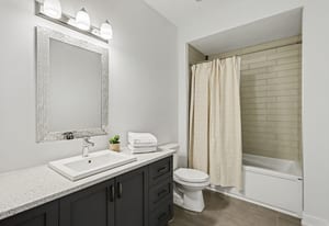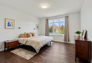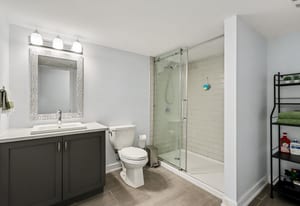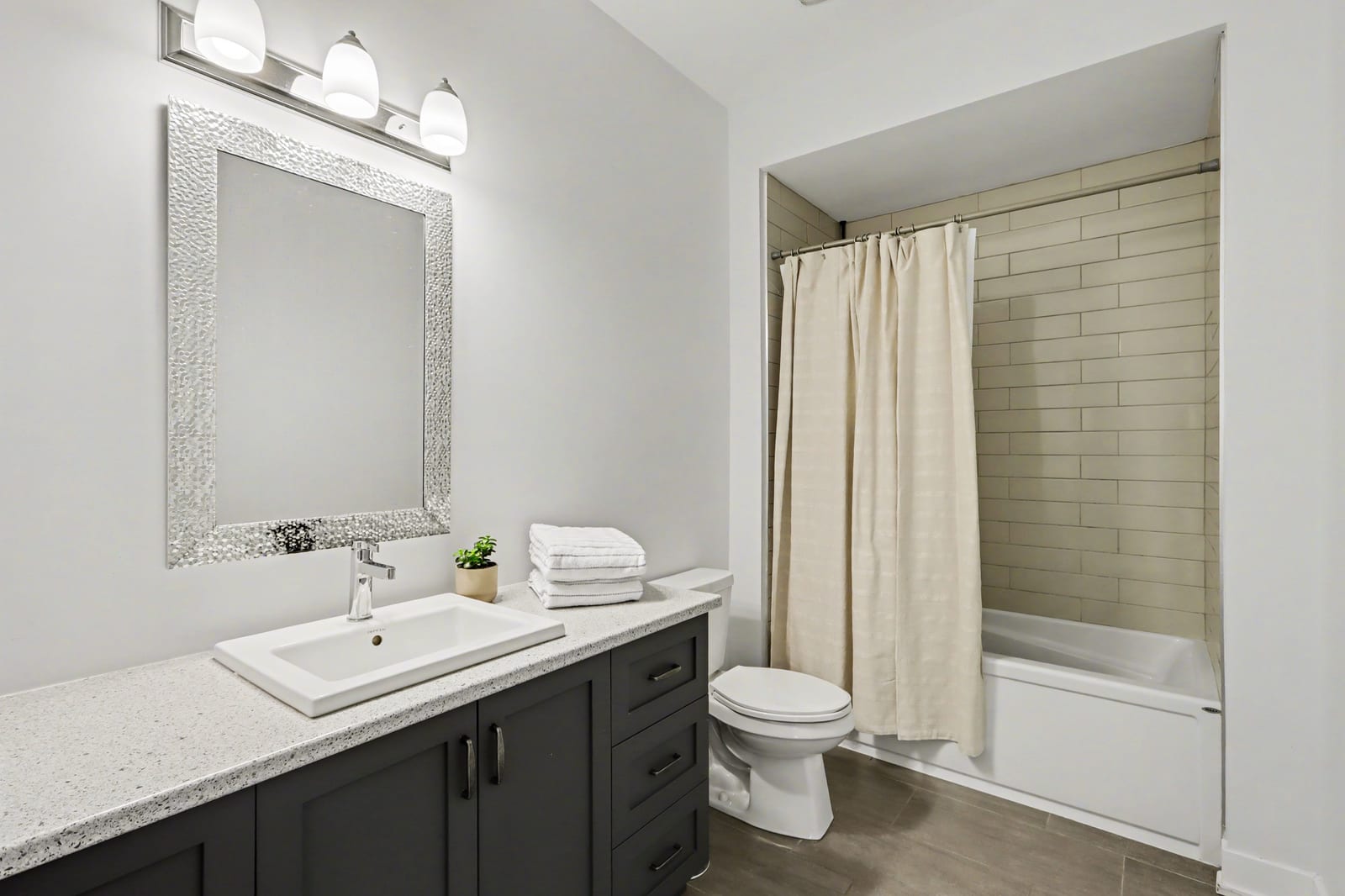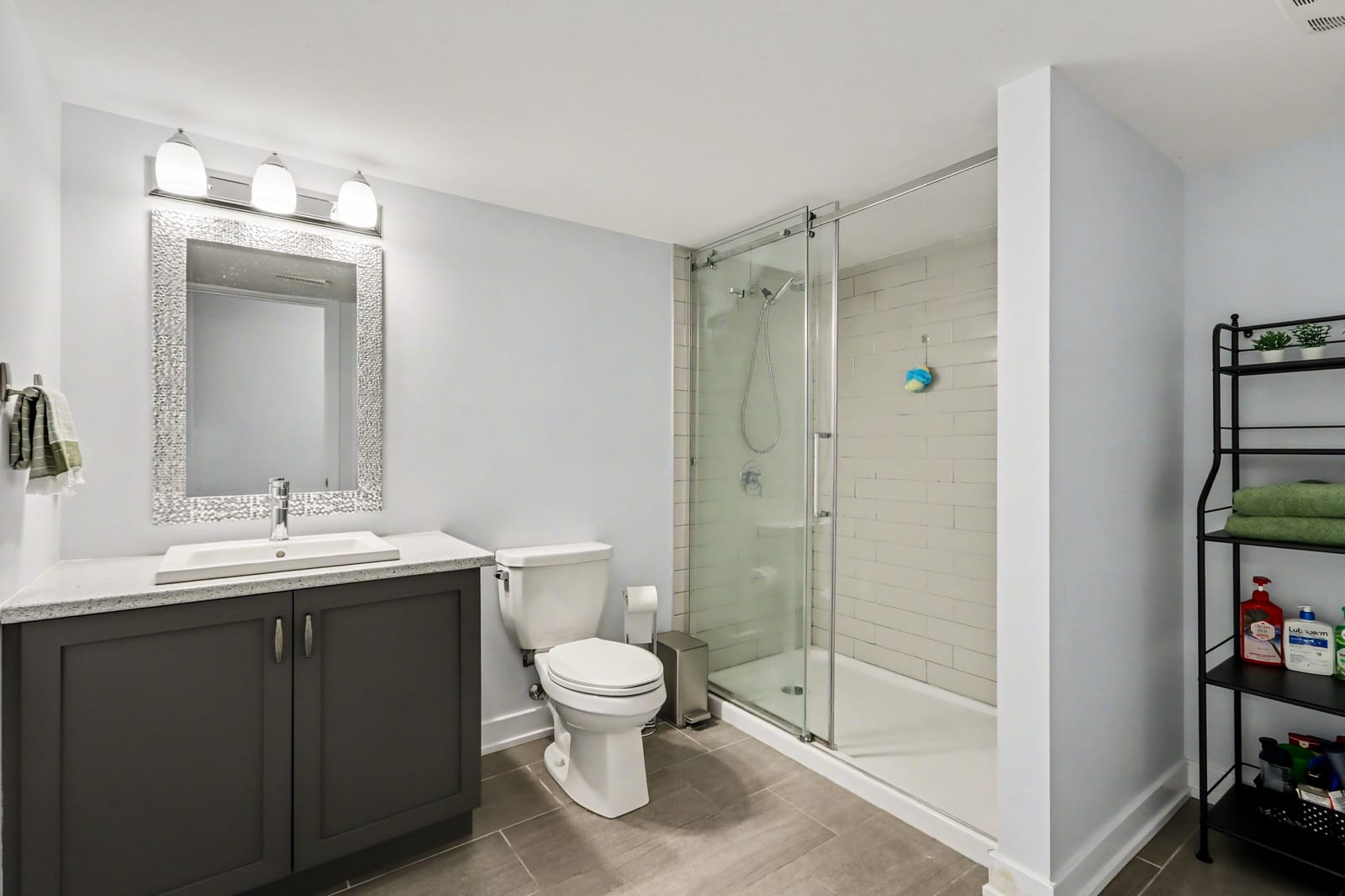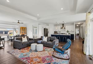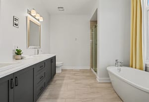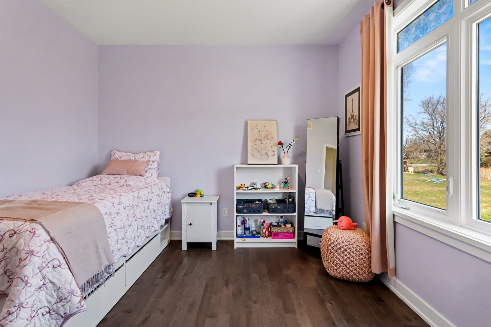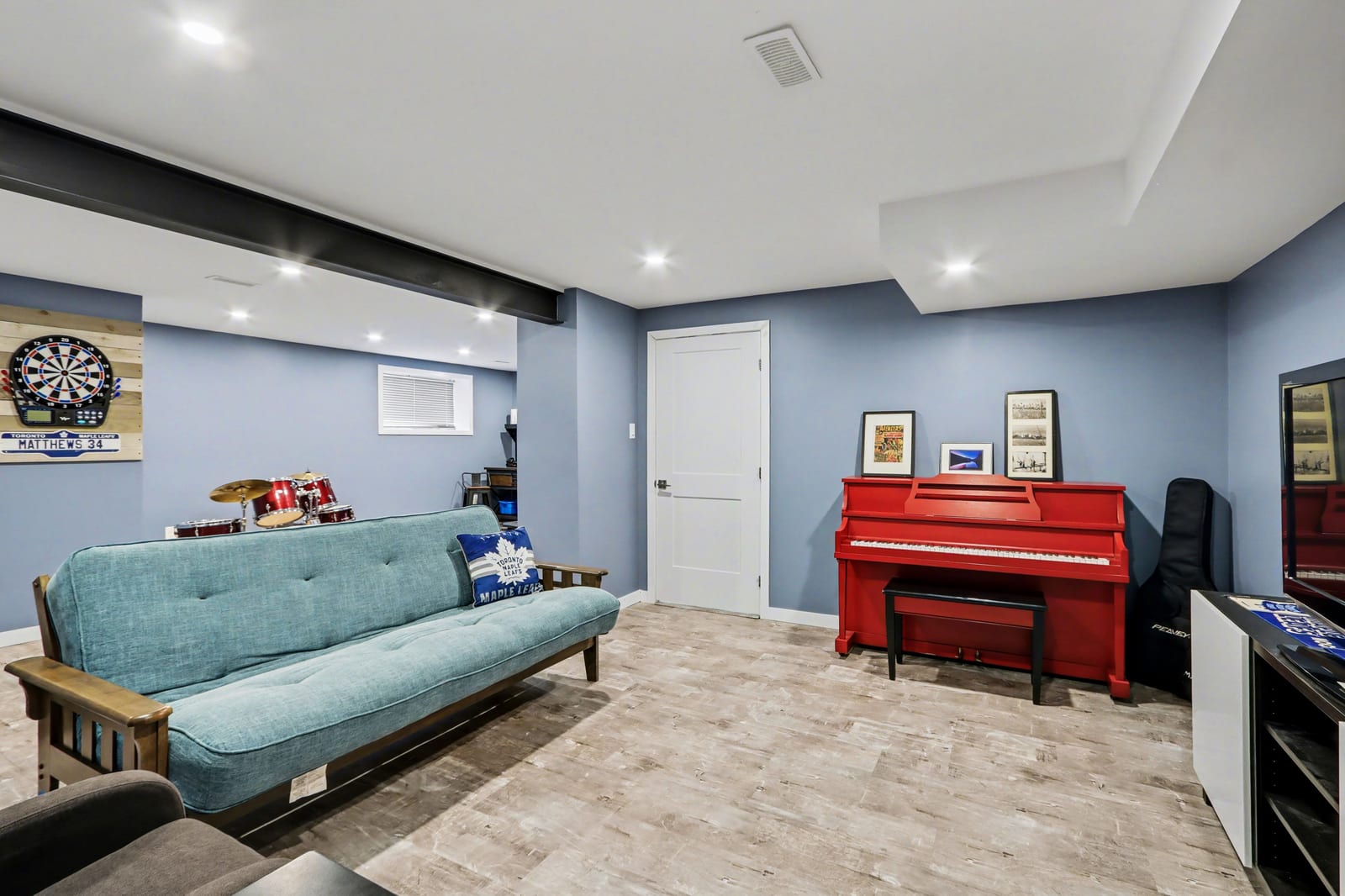 Enjoy elegant hardwood flooring throughout the main floor and impressive 9-foot smooth ceilings. The chef-inspired kitchen is an entertainer’s dream, featuring classic white cabinetry with navy lower cabinets, an oversized island, quartz countertops, tile backsplash, stainless steel appliances, and a gas stove. A walk-in pantry adds extra convenience, while the open-concept layout seamlessly connects the kitchen to the dining and living areas.