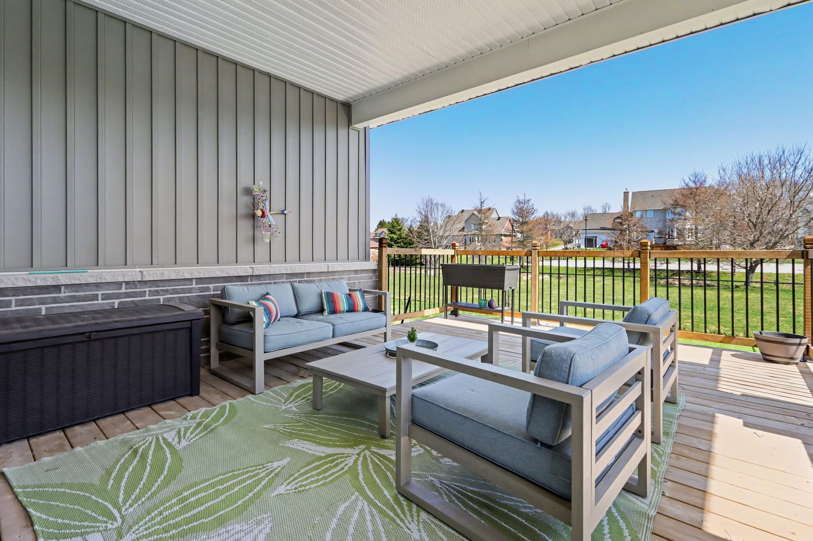 The fully fenced backyard offers privacy, mature landscaping, and a covered porch with a hot tub included for year-round ...