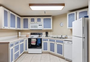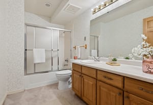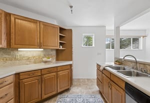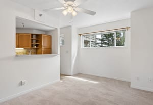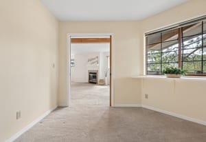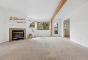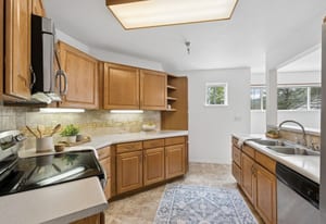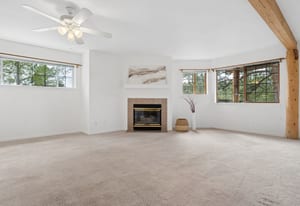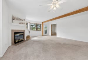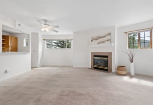 The open concept layout is both functional and inviting, with many windows that bring in lots of natural light and frame peaceful views of the surrounding grounds and mountains to the west. The kitchen flows seamlessly into living room area, complete with breakfast nook, creating an ideal space for everyday living and easy entertaining. A cozy gas fireplace anchors the space, adding warmth and charm.