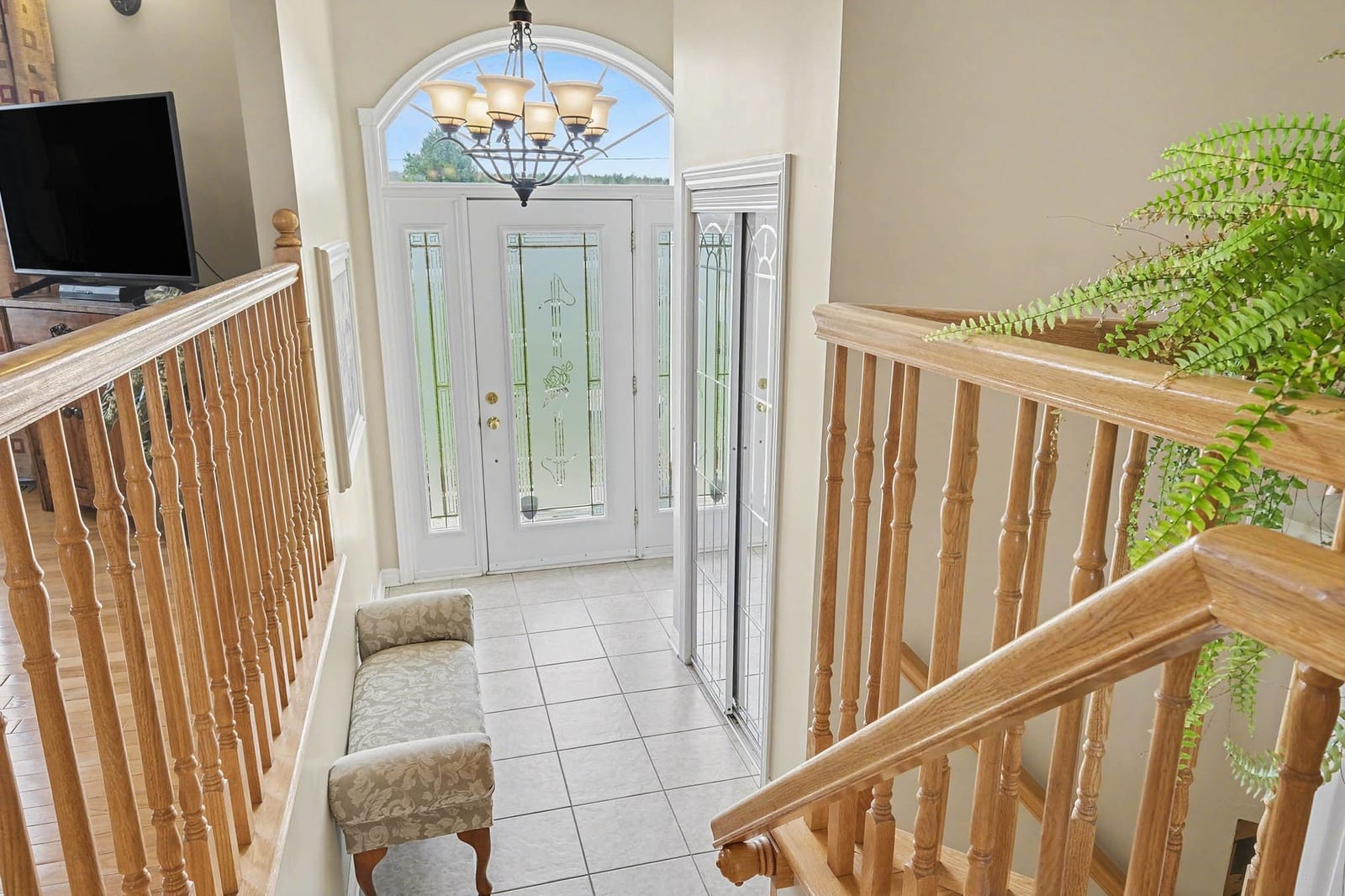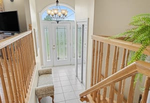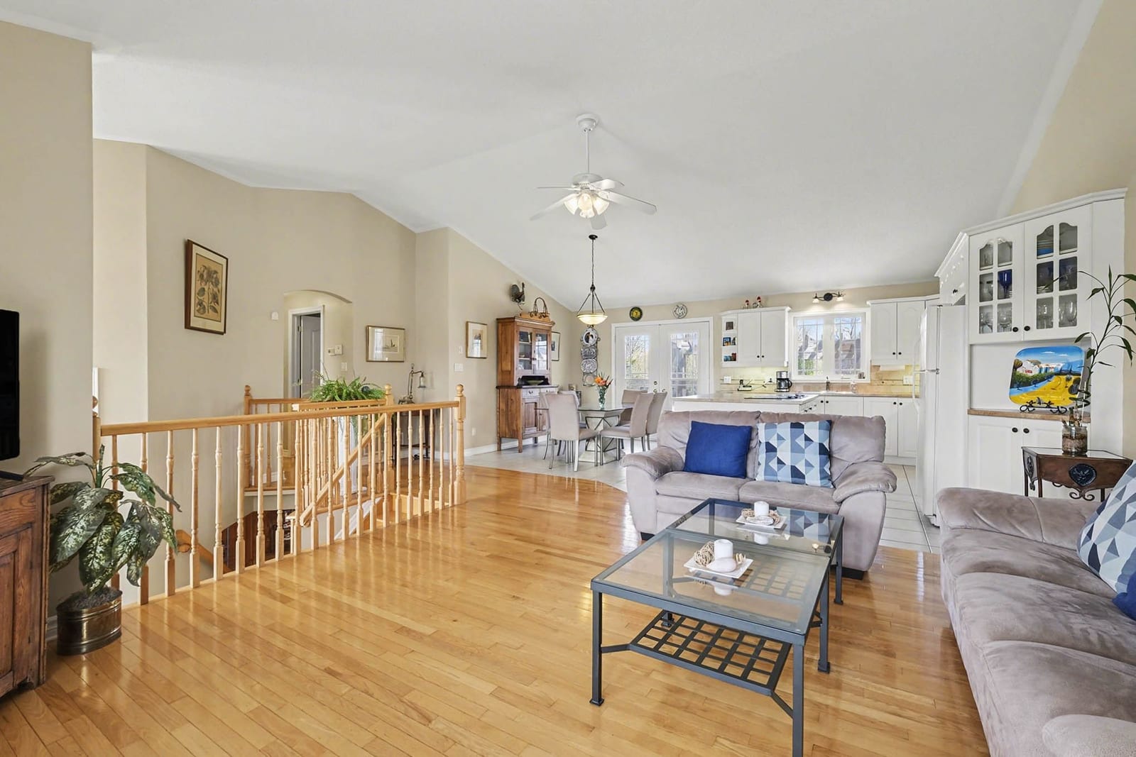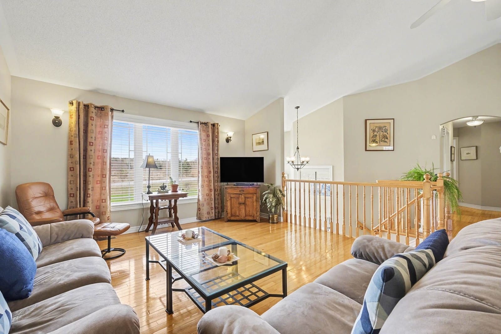 Inside, the bright front foyer creates an inviting first impression with tile flooring, a large arched transom window, sidelights, and a view into the split-level layout. The main living area is warm and spacious, featuring hardwood flooring, vaulted ceilings, large windows, and an open railing overlooking the entry below. The living room flows naturally into the dining area and kitchen, creating an ideal layout for everyday family living and entertaining.