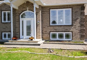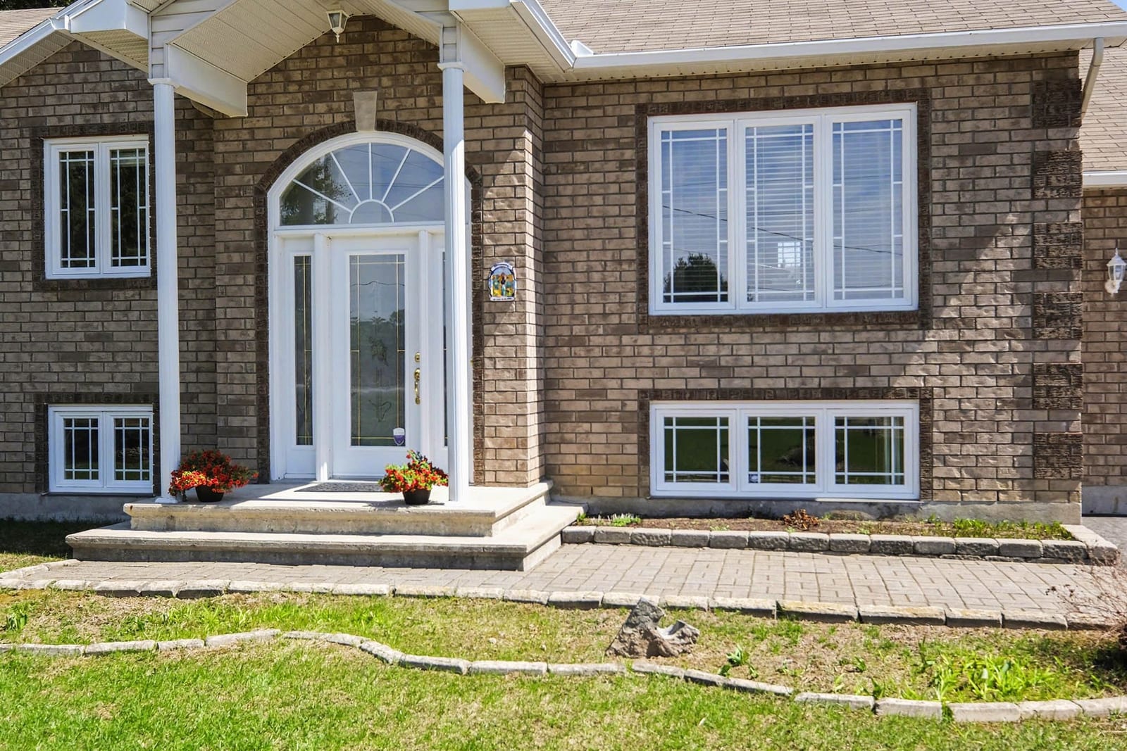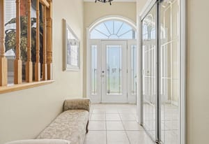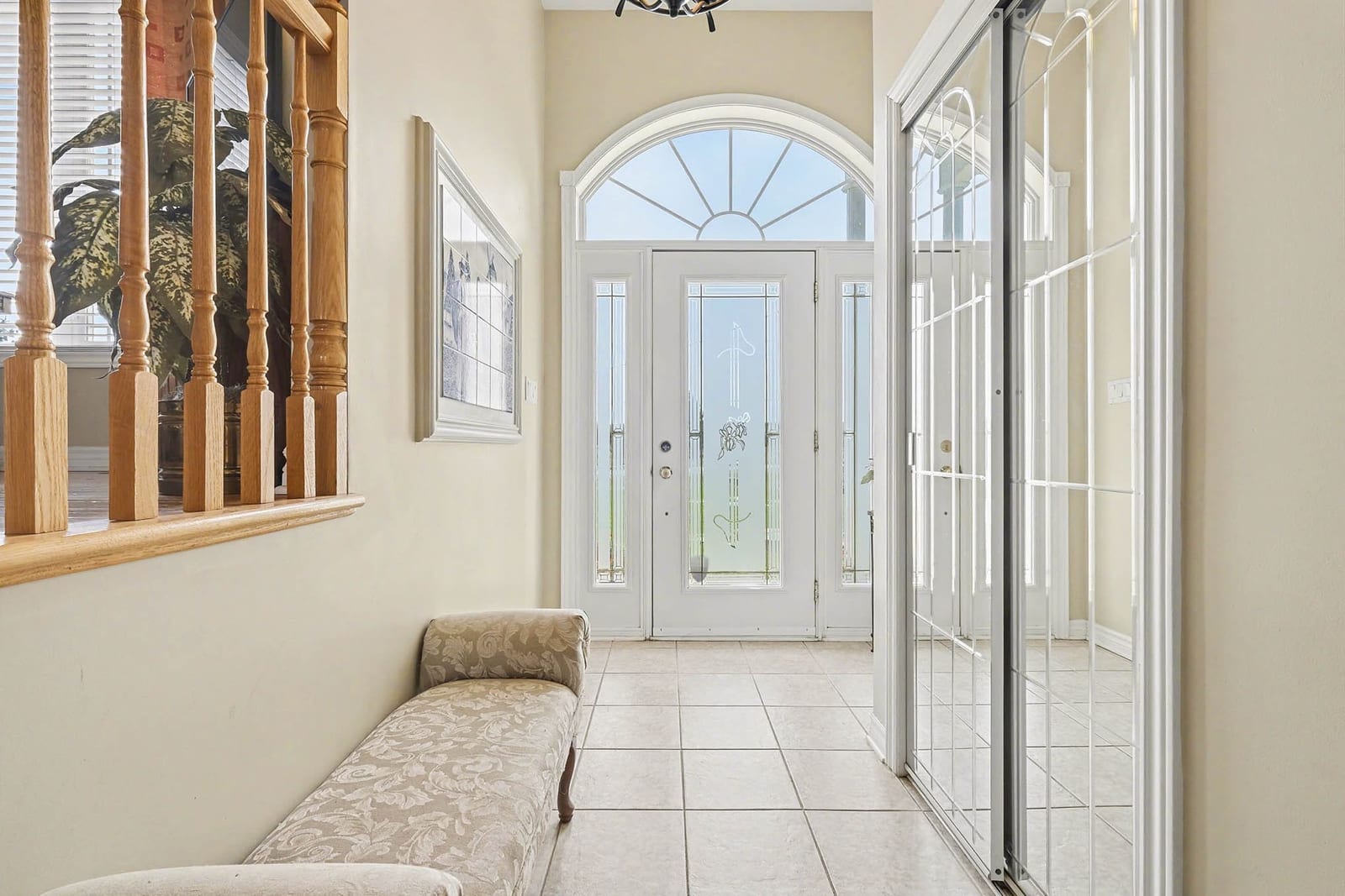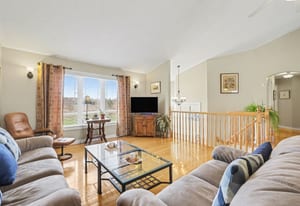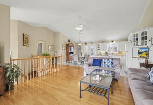 Inside, the bright front foyer creates an inviting first impression with tile flooring, a large arched transom window, sidelights, and a view into the split-level layout. The main living area is warm and spacious, featuring hardwood flooring, vaulted ceilings, large windows, and an open railing overlooking the entry below. The living room flows naturally into the dining area and kitchen, creating an ideal layout for everyday family living and entertaining.