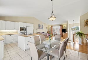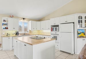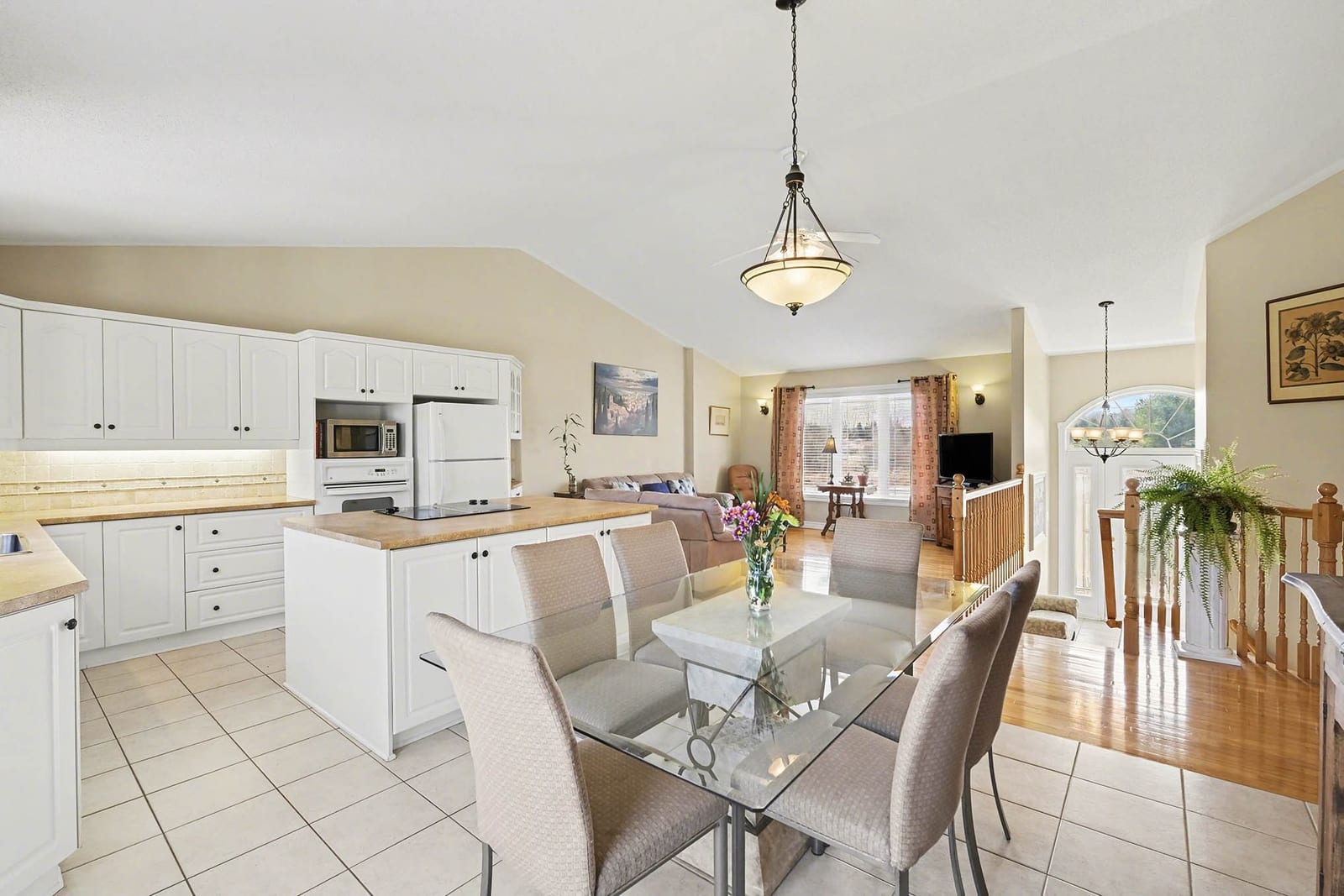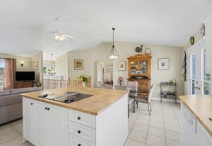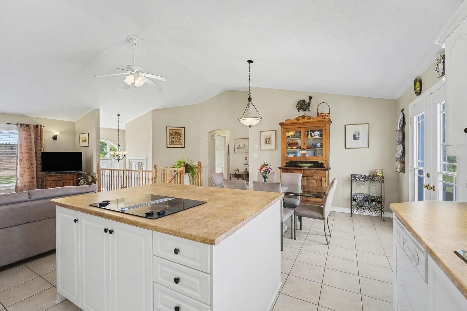 The kitchen offers excellent cabinet and counter space, a large centre island with cooktop, built-in oven and microwave, tile flooring, and a bright open connection to both the dining area and living room. Patio doors off the dining area provide direct access to the rear deck, making outdoor dining and summer entertaining easy and convenient.