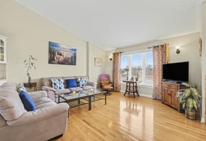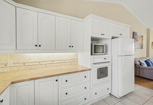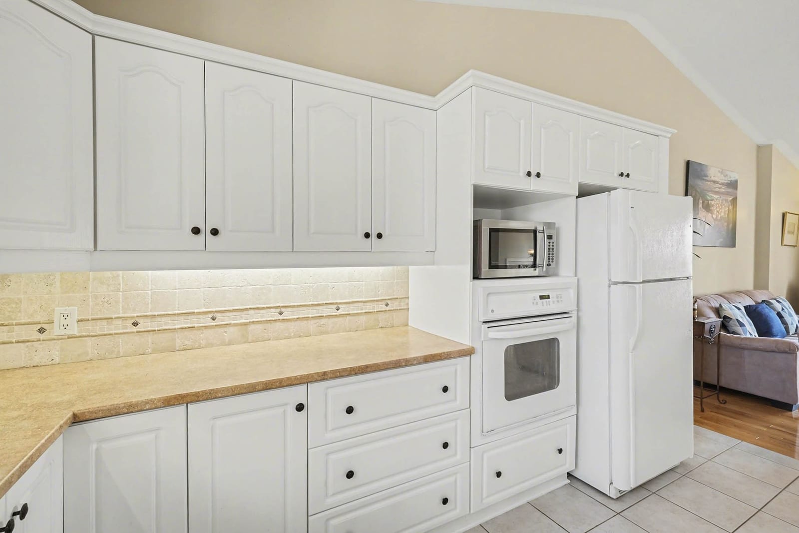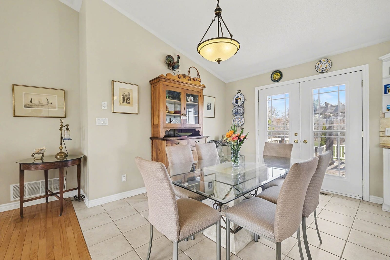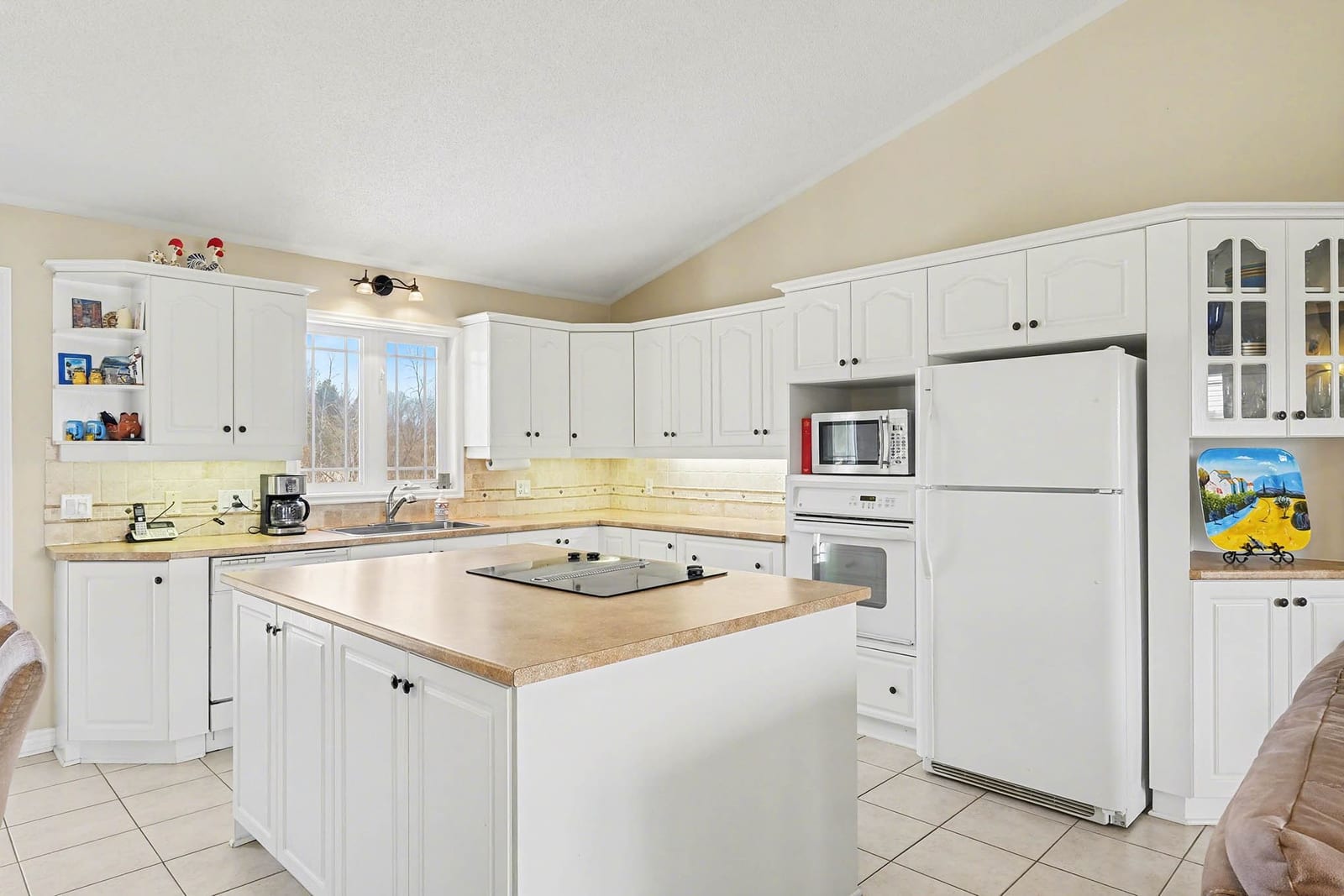 The kitchen offers excellent cabinet and counter space, a large centre island with cooktop, built-in oven and microwave, tile flooring, and a bright open connection to both the dining area and living room. Patio doors off the dining area provide direct access to the rear deck, making outdoor dining and summer entertaining easy and convenient.