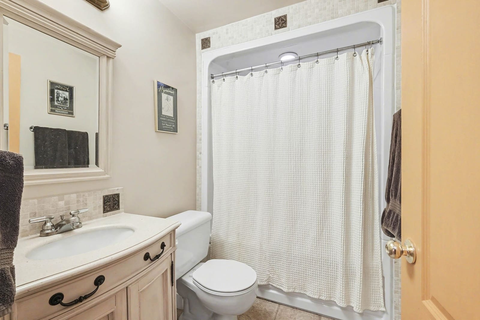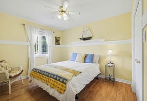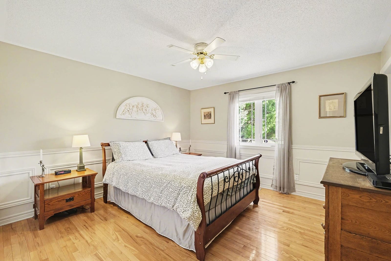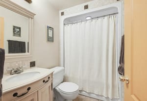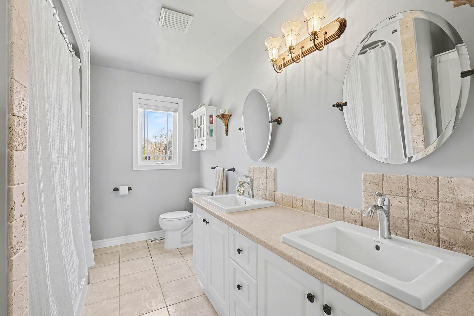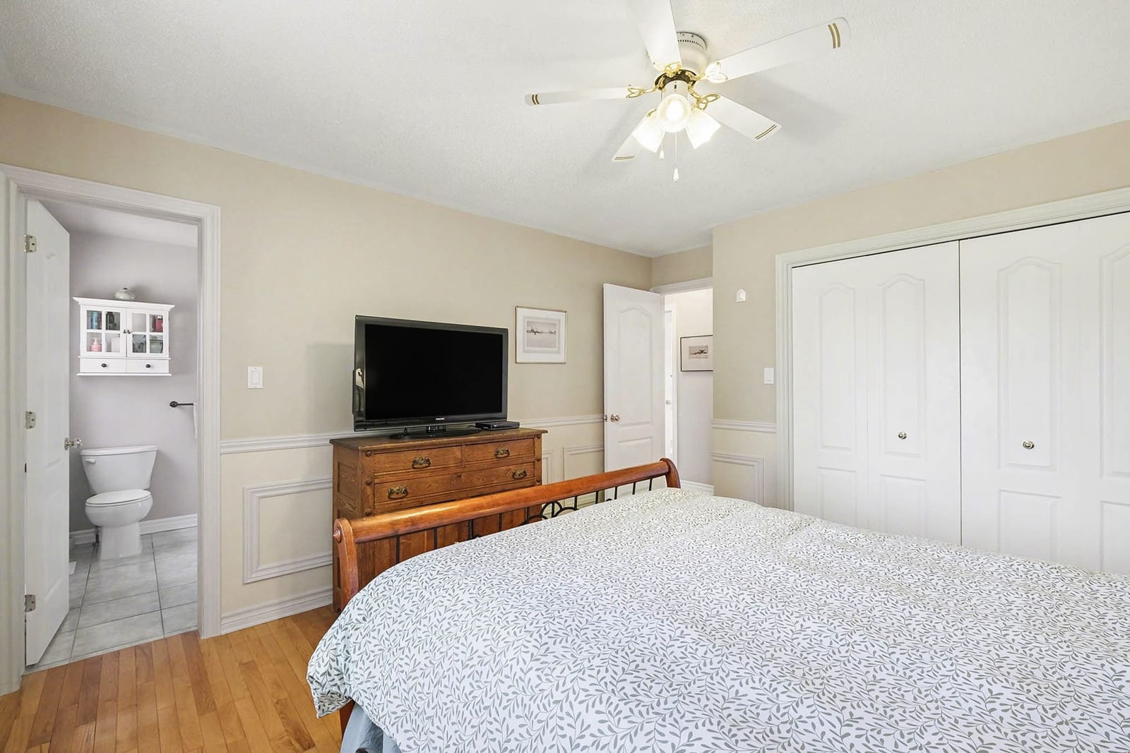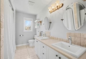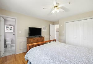 The main level includes three bedrooms, including the primary bedroom with cheater access to the full bathroom. Each bedroom features hardwood flooring and good natural light, while the main bathroom offers a spacious layout with dual sinks, tile flooring, and a tub/shower combination.