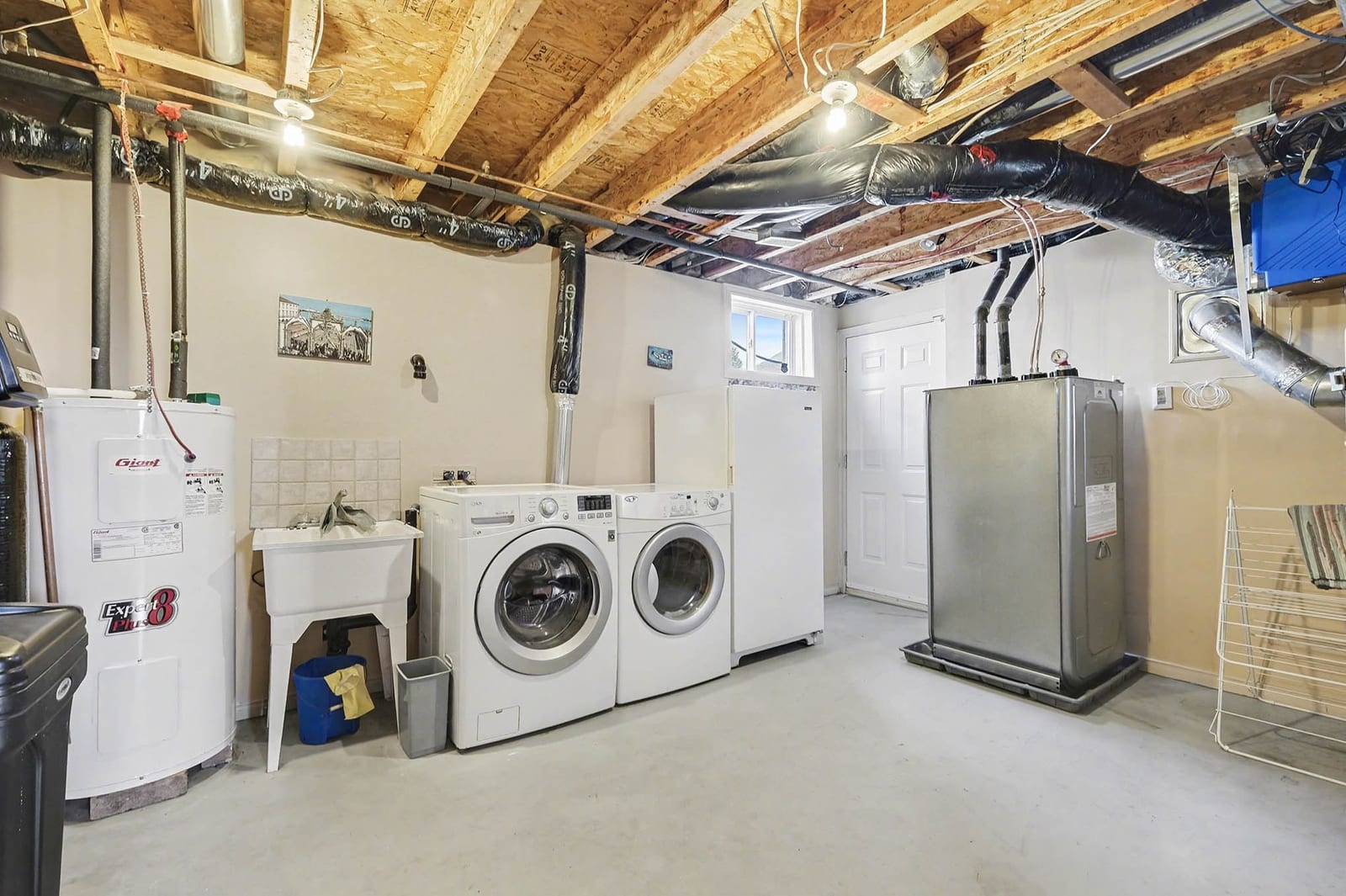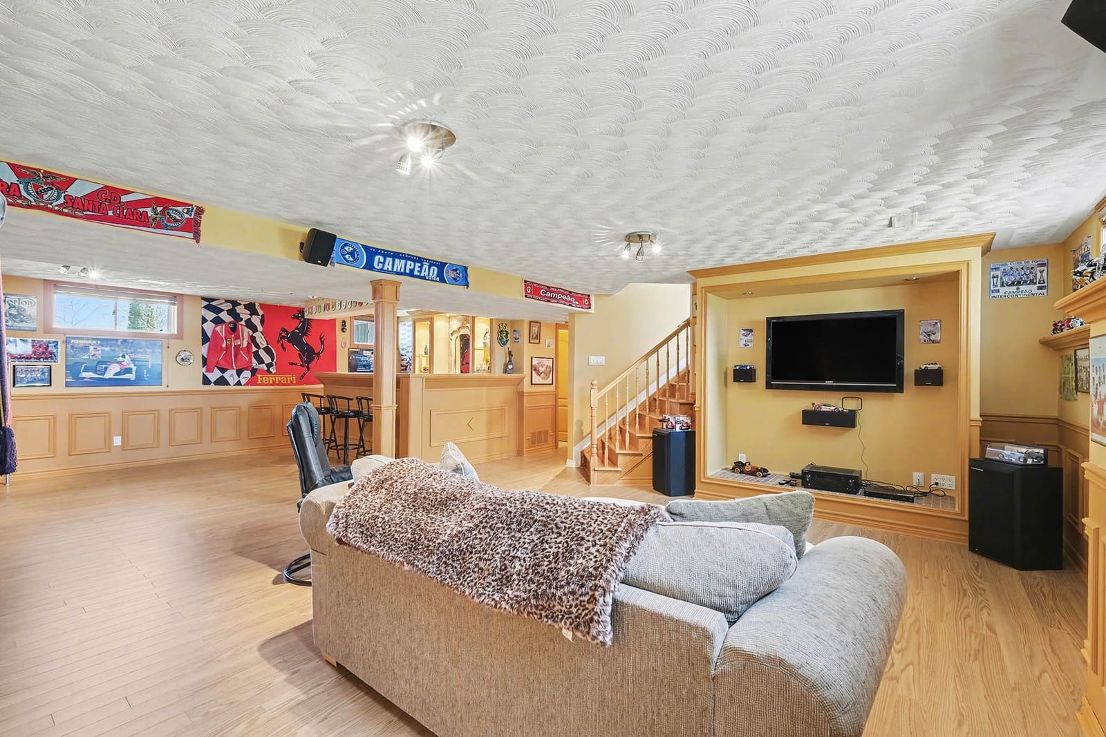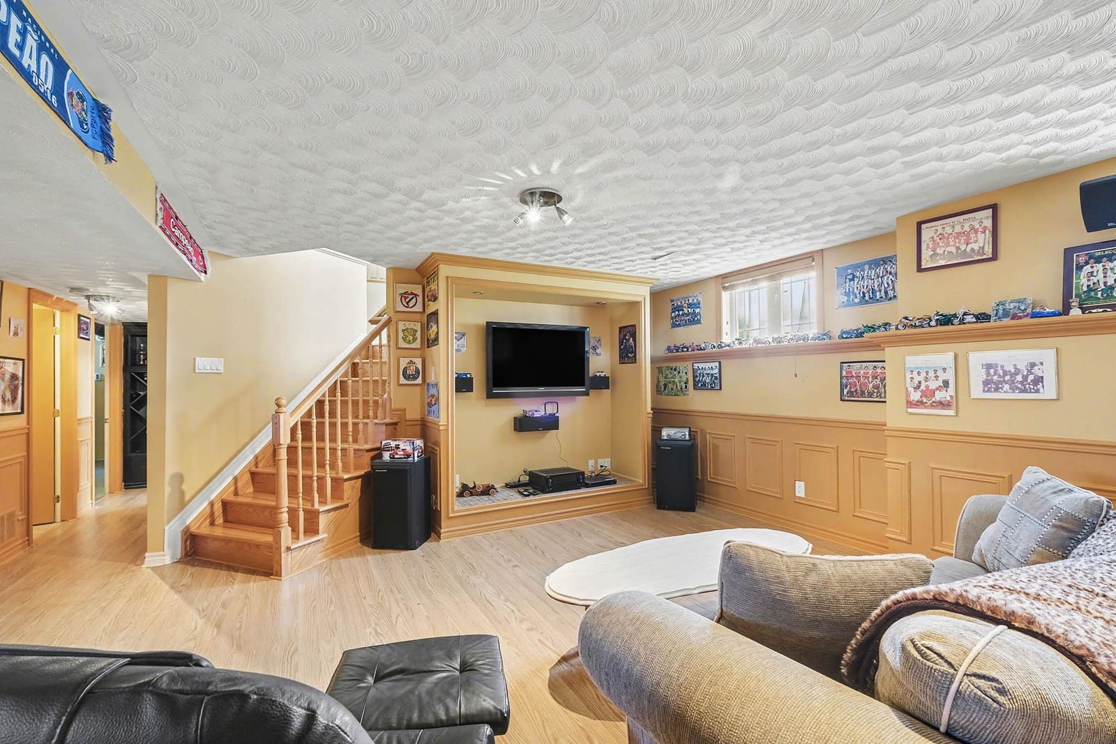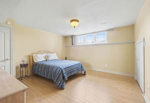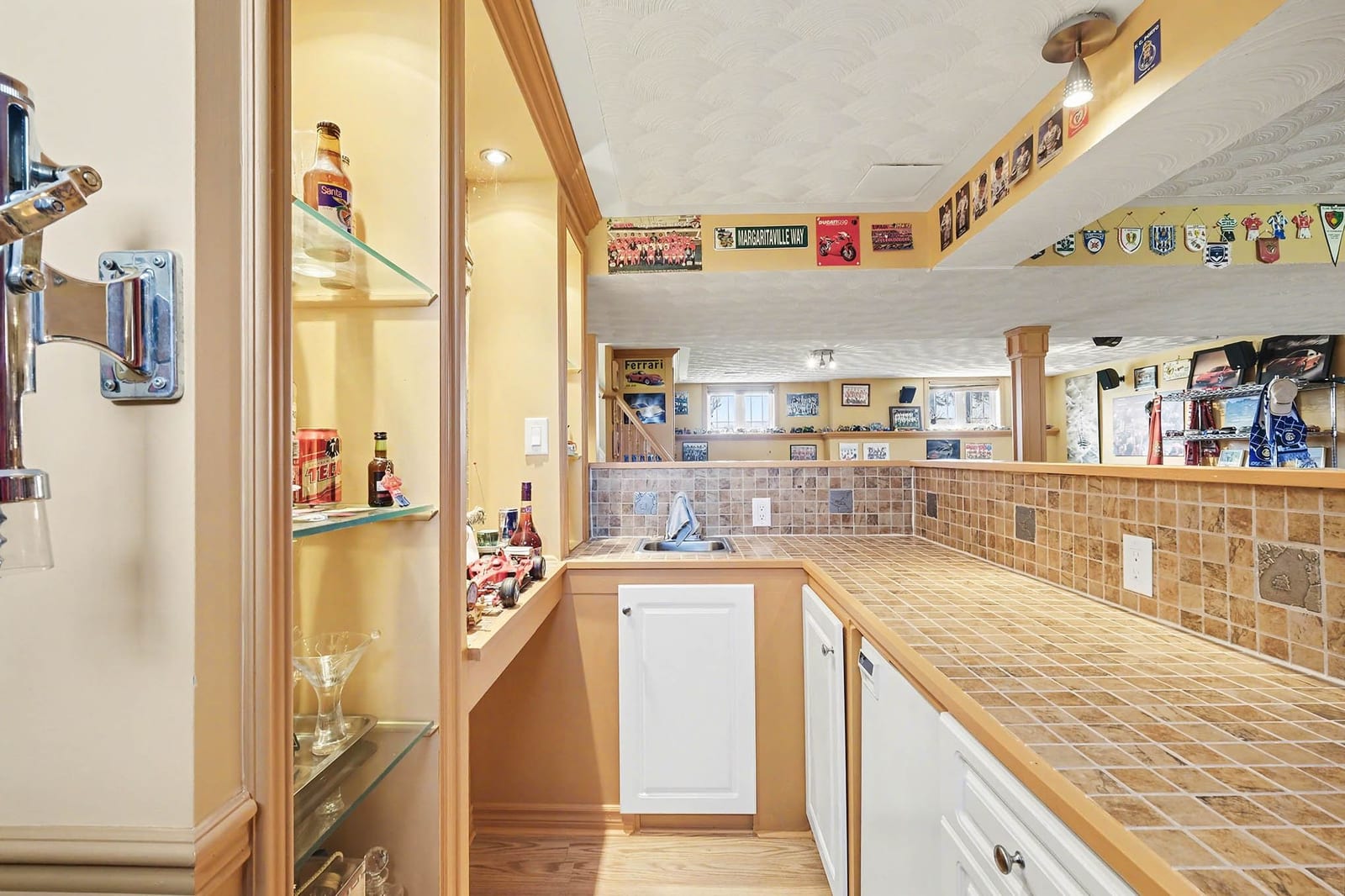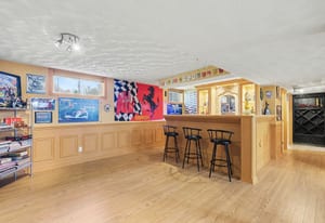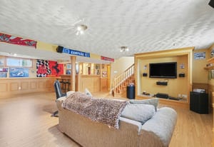 The lower level adds tremendous living space and flexibility. A large recreation room provides an inviting place to relax, watch movies, host guests, or create a games area. The custom bar area adds character and makes this level ideal for entertaining, complete with bar seating, display shelving, tile counters, and additional storage. A fourth bedroom and full bathroom provide excellent space for overnight guests, teenagers, extended family, or a private home office setup. The lower level also includes a generous laundry and utility room with direct walkout access to the attached garage, adding everyday convenience and practical functionality.